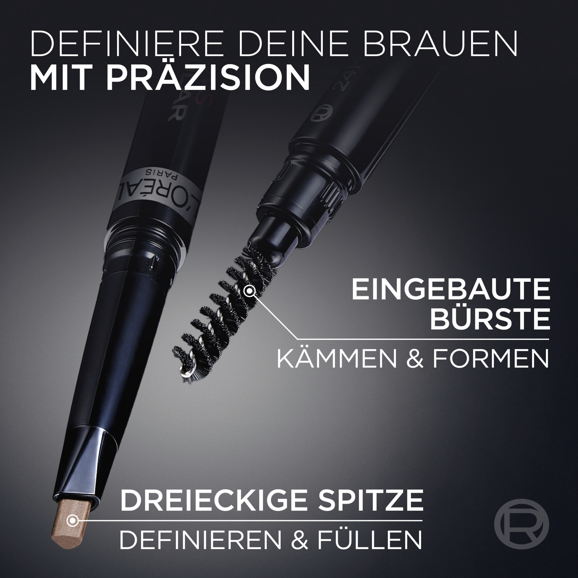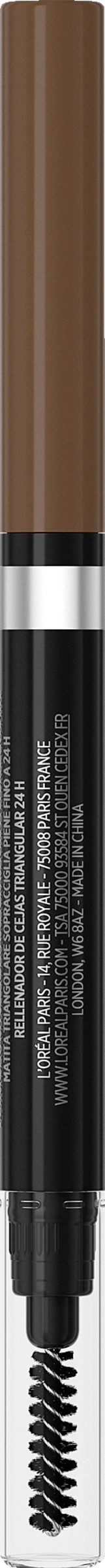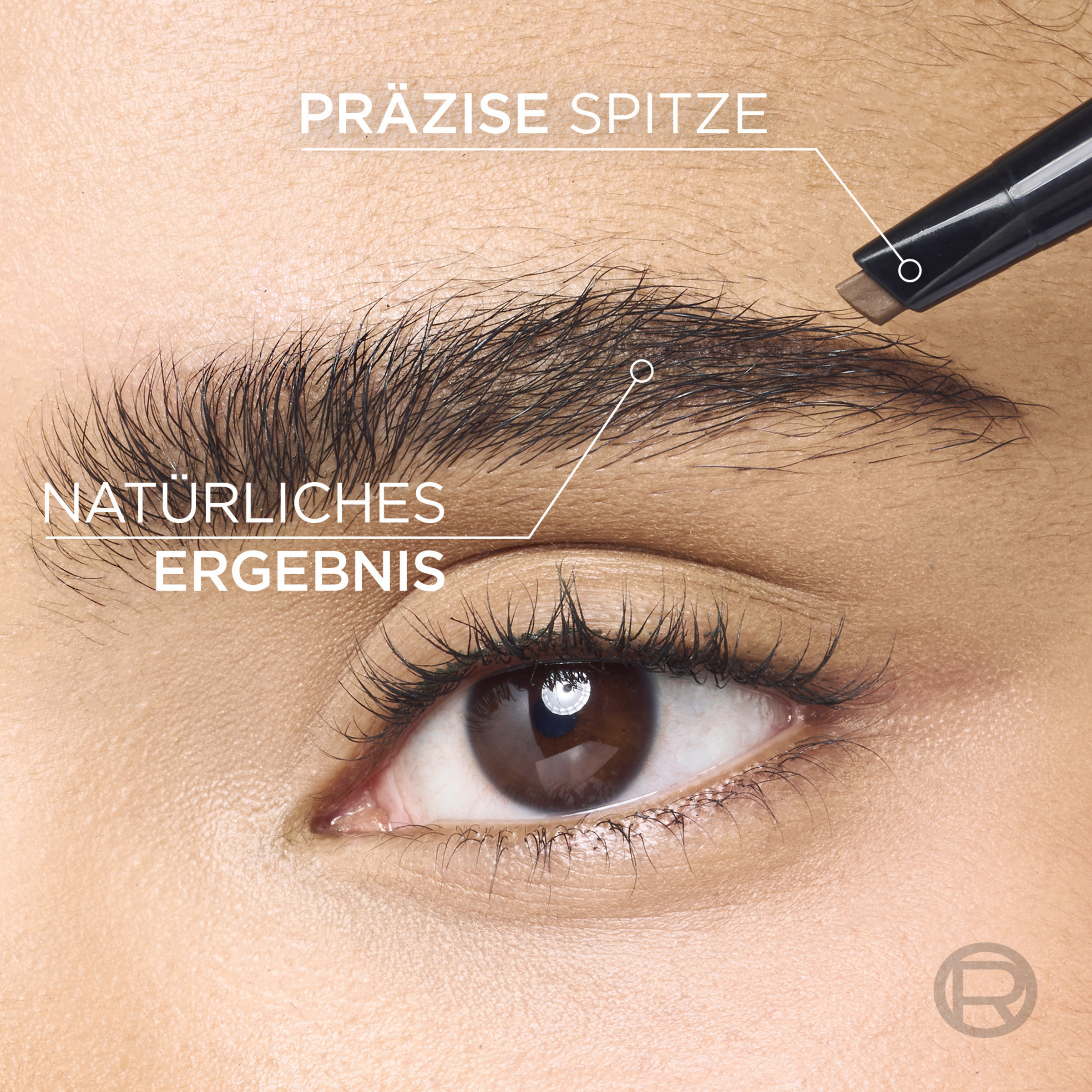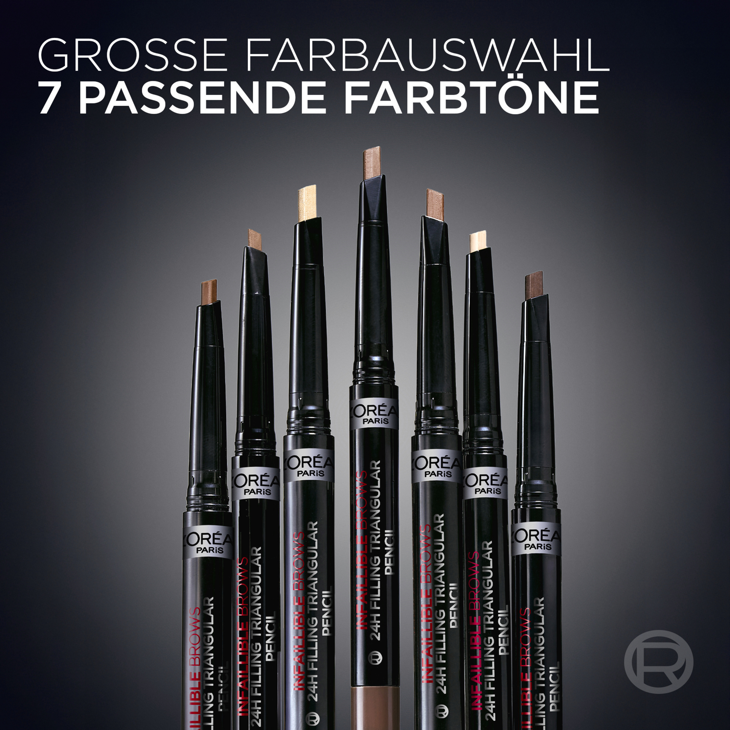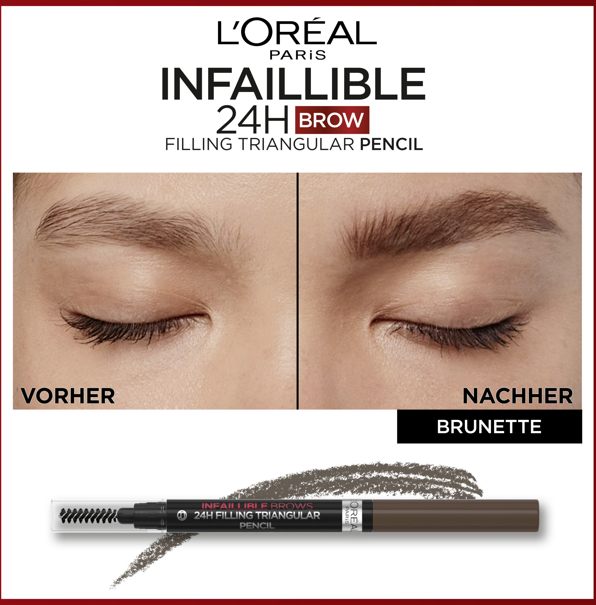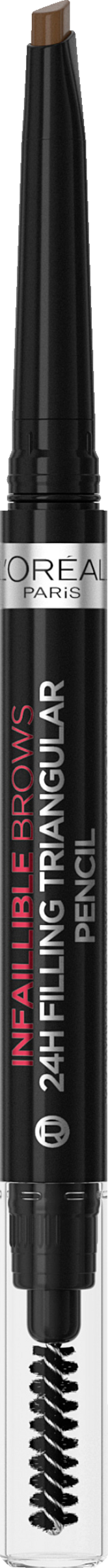 Infaillible Brows 24h Filling Triangular Pencil fra L'Oréal Paris sikrer udtryksfulde bryn hele dagen, hver dag. Den blide trekantede spids fylder brynene visuelt for en naturlig Finish med op til 24 timers hold. Den twist-out spids af browlineren gør, at brynet kan fyldes ud og tydeligt defineres takket være den firkantede spids. Teksturen er særlig let og kan fordeles jævnt.