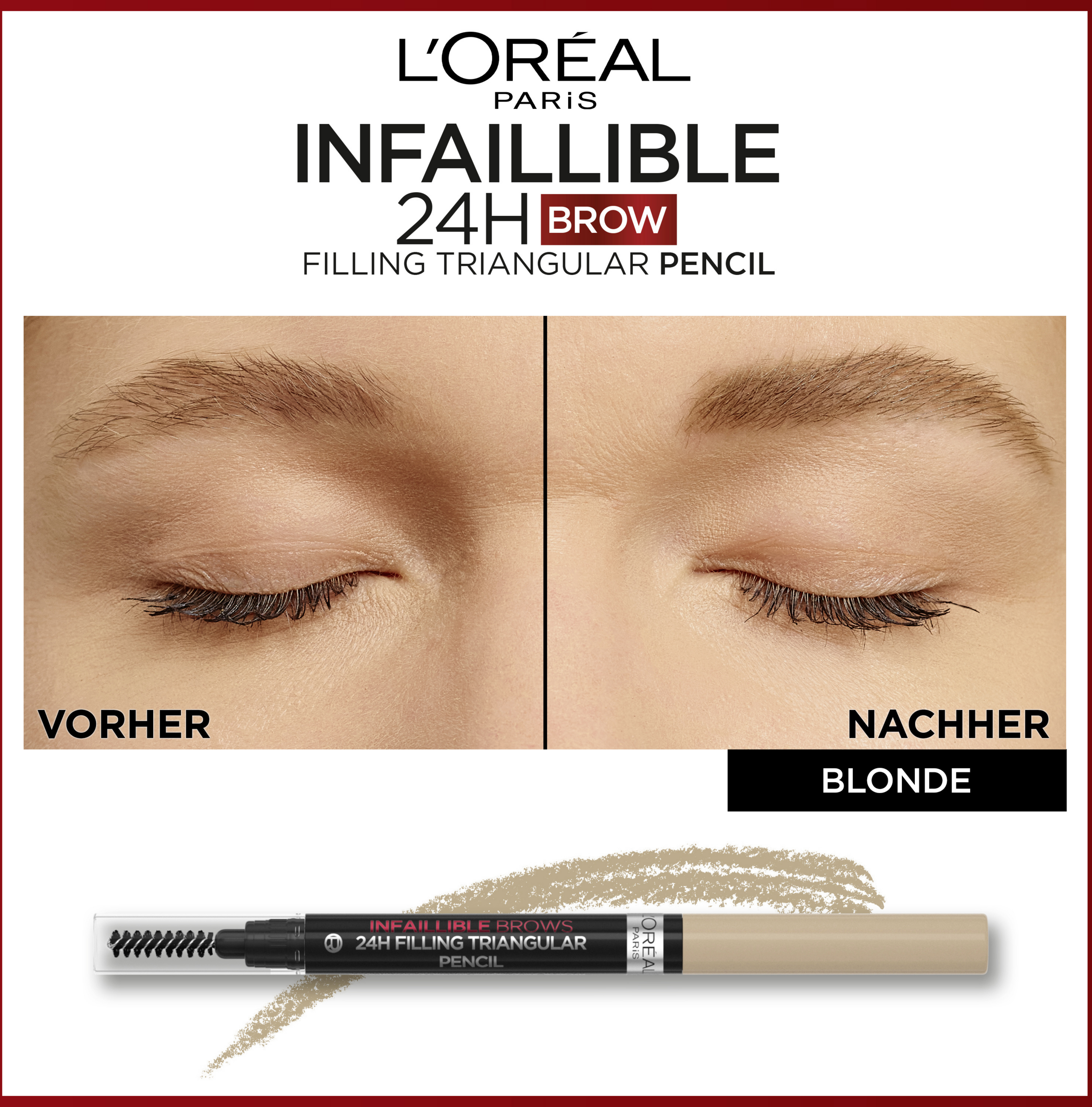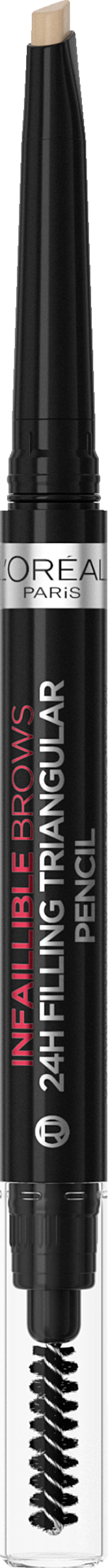 Infaillible Brows 24h Filling Triangular Pencil fra L'Oréal Paris sikrer udtryksfulde bryn hele dagen, hver dag. Den blide trekantede spids fylder brynene visuelt for en naturlig Finish med op til 24 timers hold. Den twist-out spids af browlineren gør, at brynet kan fyldes ud og tydeligt defineres takket være den firkantede spids. Teksturen er særlig let og kan fordeles jævnt.