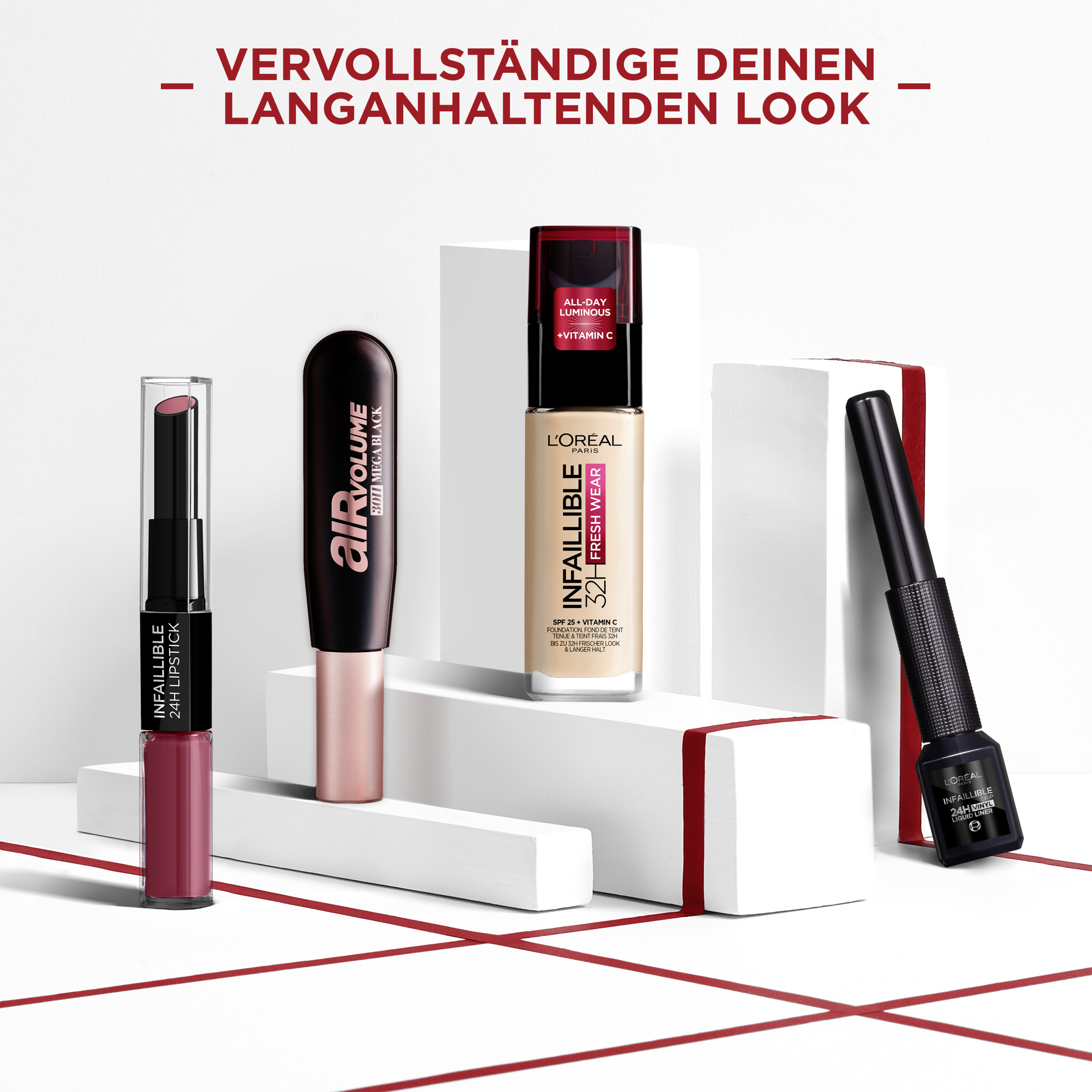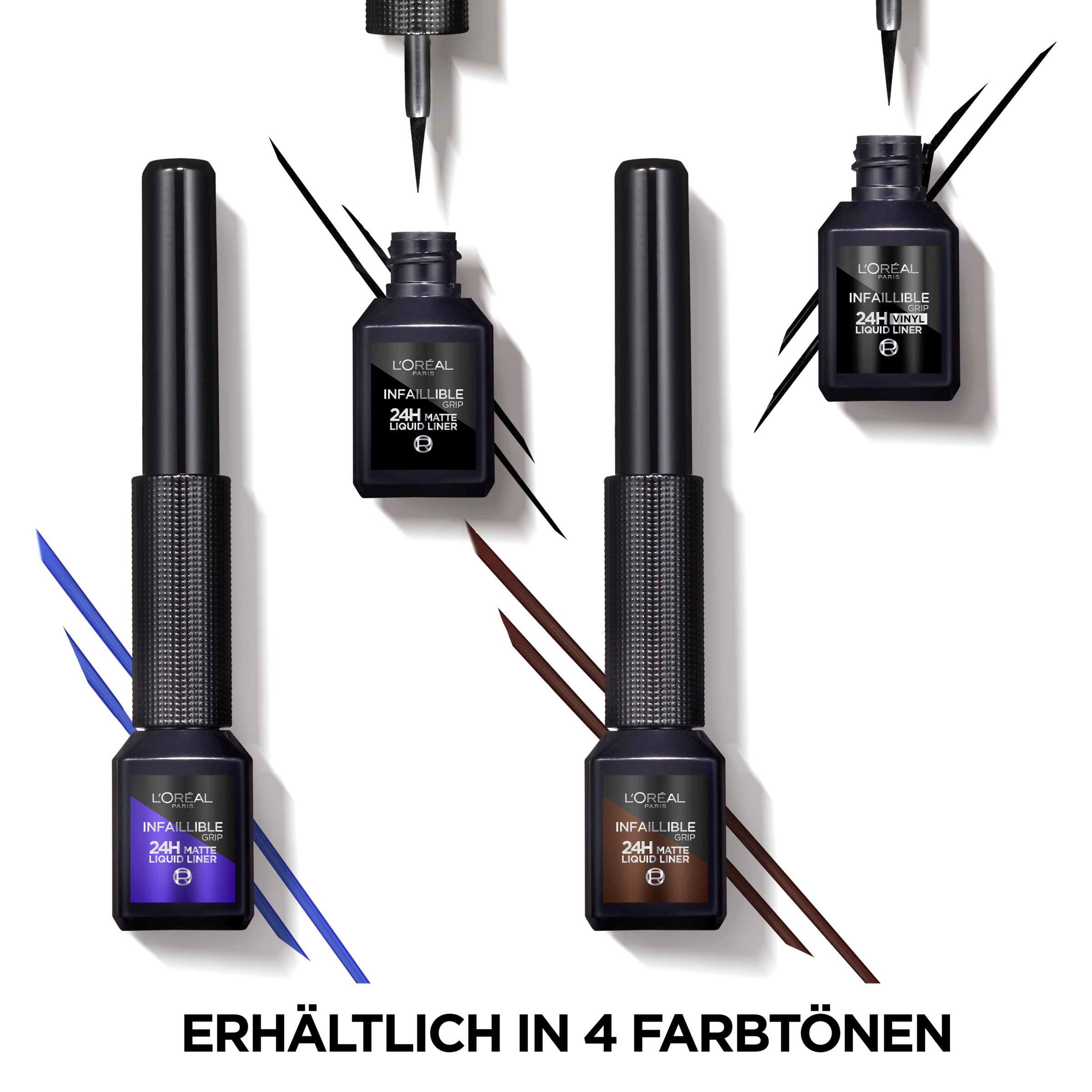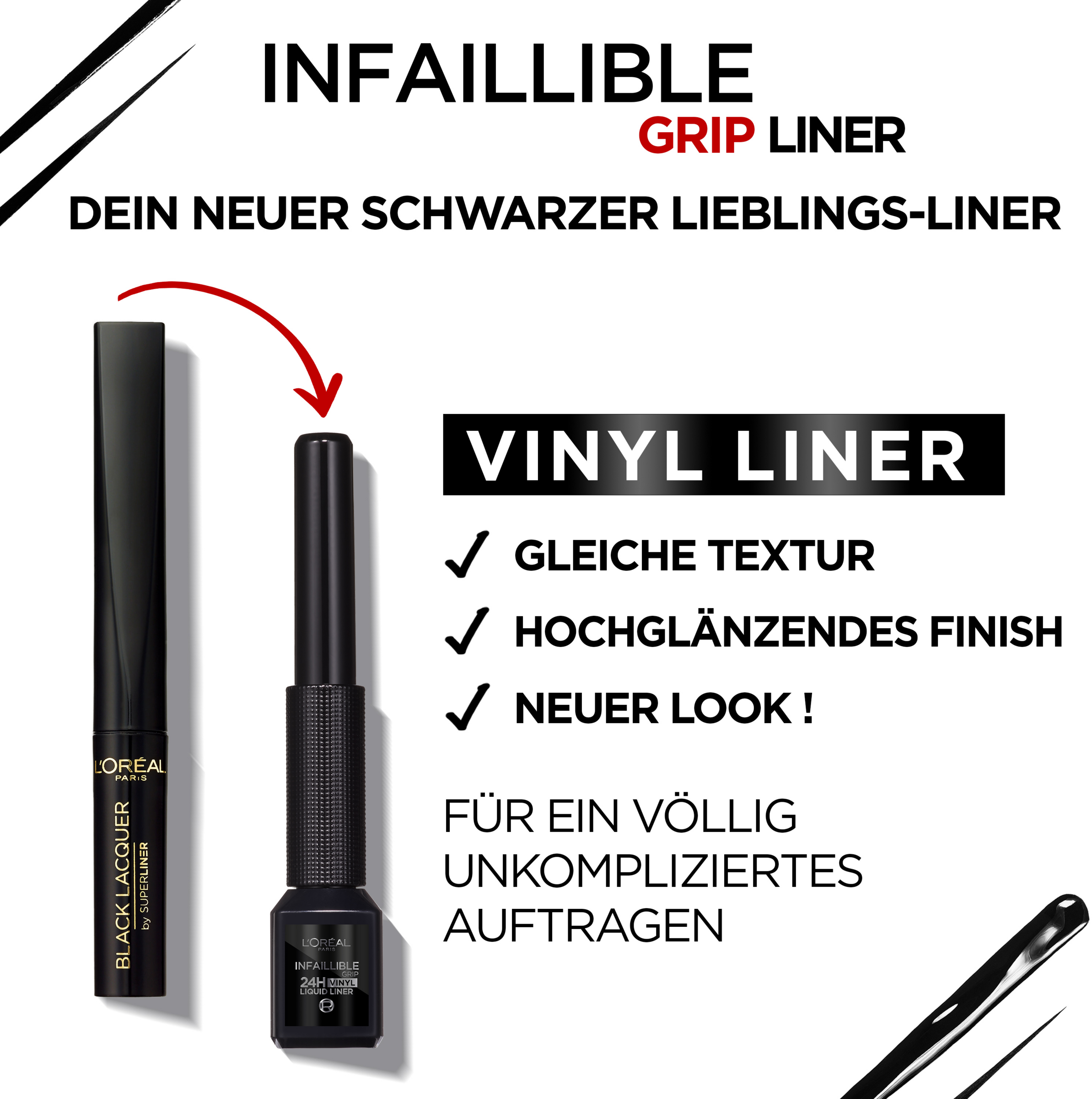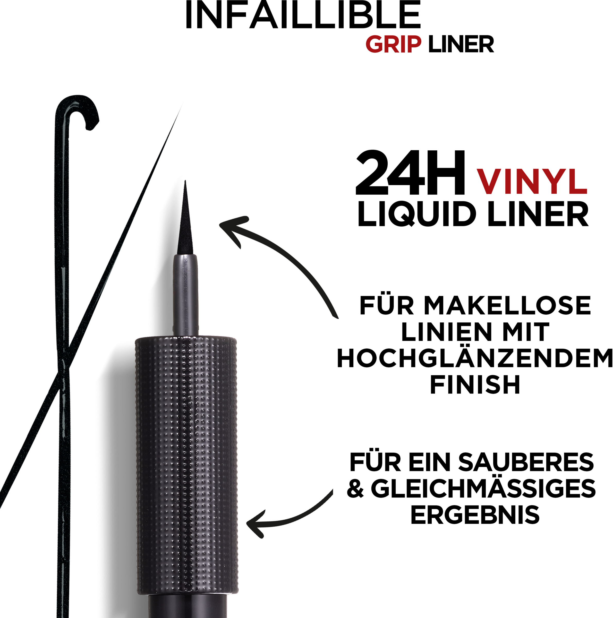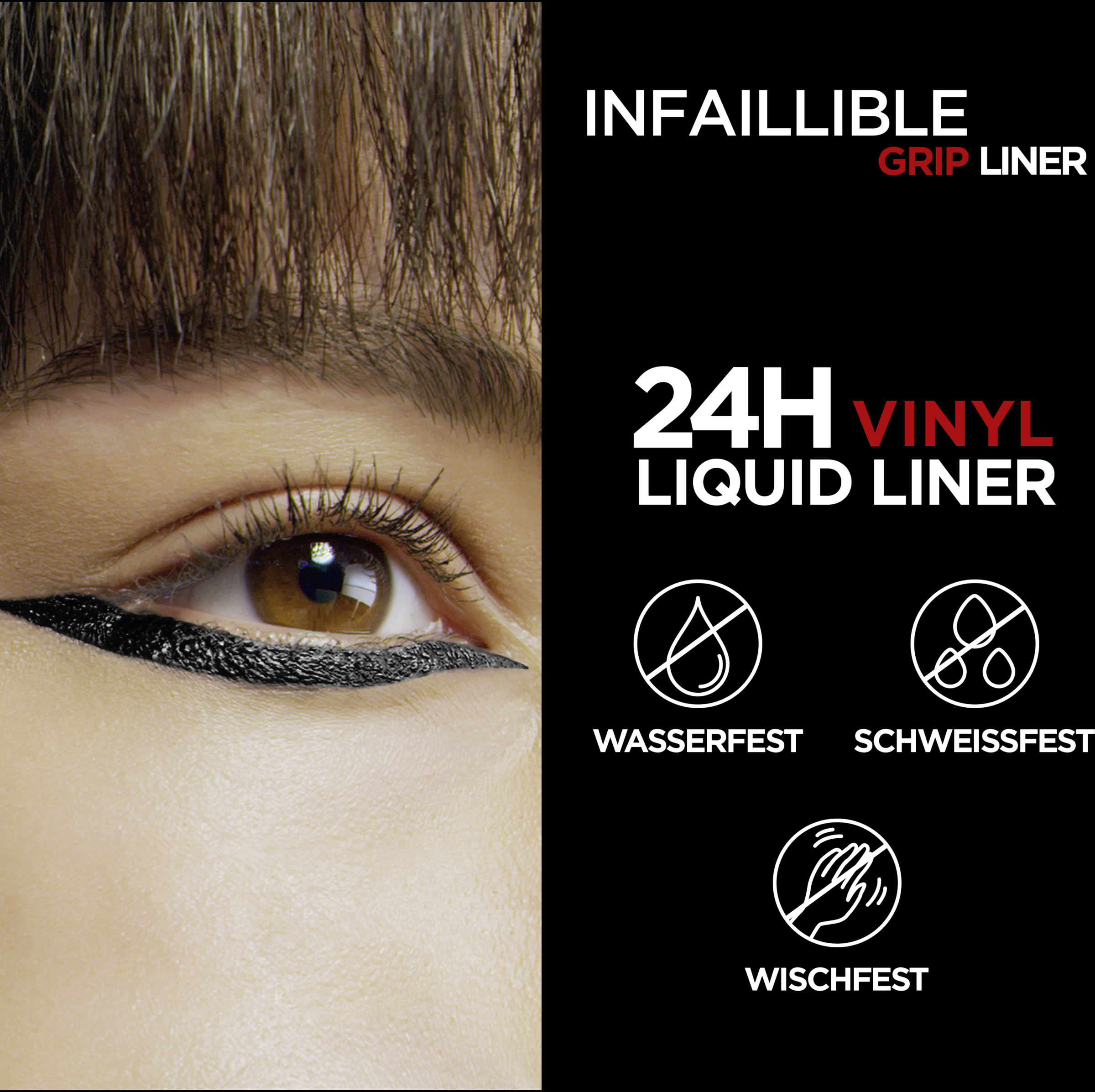 Infaillible Grip 24h Vinyl Liquid Eyeliner fra L'Oréal Paris sikrer fejlfrie linjer med en højglans Finish. Det er hurtigt og nemt at påføre den flydende formel med den bløde og fleksible applikator. Uanset om du ønsker en fin linje eller en meningsfuld eyeliner - med Infaillible Grip 24h Vinyl Liquid Eyeliner er den ønskede eyeliner fuldstændig ukompliceret. Uden udtværing og med et vandtæt hold bevarer den sorte Eyeliner sin farveintensitet i op til 24 timer.