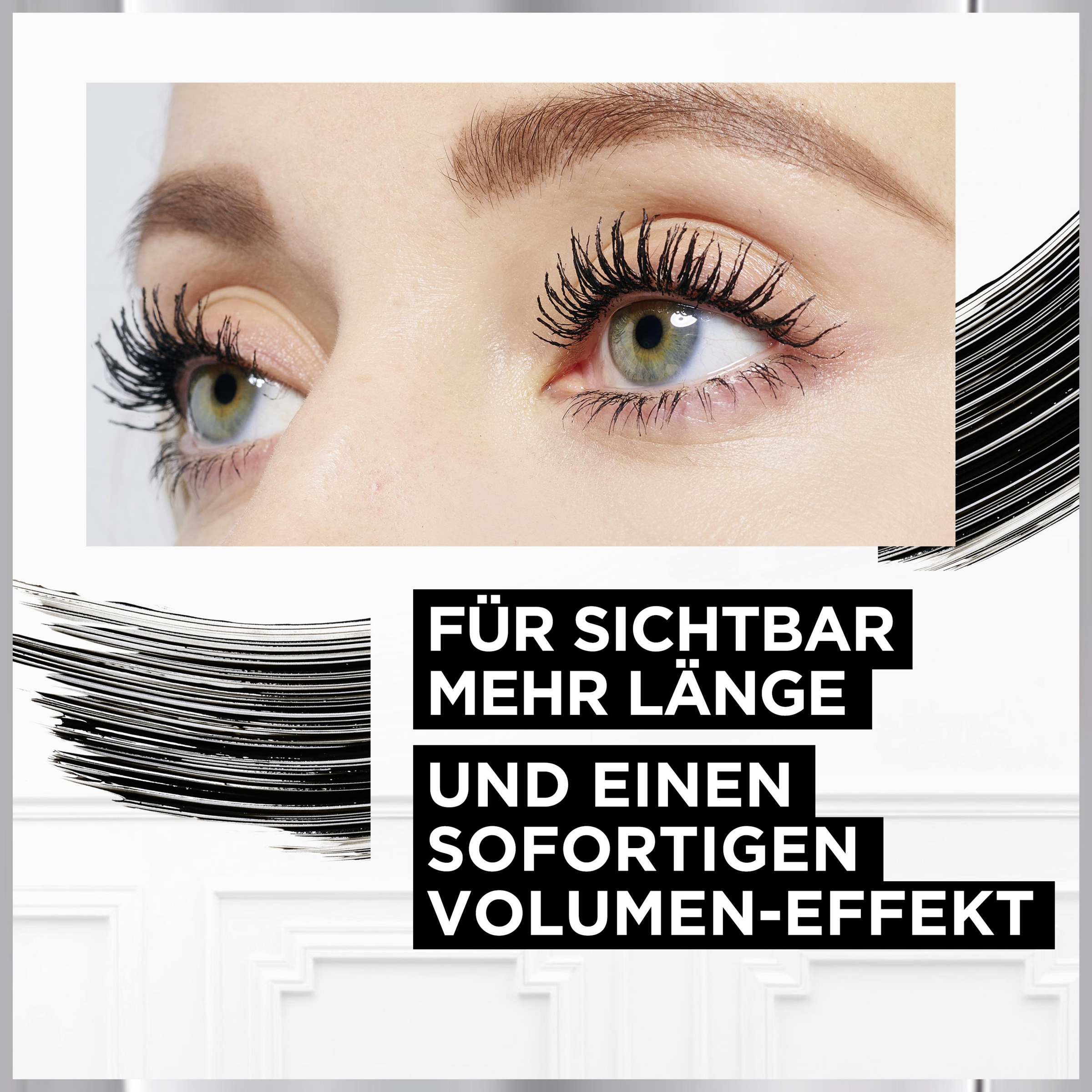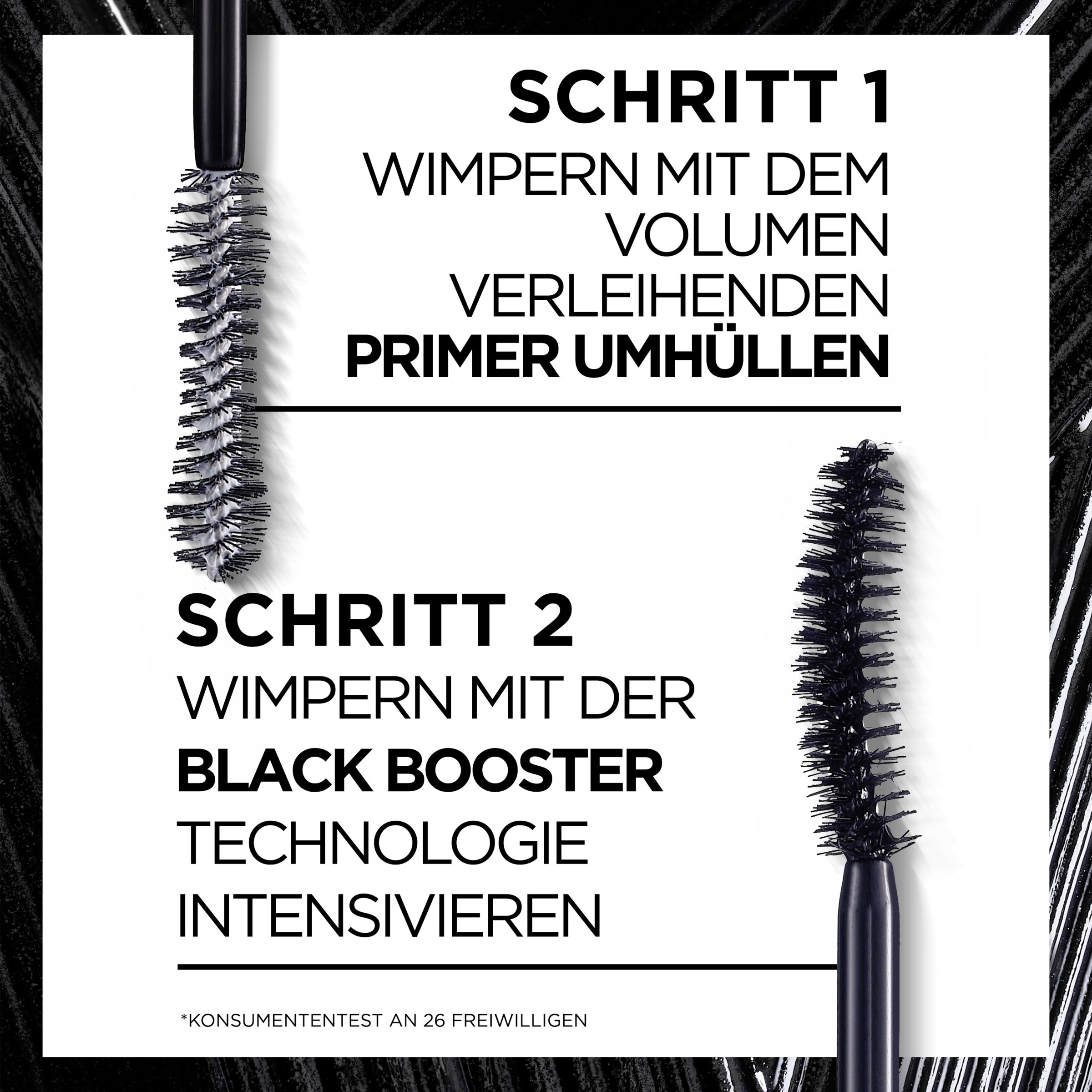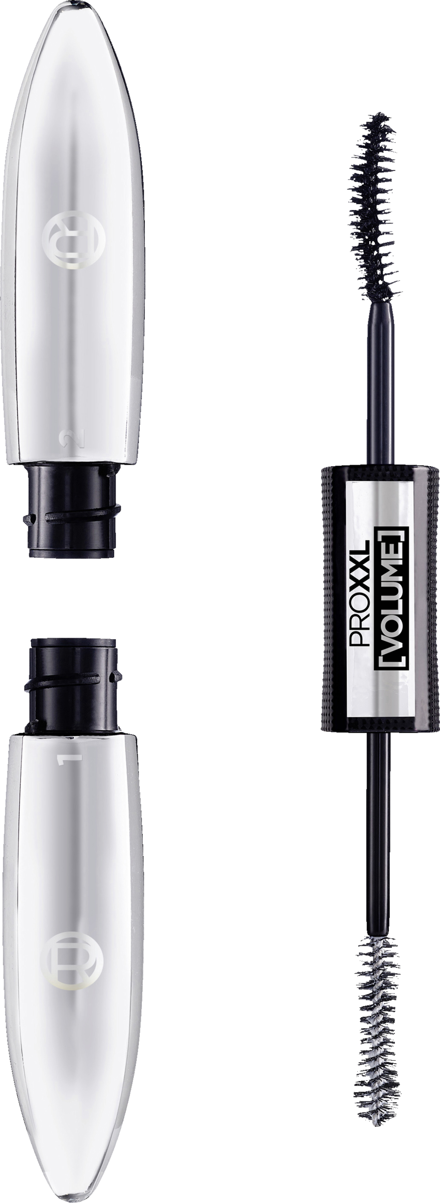 For en øjeblikkelig volumeneffekt: ProXXL Volume Mascara fra L'Oréal Paris giver volumen og dybe sorte øjenvipper i 2 trin. Trin 1: Påføring af den volumengivende primer for volumen, trin 2: intens sort takket være den specielle Black Booster-teknologi.