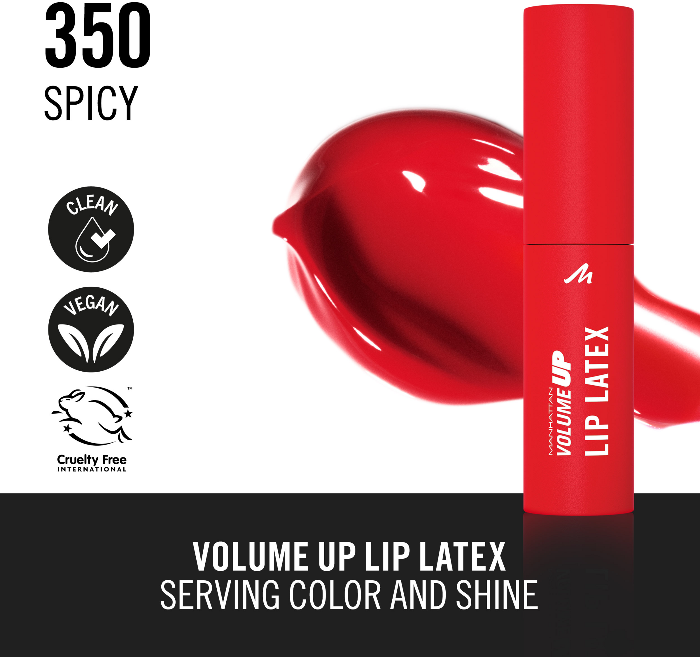 MANHATTAN Volume Up Lip Latex giver intens farve og langtidsholdbar latexglans. Med aloe vera, hyaluronsyre og E-vitamin for et glat, skinnende look. Efterlader en lip stain-effekt!