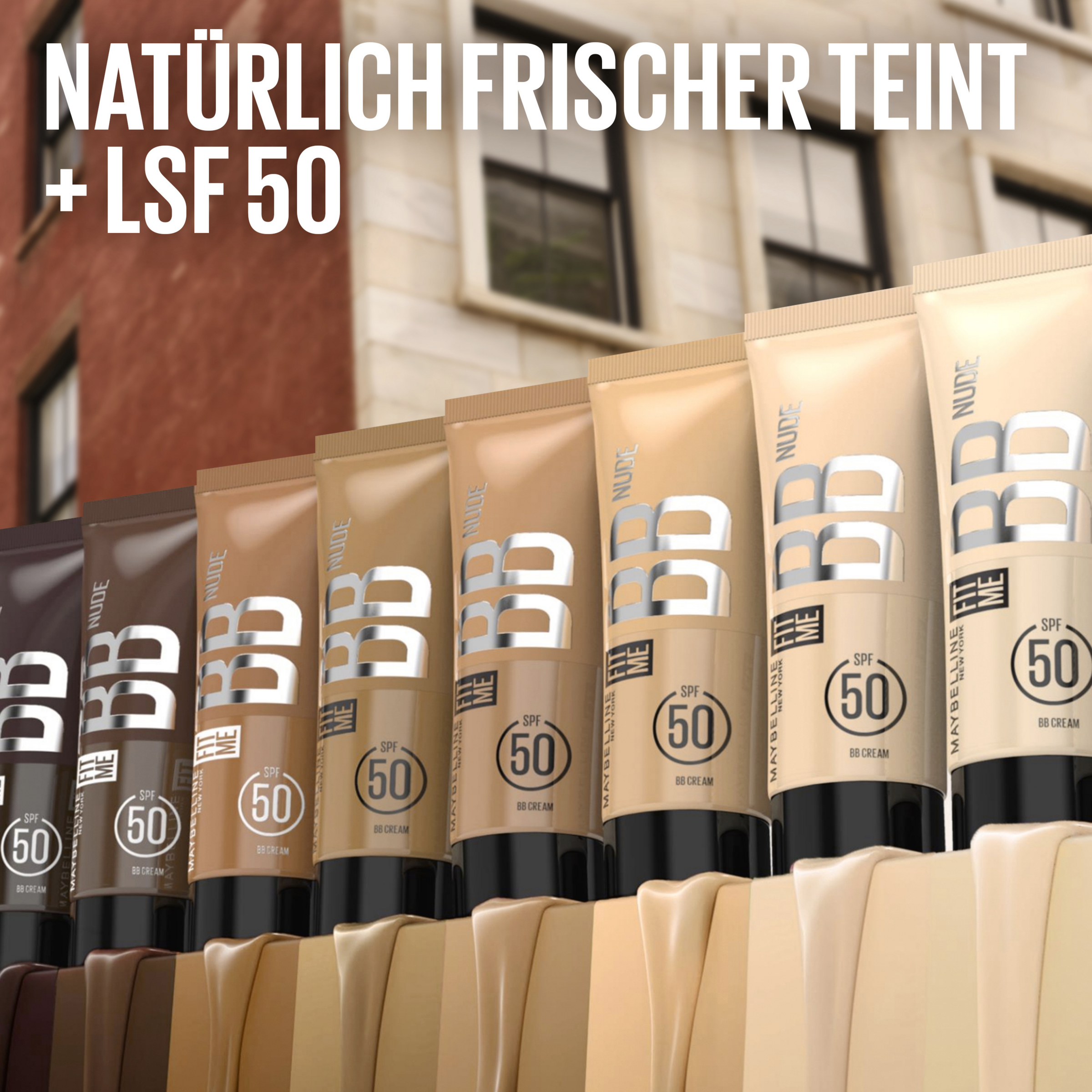 Fit me Nude BB Cream 60 fra Maybelline New York sikrer en øjeblikkelig og langsigtet forbedring af hudens struktur. Den hudperfektionerende BB Cream giver en frisk og strålende teint og fugter huden i 24 timer takket være formlen med 90 % nærende ingredienser. Samtidig giver den en høj grad af beskyttelse mod virkningerne af UV-stråling takket være den integrerede solbeskyttelsesfaktor 50. Den føles også behageligt let på huden og sikrer et fejlfrit hold hele dagen. Nuancen på BB Cream tilpasser sig også hudtonen for at skabe en let og naturligt udseende dækning.