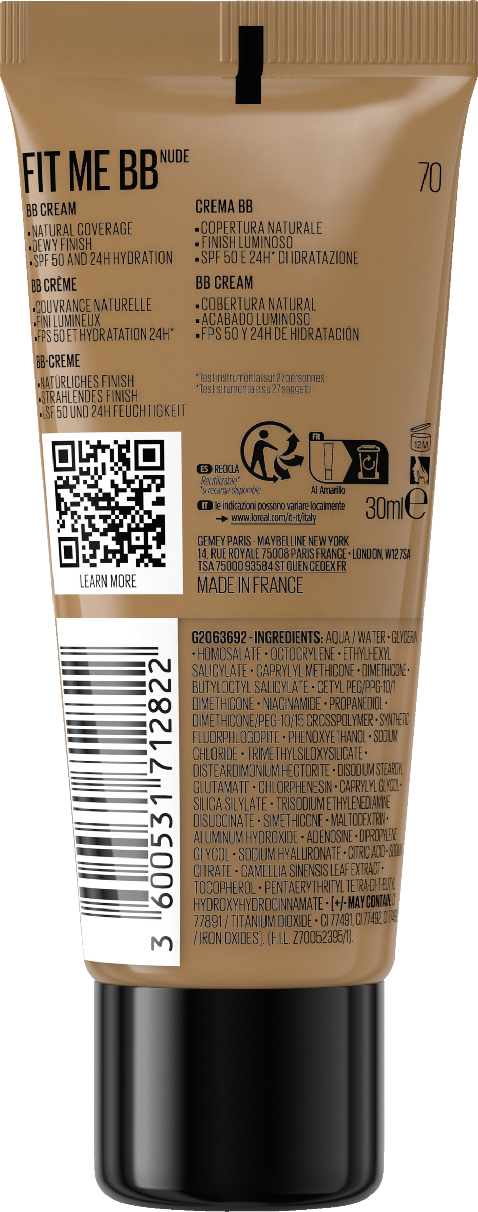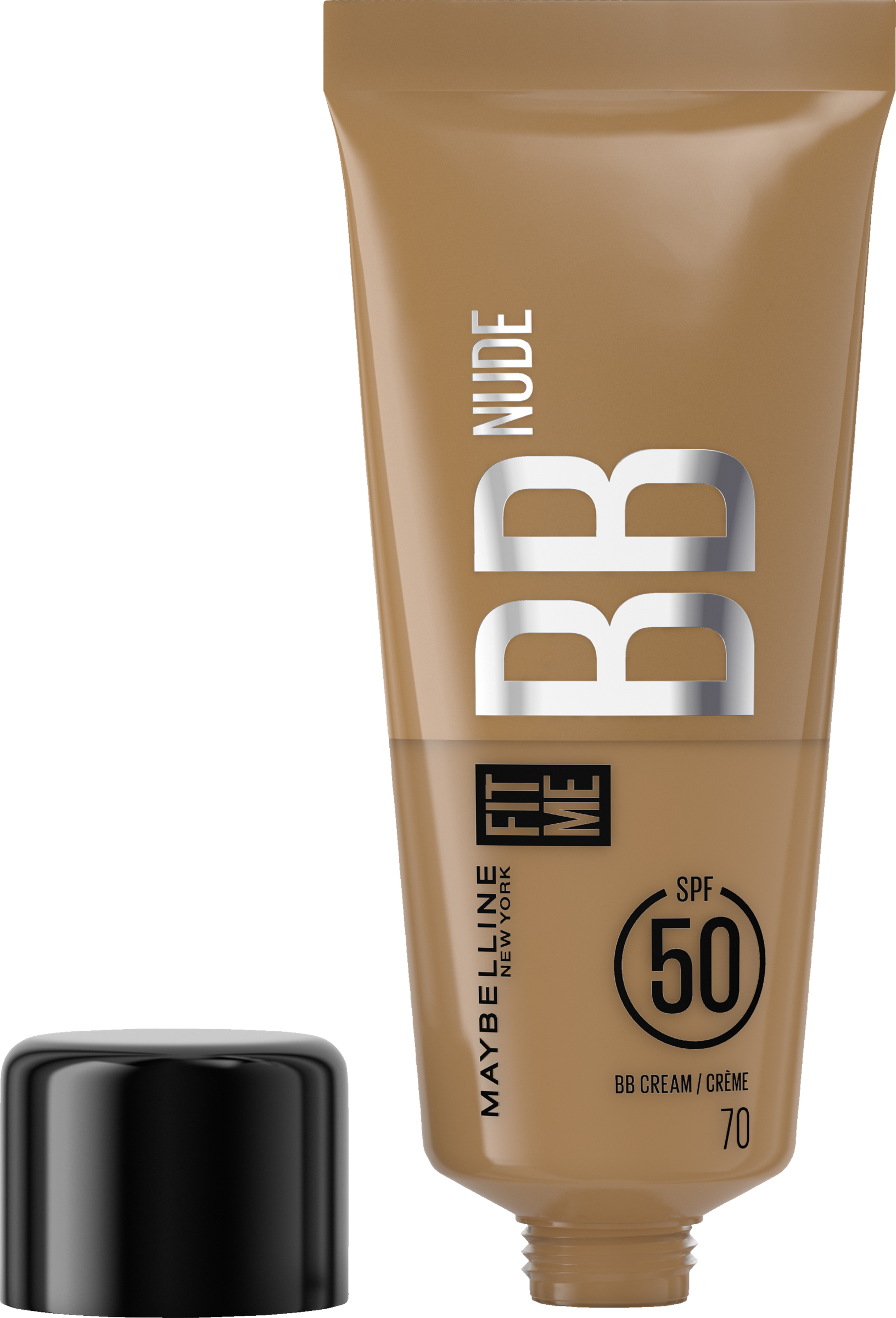 Fit me Nude BB Cream 70 fra Maybelline New York sikrer en øjeblikkelig og langsigtet forbedring af hudens struktur. Den hudperfektionerende BB Cream giver en frisk og strålende teint og fugter huden i 24 timer takket være formlen med 90 % nærende ingredienser. Samtidig giver den en høj grad af beskyttelse mod virkningerne af UV-stråling takket være den integrerede solbeskyttelsesfaktor 50. Den føles også behageligt let på huden og sikrer et fejlfrit hold hele dagen. Nuancen på BB Cream tilpasser sig også hudtonen for at skabe en let og naturligt udseende dækning.