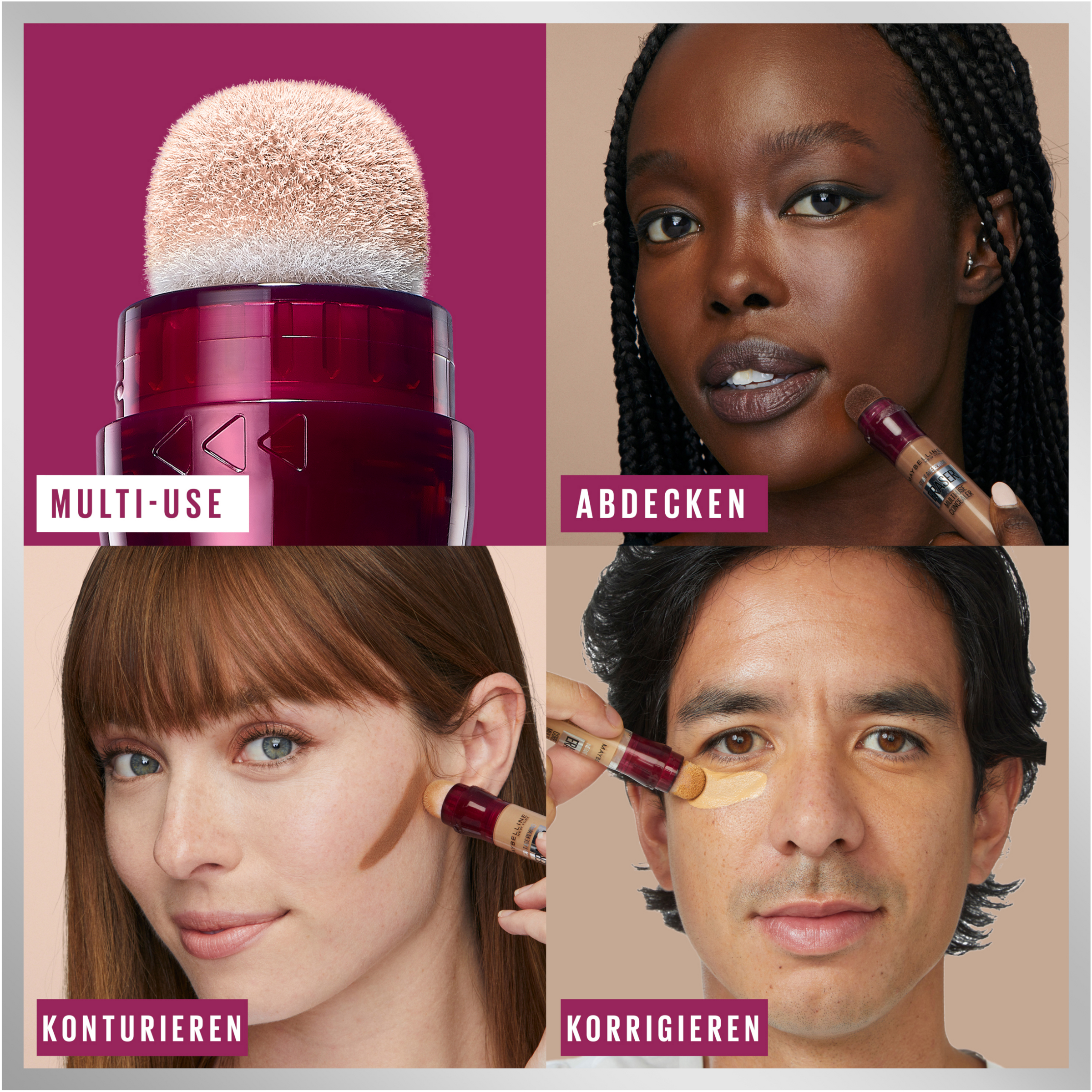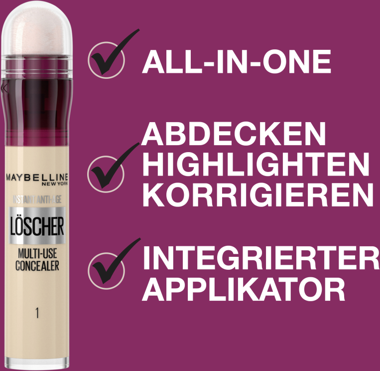 Sofort strahlend wach aussehen? Kein Problem mit der Geheimwaffe Instant Anti-Age Effekt Concealer von Maybelline New York. Vor dem Make-up ist Concealer auftragen angesagt, denn so kann er seine volle Wirkung entfallten und kleine Makel zuverlässig abdecken. Den Maybelline New York Instant Anti-Age Effekt Concealer das erste Mal verwenden: Dazu den oberen Teil einige Male in Pfeilrichtung drehen, bis das Produkt auf dem Mikro-Lösch-Applikator sichtbar wird. Dann die feine Textur des Concealers mit dem Applikator rund um die Augen auftupfen und nach außen sanft verblenden. Besonders dunkle Augenringe? Hier hilft schon eine zweite Schicht.
