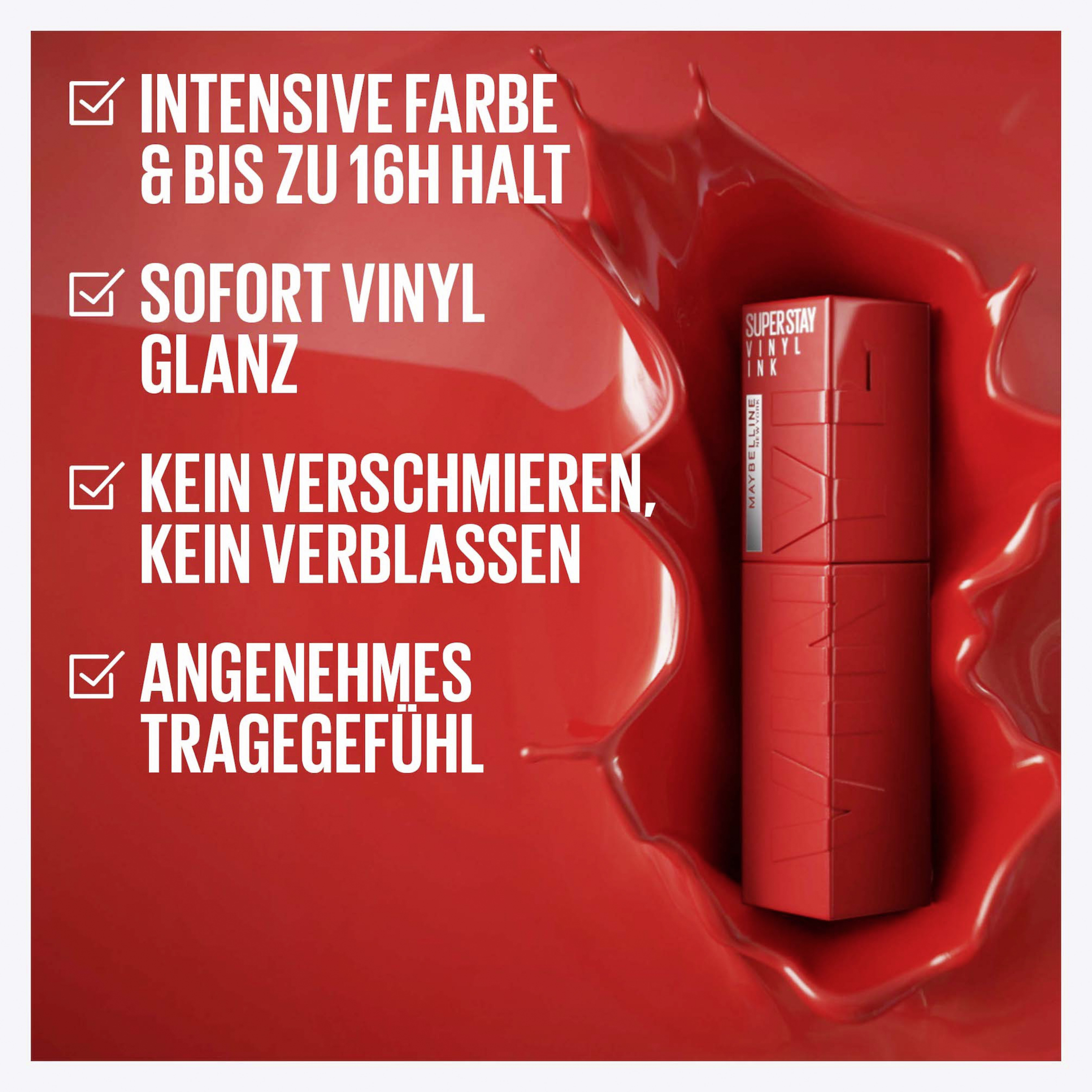 Maybelline New York Super Stay Vinyl Ink flydende Læbestift skaber en øjeblikkeligt skinnende Finish med intens farve og op til 16 timers brug - uden at udtvære eller falme! Maybelline New York Super Stay Vinyl Ink er en absolut game changer! Den flydende Læbestift giver intens farve og en Finish på Læber. Den veganske*, langtidsholdbare formel holder op til 16 timer og forhindrer udtværing og falmning. Højpigmenterede farver hele dagen lang – bliv en absolut trendsætter med Læber. *Uden Ingredienser af animalsk oprindelse.