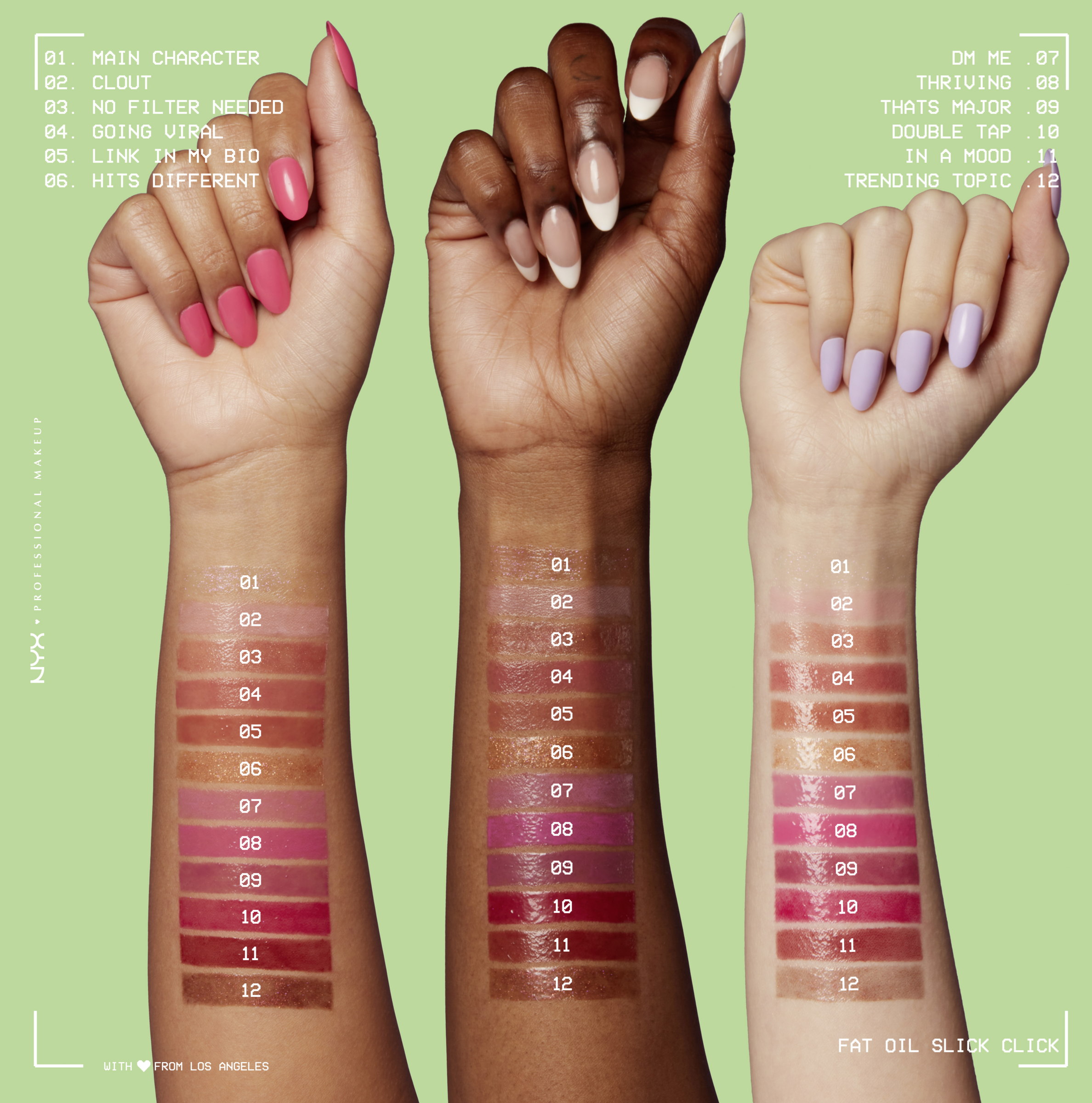 Påfør Fat Oil Slick Click jævnt på læberne. Læbestiften kan påføres i flere lag for at opnå et mere intenst farveresultat. FÜR einen glänzenden Finish kombinieren Sie einfach Fat Oil Slick Click mit einem Lipgloss und verwenden Sie einen Lipliner, bevor Sie ihn auftragen.