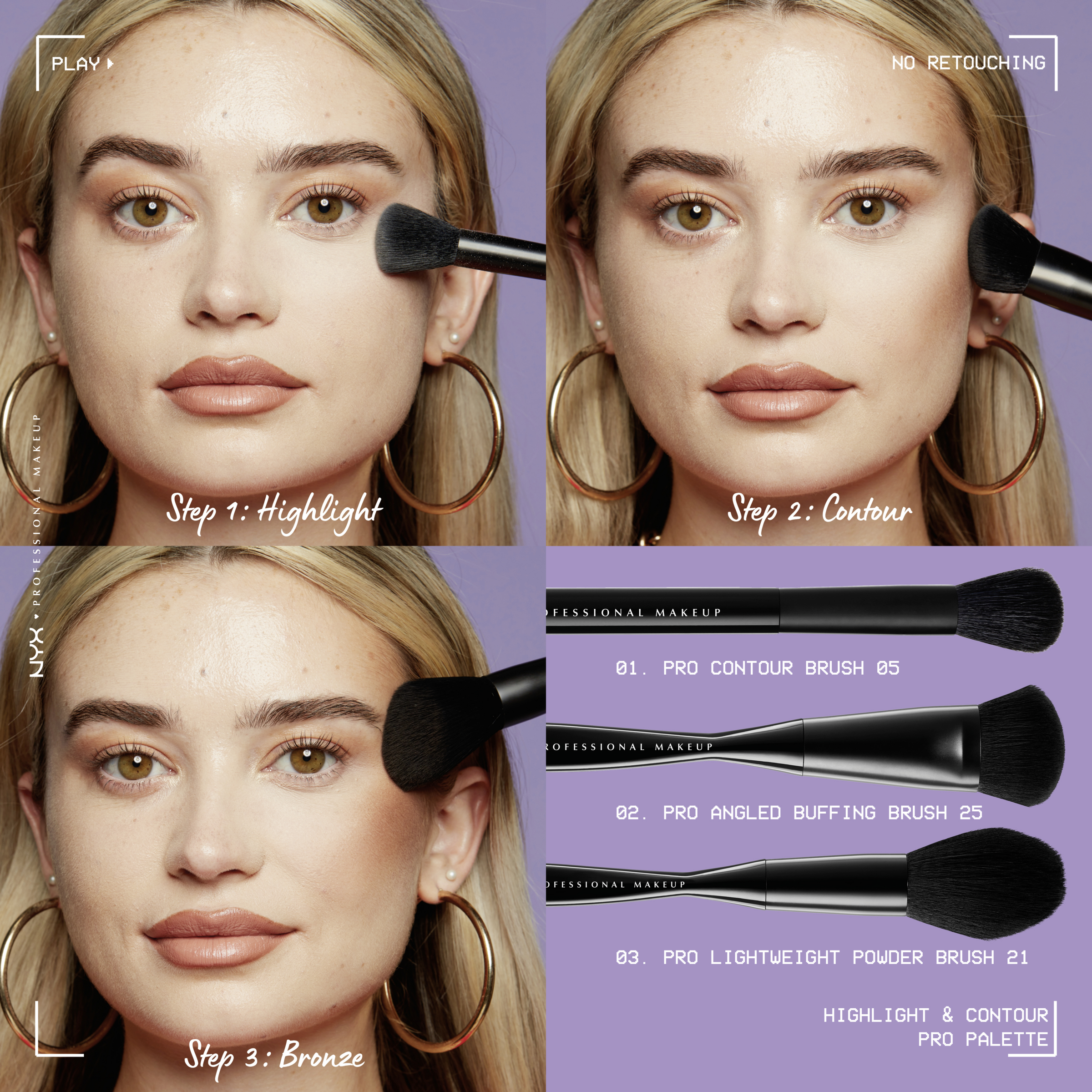 Makeup-paletten med blandbare nuancer er en 3-i-1 foundation, concealer og highlighter og ideel til at fremhæve dine bedste træk - Otte nuancer gør det nemt at lave contouring for et naturligt look, Bland og match farverne efter ønske for dine individuelle konturer - Påfør det cremede pudder med en ren pensel på de ønskede områder, Vi anbefaler at bruge en foundation for langvarigt hold - Det cremede pudder er nemt at blende og tilpasser sig din naturlige hudfarve, Det kompakte design er ideelt til at rejse - Leveringsomfang: 1x NYX Professional Makeup Highlight & Contour Pro Palette, vægt: 2,7 gram (pr. gryde)