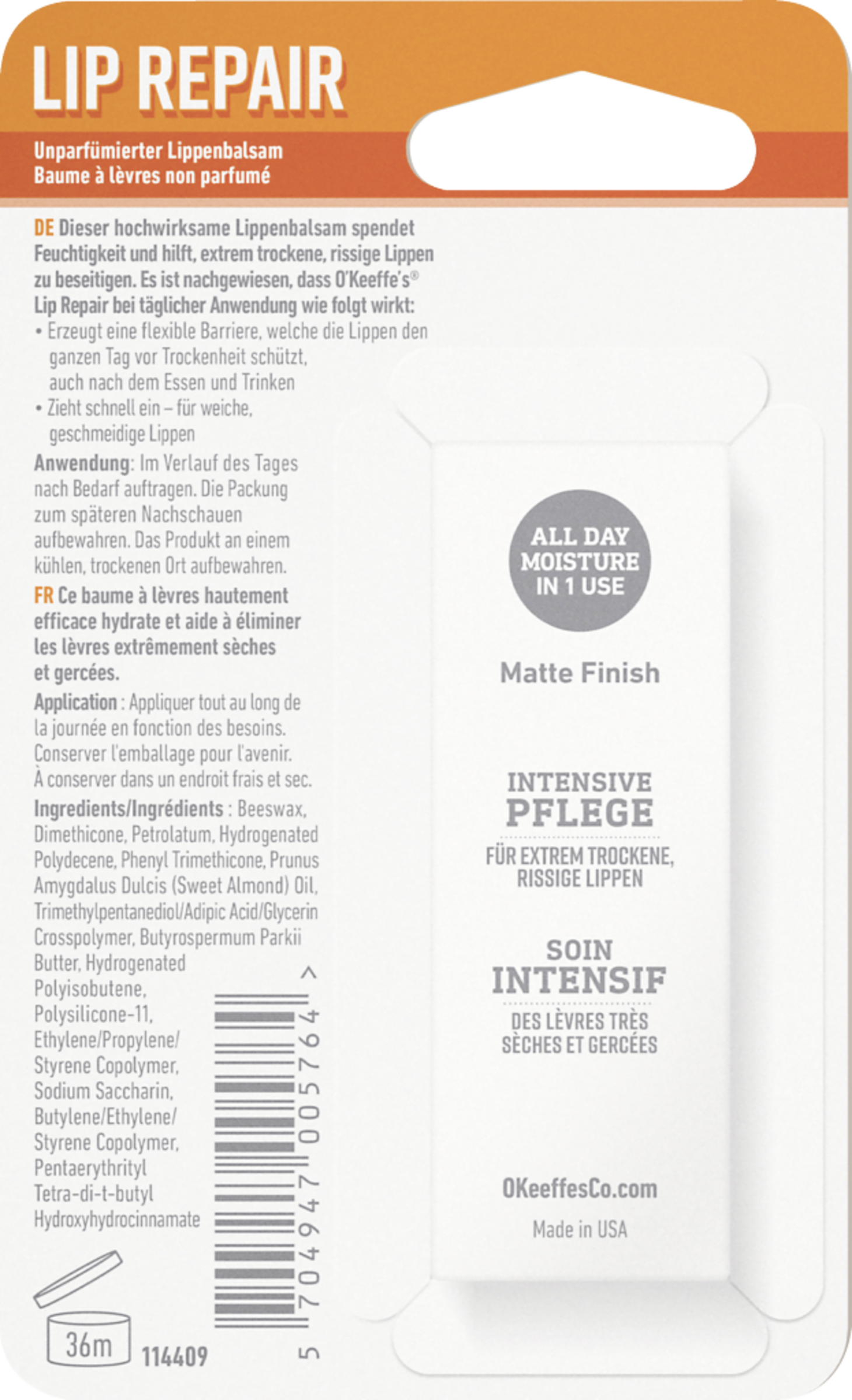Den yderst effektive formel fugter, beroliger og reparerer tørre læber og efterlader dem bløde, glatte og sunde hele dagen lang. O'Keeffe's Lip Repair giver langvarig hydrering i op til 24 timer og er klinisk bevist at virke efter blot én anvendelse . Det er rigtigt - du behøver ikke længere at påføre produktet hver dag eller flere gange om dagen. Effekten forbliver selv efter at have spist og drukket!