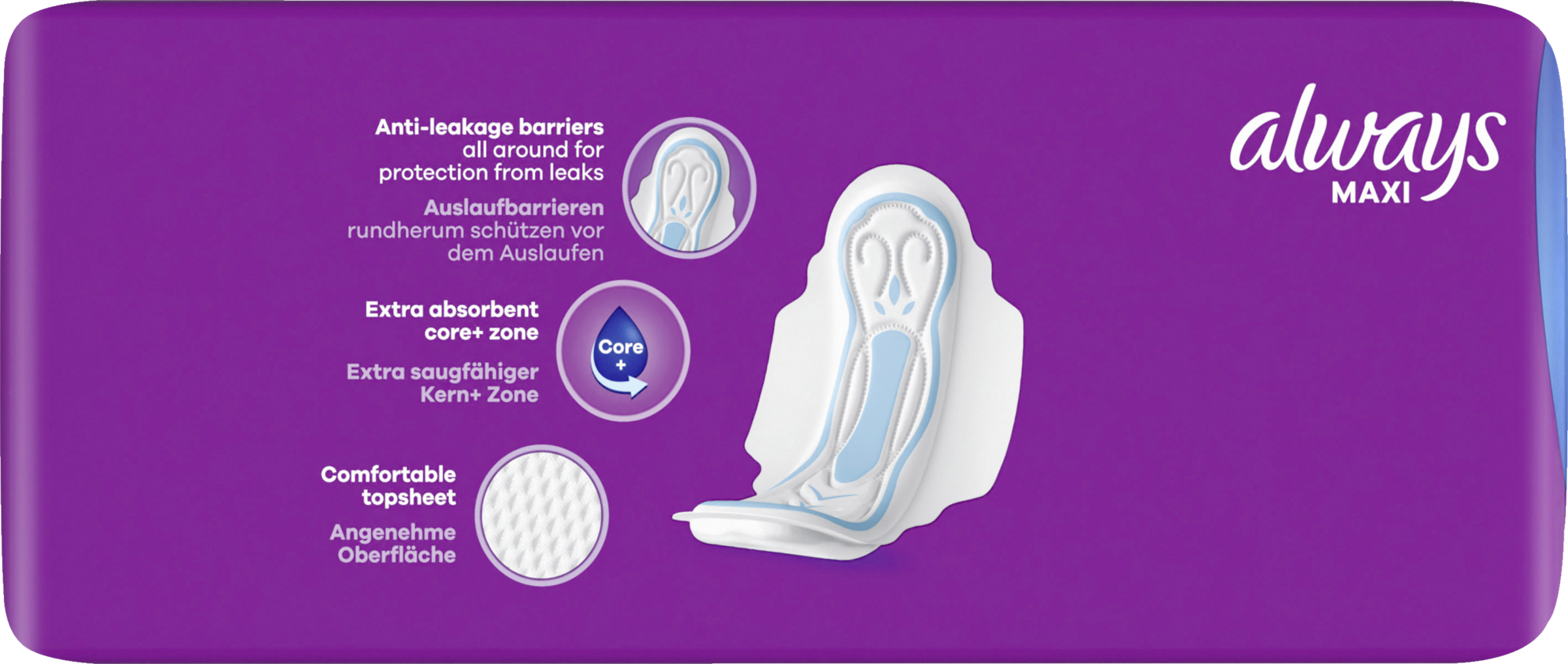 ALWAYS Maxi Long bind (størrelse 2) med vinger giver dig omfattende beskyttelse og komfort, når du har mest brug for det. ALWAYS Maxi Long er et tykt hygiejnebind, der giver op til 100 % beskyttelse med sin lækagebeskyttelsesbarriere hele vejen rundt og sin ekstra absorberende Core+-zone i midten.