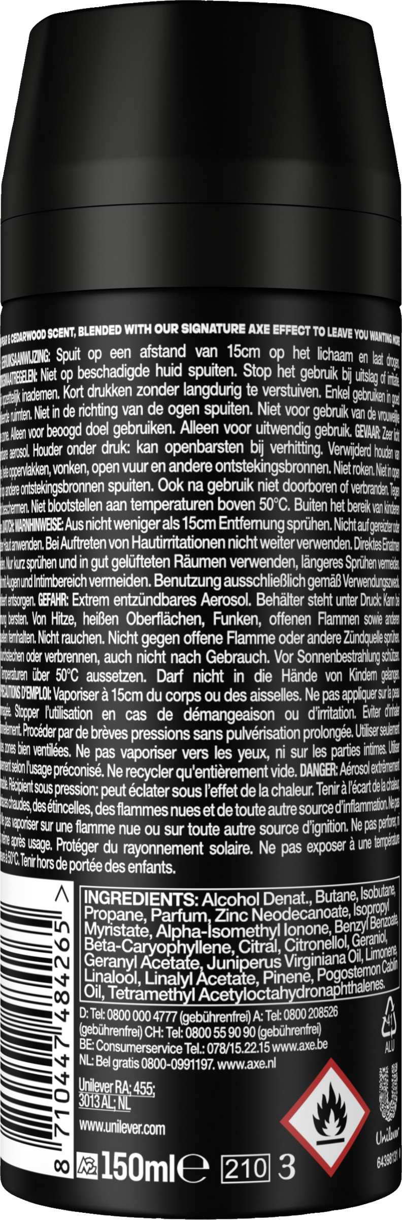 AXE er engageret i bæredygtighed - vores ambition er, at al AXE-emballage skal være genanvendelig eller indeholde genbrugsmateriale i 2025. Aluminiumet i deodoranten kan genbruges på ubestemt tid. Genbrug venligst den tomme dåse.