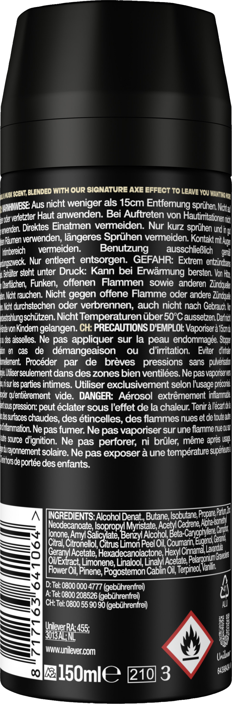 AXE er engageret i bæredygtighed - vores ambition er, at al AXE-emballage skal være genanvendelig eller indeholde genbrugsmateriale inden 2025. Aluminiumet i deodoranten kan genbruges på ubestemt tid. Genbrug venligst den tomme dåse.