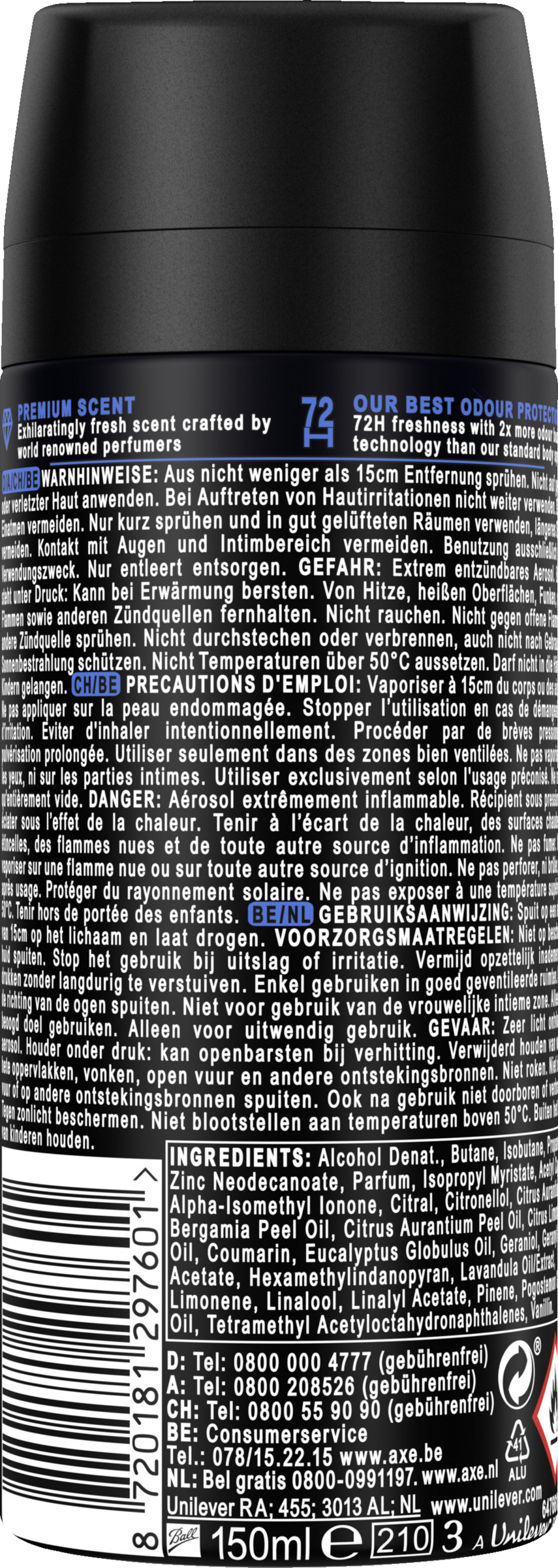 - med effektiv AXE-beskyttelse uden aluminiumssalte beskytter deosprayen mod kropslugt i op til 72 timer og giver en spektakulær duft