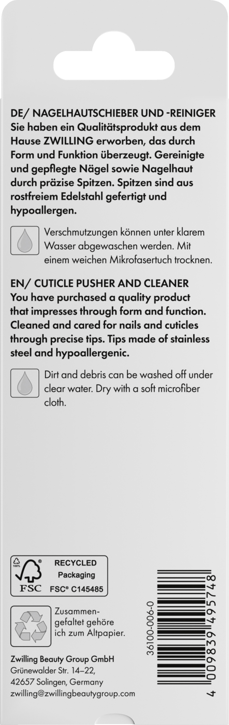 Dette er et kvalitetsprodukt fra ZWILLING, der imponerer med sin form og funktion. Rene og velplejede negle og neglebånd takket være præcise spidser. Spidserne er lavet af rustfrit stål og er allergivenlige, snavs kan vaskes af under rent vand. Tørhed med en blød mikrofiberklud.