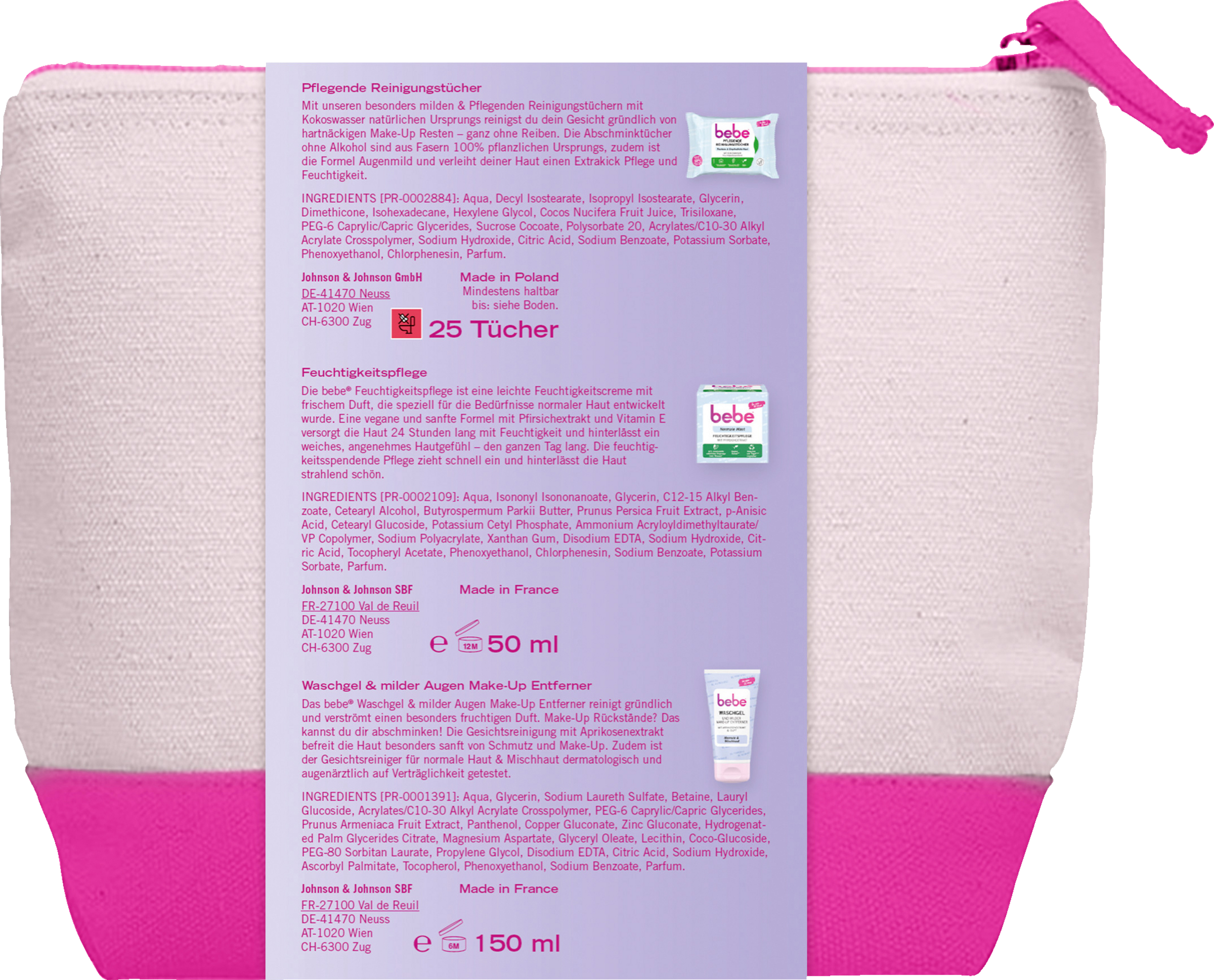 bebe Pflegende Reinigungstücher: Aqua, Decyl Isostearate, Isopropyl Isostearate, Glycerin, Dimethicone, Isohexadecane, Hexylene Glycol, Cocos Nucifera Fruit Juice, Trisiloxane, PEG-6 Caprylic/Capric Glycerides, Sucrose Cocoate, Polysorbate 20, Acrylates/C10-30 Alkyl Acrylate Crosspolymer, Sodium Hydroxide, Citric Acid, Sodium Benzoate, Potassium Sorbate, Phenoxyethanol, Chlorphenesin, Parfum.