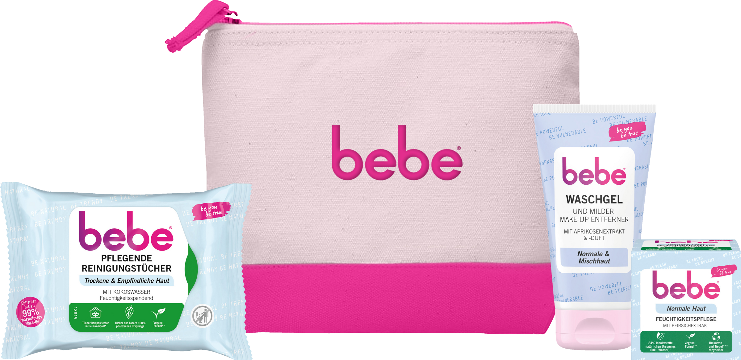 - Wash gel & mild eye make-up remover: bebe wash gel & mild eye make-up remover renser grundigt og udstråler en særlig frugtagtig duft. Makeup-rester? Det kan du rense af! Ansigtsrensen med abrikosekstrakt fjerner skånsomt snavs og makeup fra huden. Ansigtsrensen til normal og kombineret hud er også dermatologisk og oftalmologisk testet for kompatibilitet.