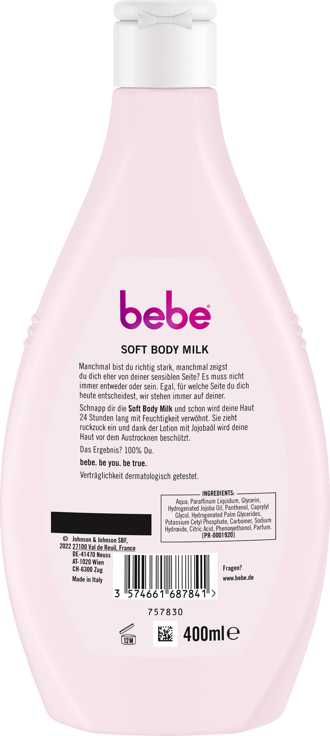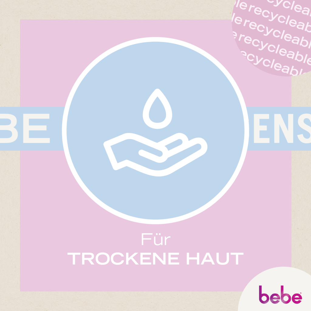 Takket være bebe Soft Body Milk bliver din hud forkælet med vigtig fugt i 24 timer. Bodylotionen med jojobaolie og panthenol absorberes også hurtigt og beskytter din hud pålideligt mod udtørring. Bodylotionen i genanvendelig emballage er særligt velegnet til tør hud, og dens tolerance er dermatologisk testet.