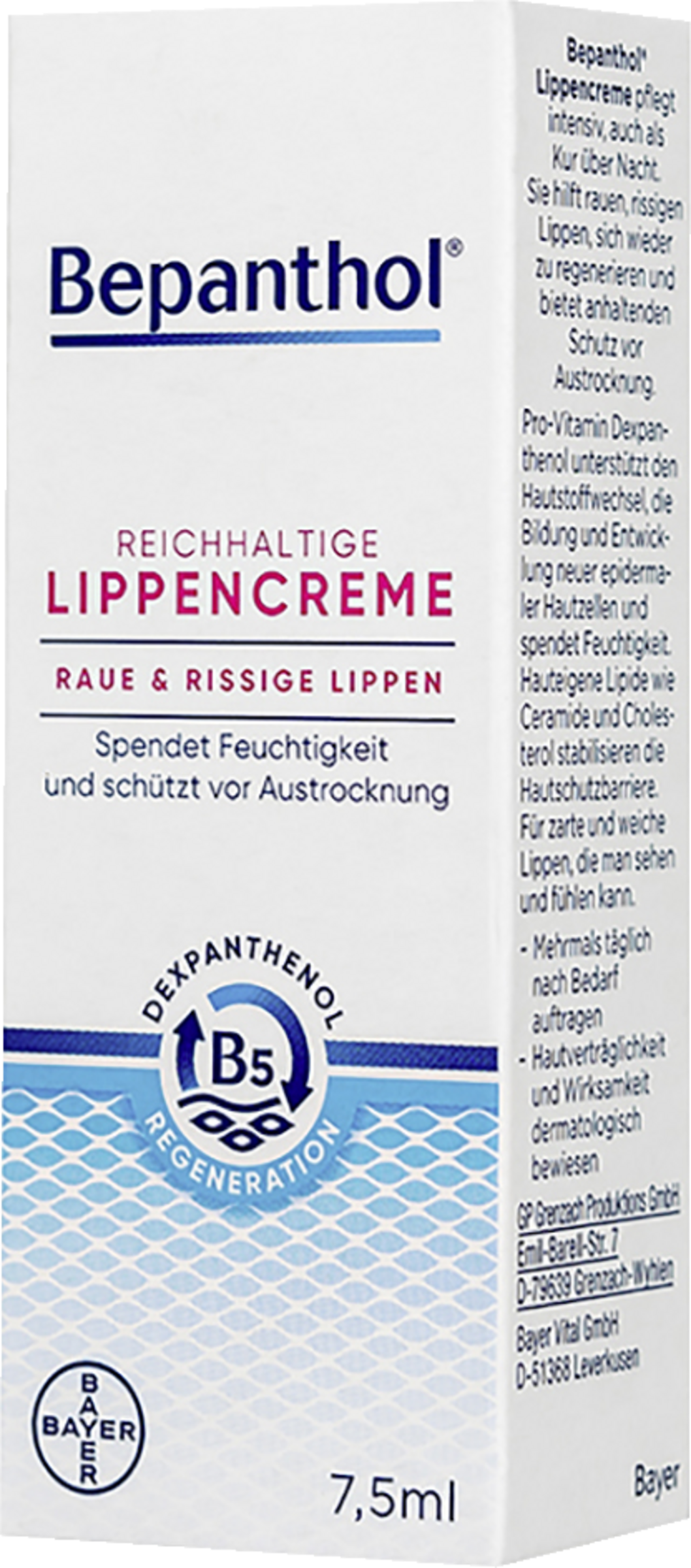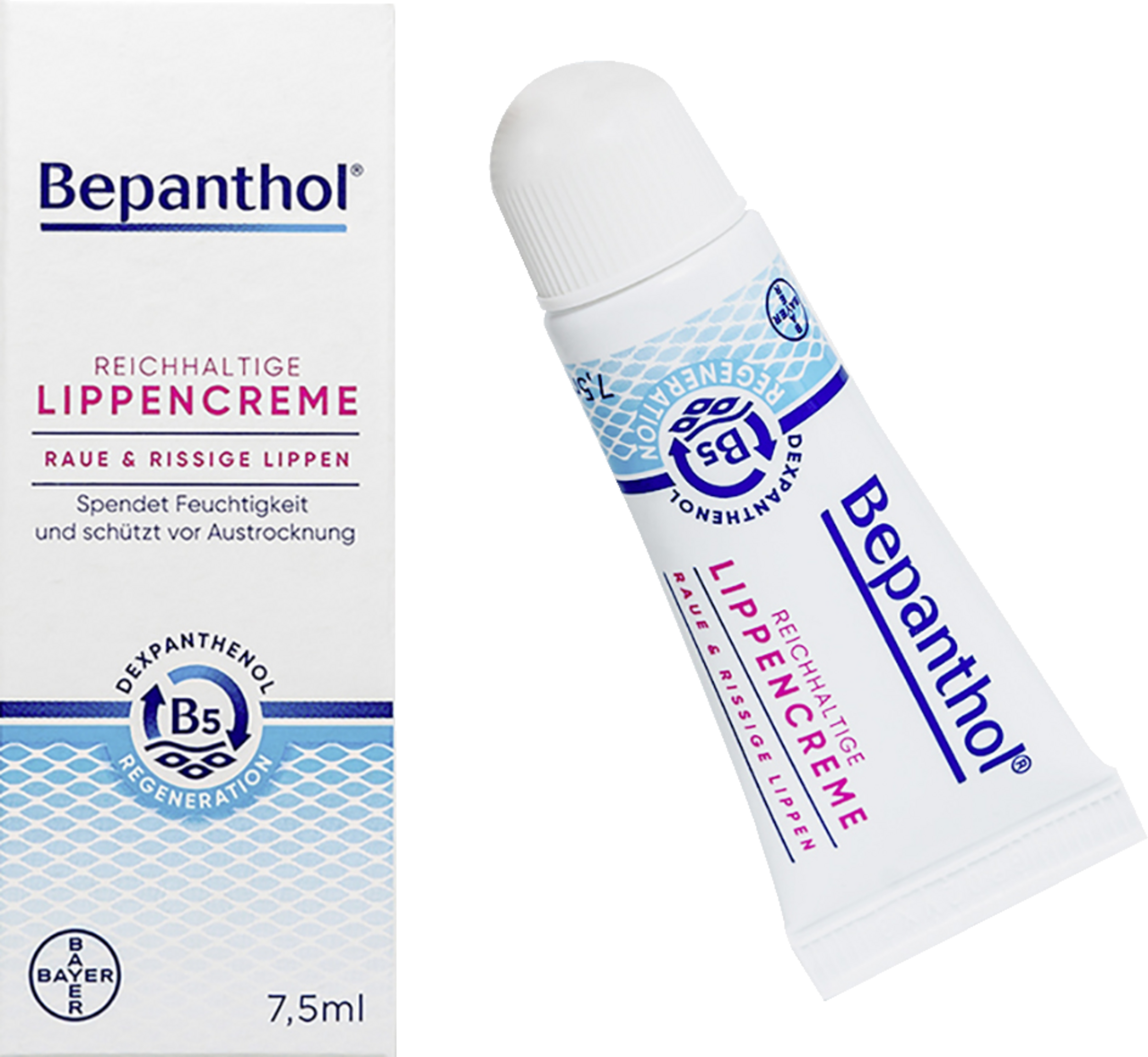 Bepanthol Lip Cream giver intensiv pleje, også som behandling natten over. Til hende regenereres ru, sprukne læber, og den giver varig beskyttelse mod dehydrering. Vitaminerne dexpanthenol understøtter hudens stofskifte, dannelsen og udviklingen af nye hudceller i overhuden og giver huden fugt. Hudens egne lipider som ceramider og kolesterol stabiliserer hudbeskyttelsesbarrieren. For bløde og smidige læber, som du kan se og føle. Hudvenlighed og effektivitet dermatologisk dokumenteret.