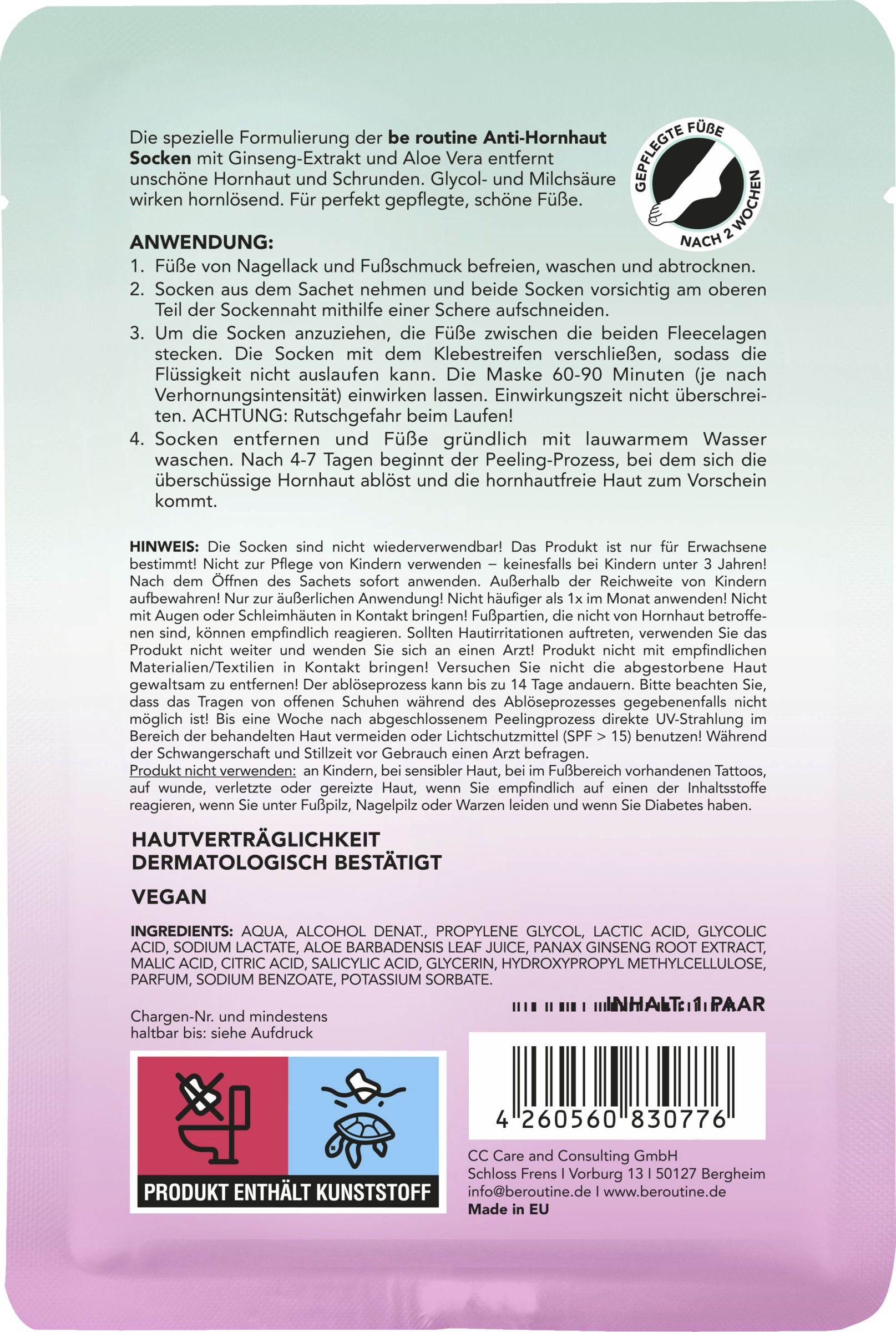 Opbevares utilgængeligt for børn! Kun til udvendig brug! Brug ikke oftere end 1 gang om måneden! Undgå at komme i kontakt med øjne eller slimhinder! Områder af foden, der ikke er påvirket af hård hud, kan reagere følsomt. Hvis der opstår hudirritation, må du ikke fortsætte med at bruge produktet. Kontakt en læge! Bring ikke produktet i kontakt med følsomme materialer/tekstiler! Forsøg ikke at fjerne den døde hud med magt! Opløsningsprocessen kan vare op til 14 dage. Bemærk, at det ikke er muligt at bære åbne sko under opløsningsprocessen! Indtil en uge efter den afsluttede peeling-proces, skal du undgå direkte UV-stråling på den behandlede hud eller bruge solbeskyttelsesmiddel (SPF 15)! Spørg en læge til råds inden brug, hvis du er gravid eller ammer. Brug ikke produktet: på følsom hud, på tatoveringer i fodområdet, på sår, skadet eller irriteret hud, hvis du er overfølsom over for nogen af ingredienserne, hvis du lider af fodsvamp, neglesvamp eller vorter, på børn under 12 år, eller hvis du har diabetes.