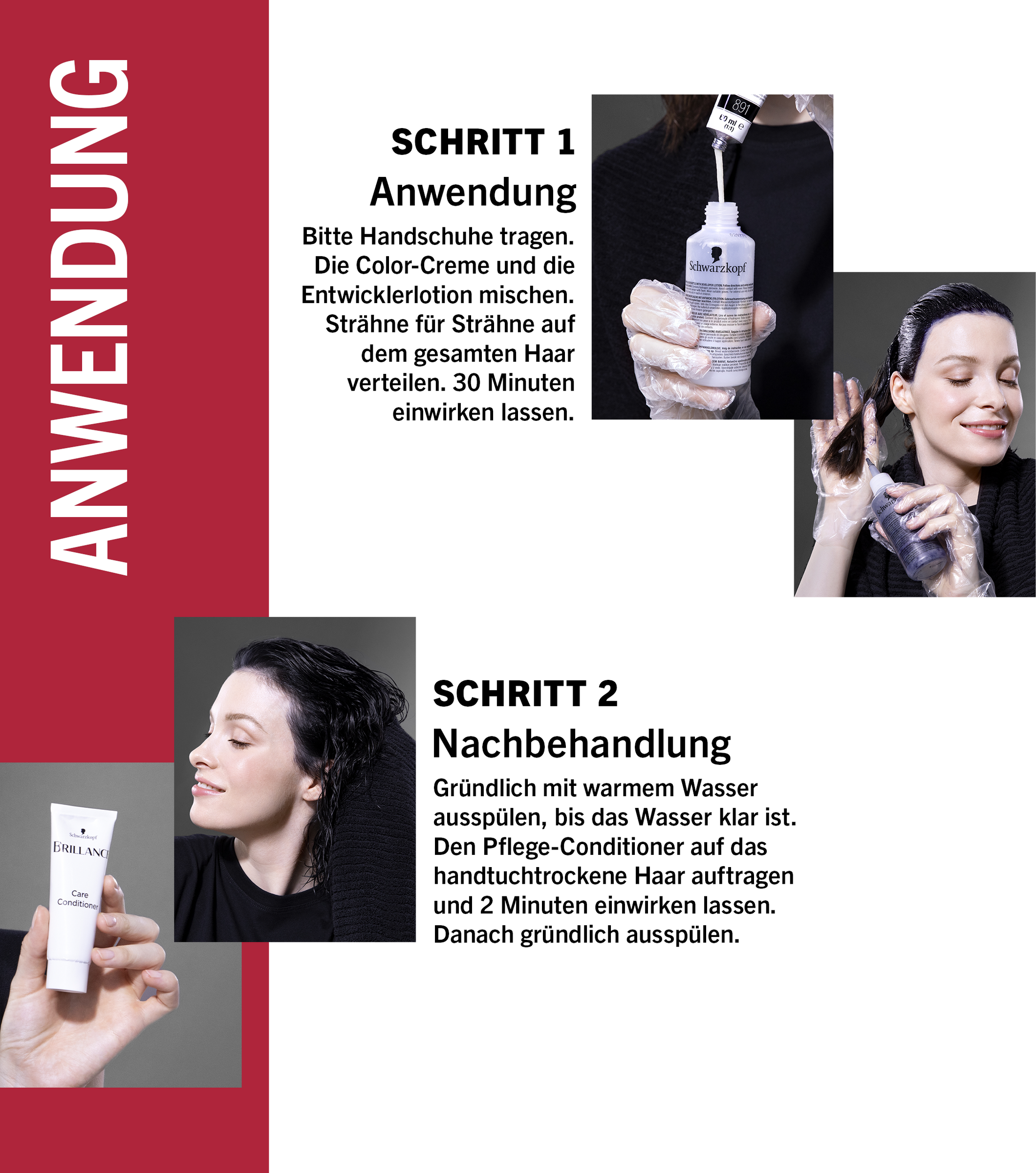 Fordel den færdige farveblanding streng for streng i hele håret. Lad blandingen virke i henhold til brugsanvisningen. Hvis du har længere eller tykkere hår, skal du bruge 2 pakker Brillance til den første påføring.