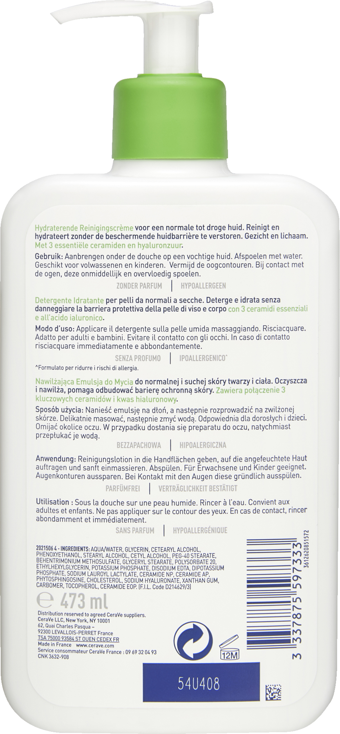 CeraVe fugtgivende renselotion til Ansigt og Krop , udviklet af hudlæger, renser grundigt og giver intensiv fugt uden at angribe Hudbeskyttelsesbarriere naturlige beskyttende barriere. Den rensende lotion, beriget med 3 essentielle ceramider og hyaluronsyre, er ikke-skummende. Den fjerner skånsomt snavs og fedt og øger Hudfugtighed fra første Anvendelse. Den er derfor særdeles velegnet til tør hud .
