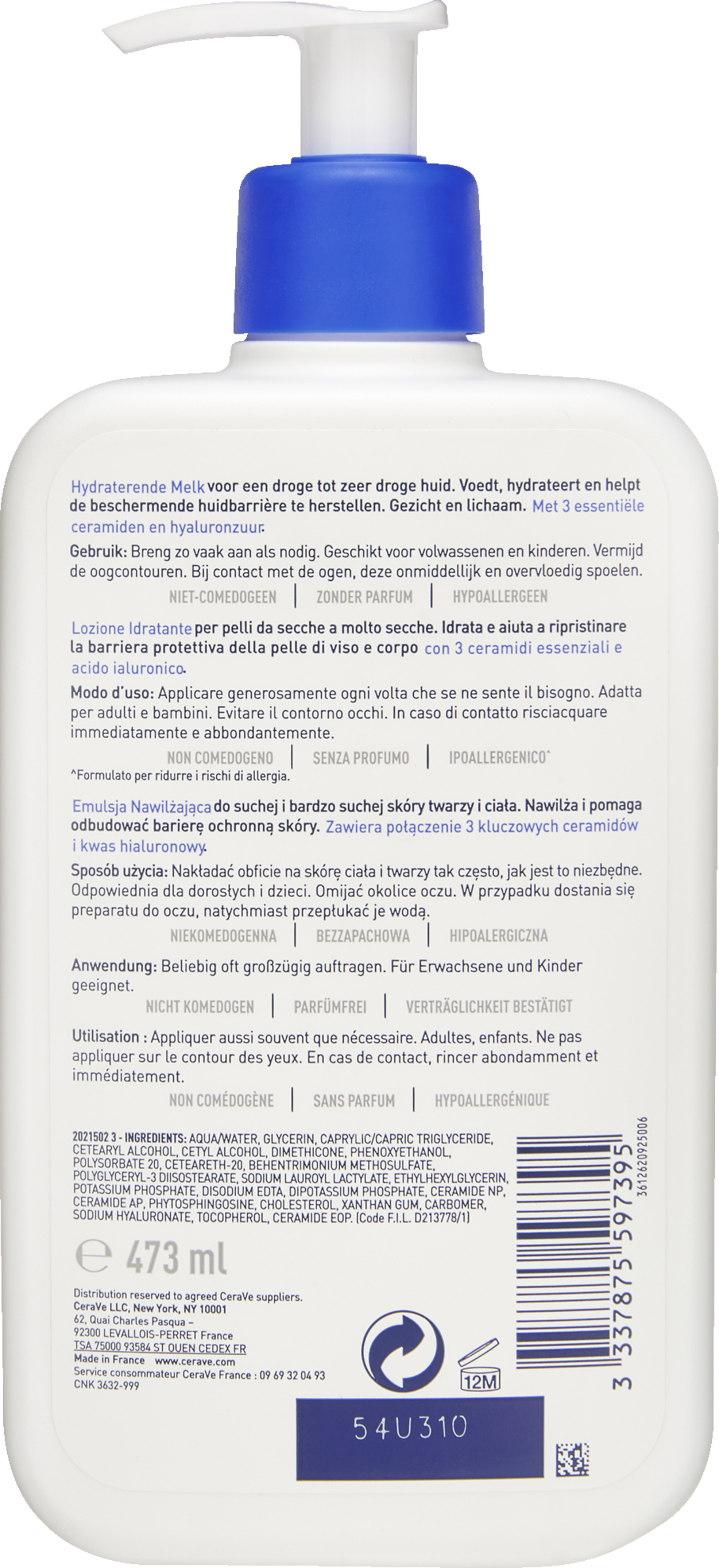 CeraVes fugtgivende lotion til ansigt og krop er udviklet af dermatologer og giver intensiv fugt og støtter fornyelsen af hudens beskyttende barriere. Takket være 3 essentielle ceramider og hyaluronsyre fugter den lette, ikke-fedtende lotion huden hele dagen fra første påføring. Den er meget velegnet både som bodylotion og som ansigtspleje til følsom, tør hud og neurodermatitis.