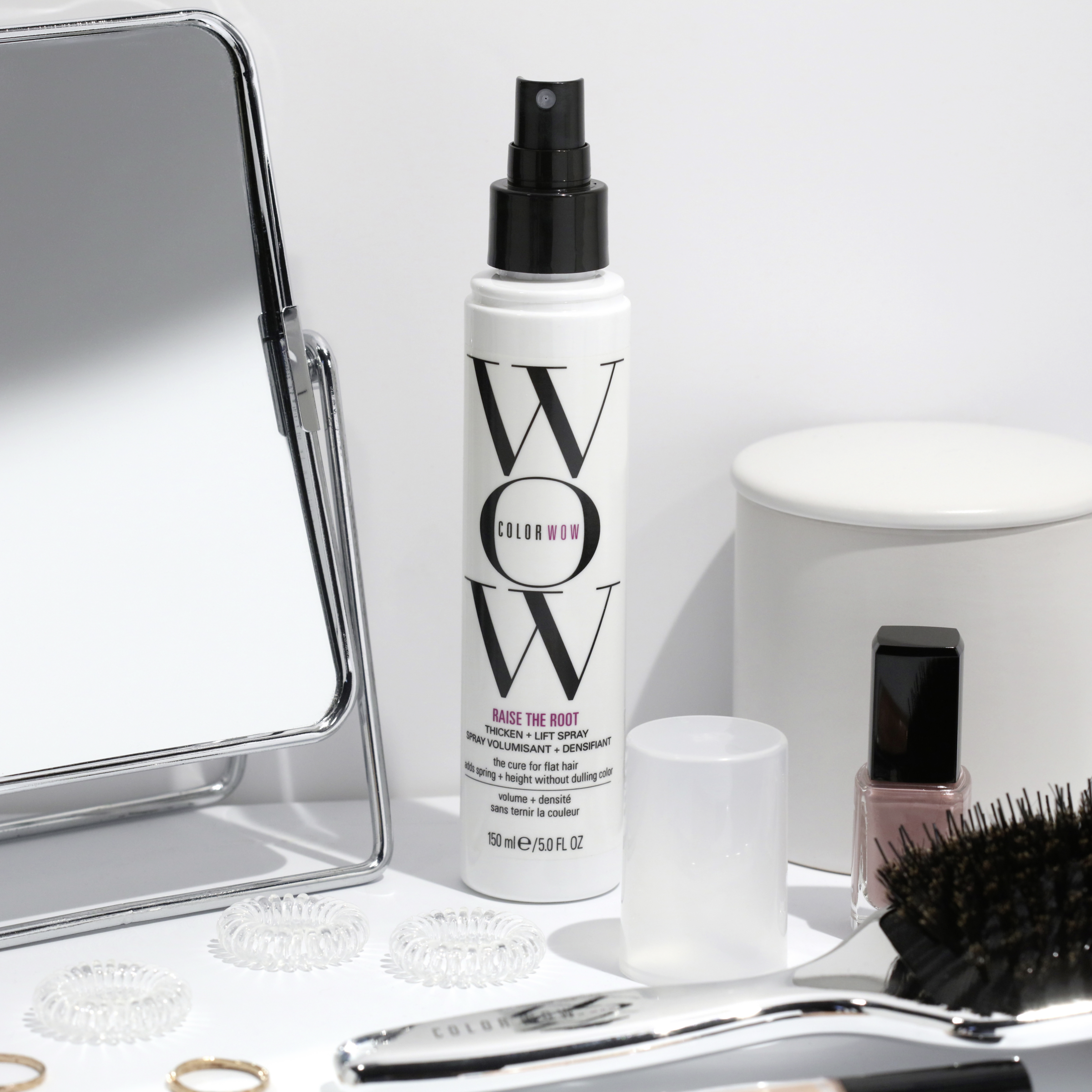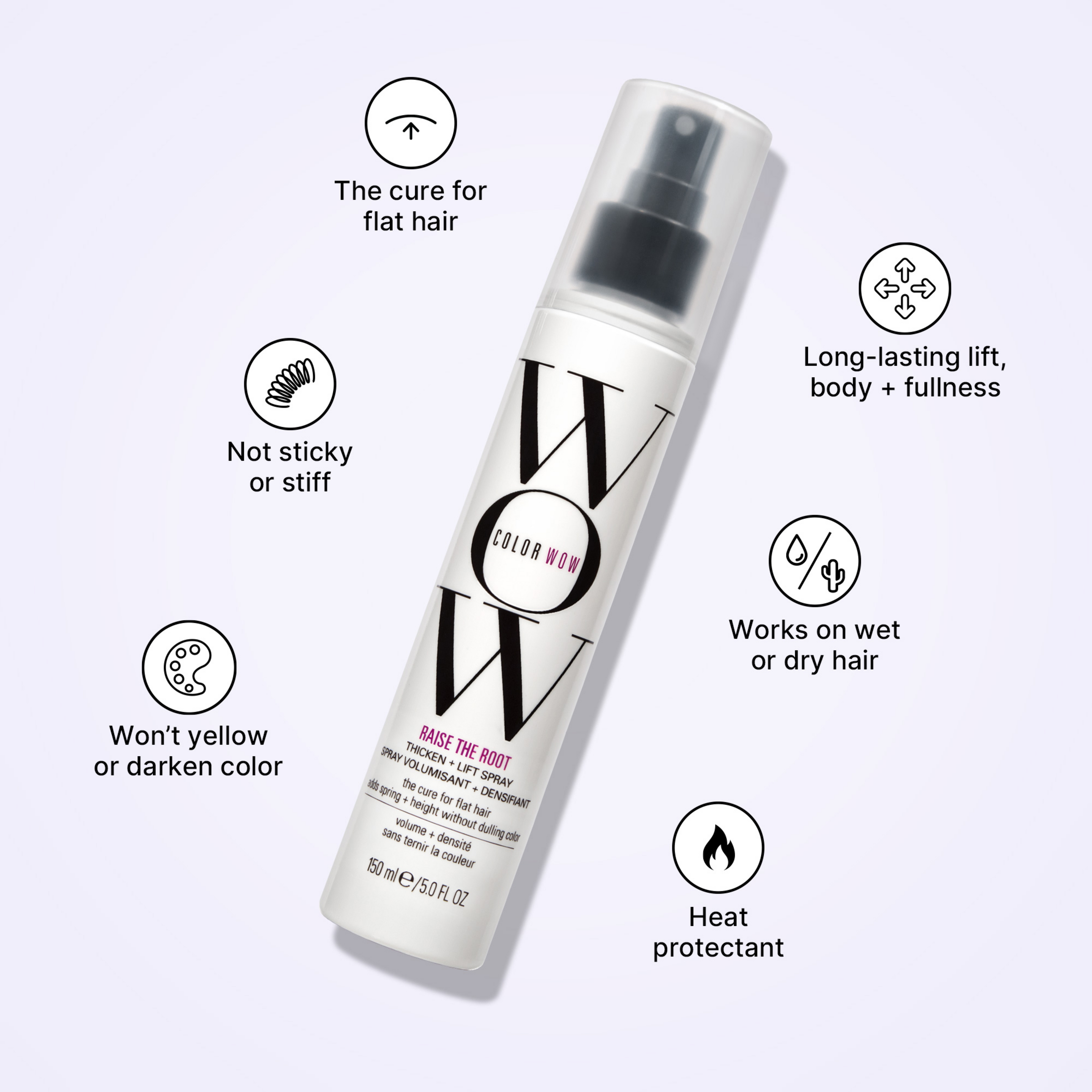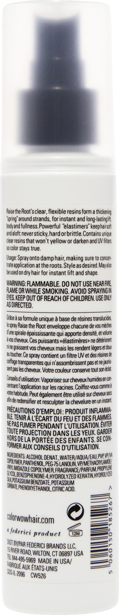 Løsningen: Raise the Root bruger proprietære, klare "elastimere", der danner en "fjeder" ved rødderne. Raise The Root Thicken & Lift Spray leverer en stor, langvarig opløftning og fylde til tyndt, skrøbeligt, farvebehandlet hår.