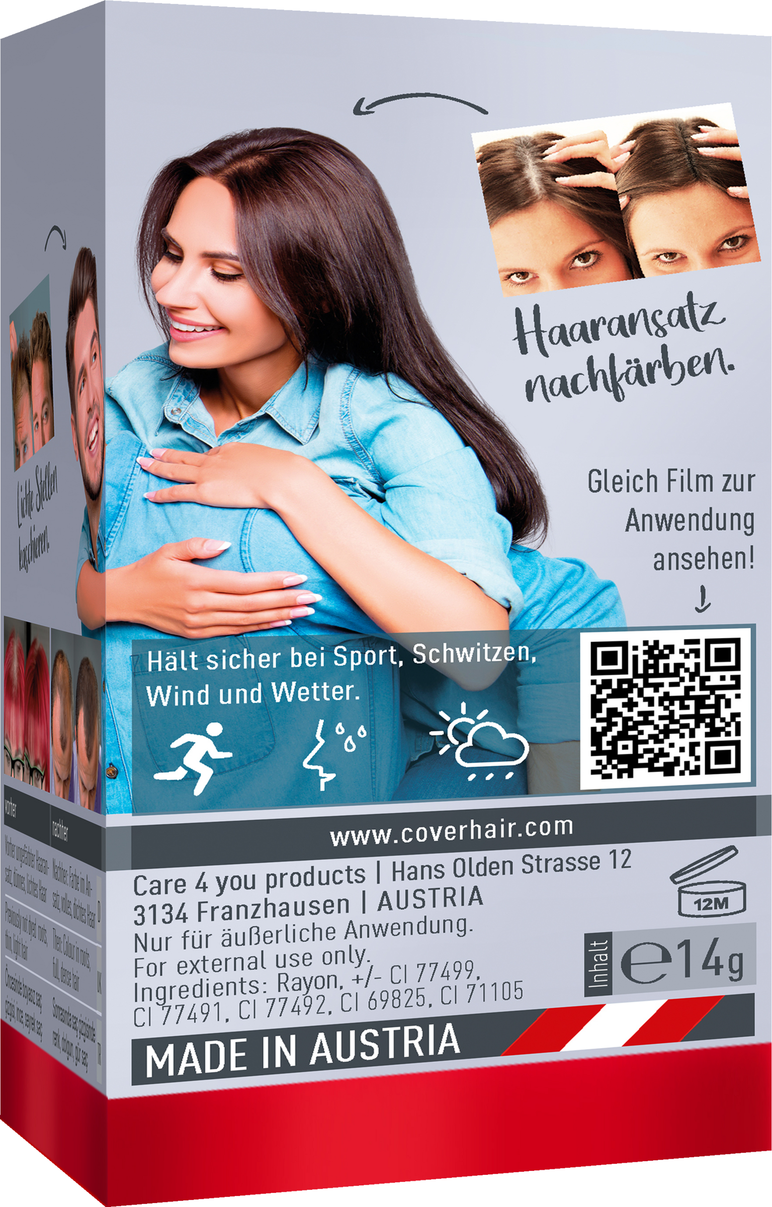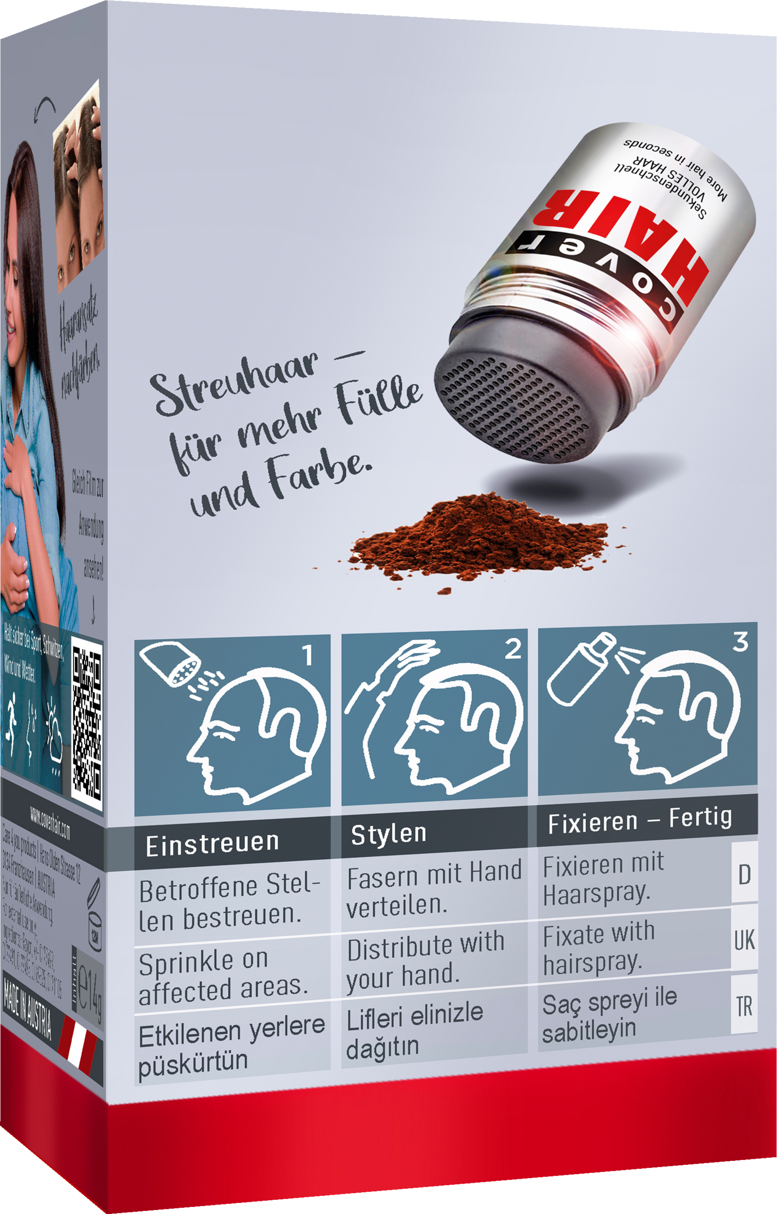 COVER HAIR giver dit hår fylde, farve og volumen. Skaldede pletter, begyndende skaldethed eller uelsket farve ved rødderne forsvinder på få sekunder. Få dit hårs pragt tilbage. Langvarig genfarvning er ikke længere nødvendig så ofte.