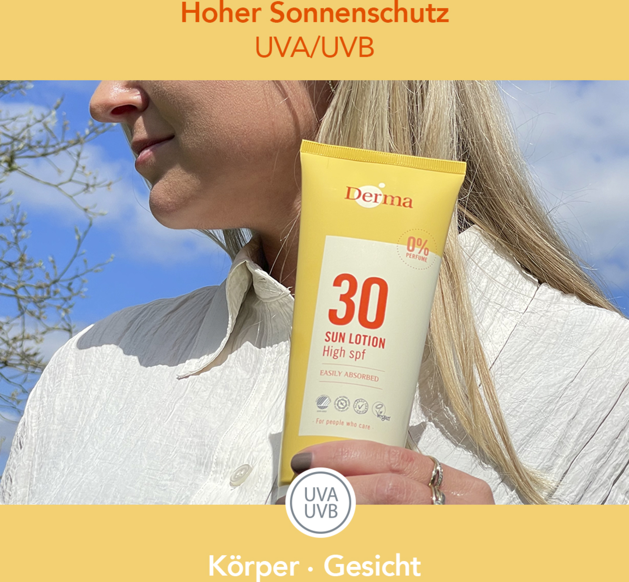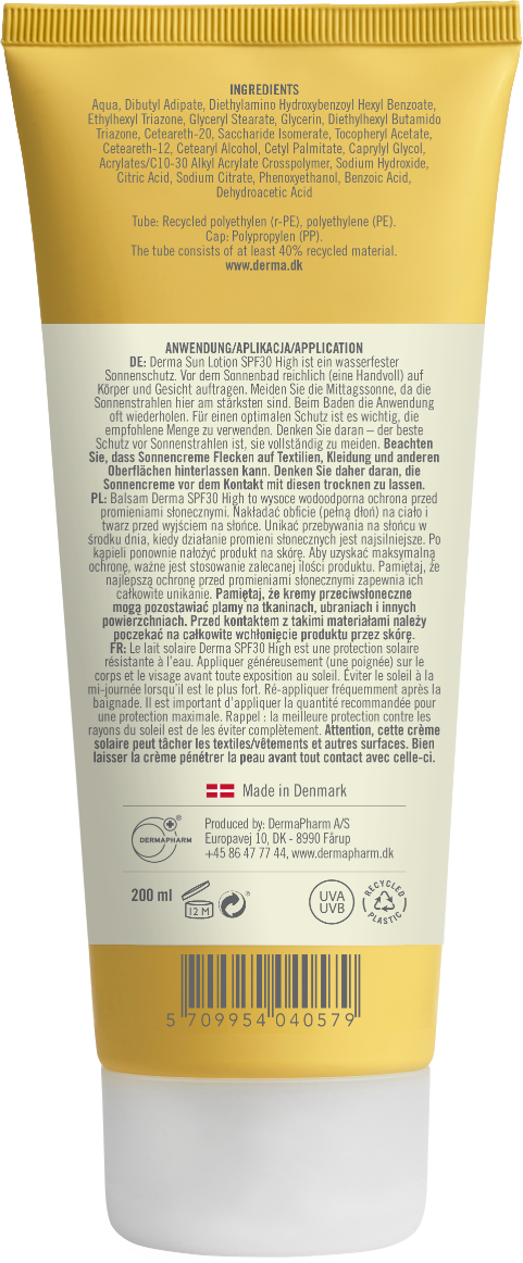 Derma Sun Lotion SPF 30 er en vandfast, vegansk, øko- og allergicertificeret Solcreme med høj beskyttelse mod solens UVA+UVB-stråler. 0% unødvendige kemikalier, ingen Parfume og ingen farvestoffer. Indeholder kraftige Fugtighedsbooster, der holder huden blød og smidig og reducerer afskalning. Fugtgivende glycerin, E-vitamin og naturlige olier hjælper med at bevare hudens naturlige elasticitet og fugtbalance. Den absorberes hurtigt uden at gøre huden fedtet.