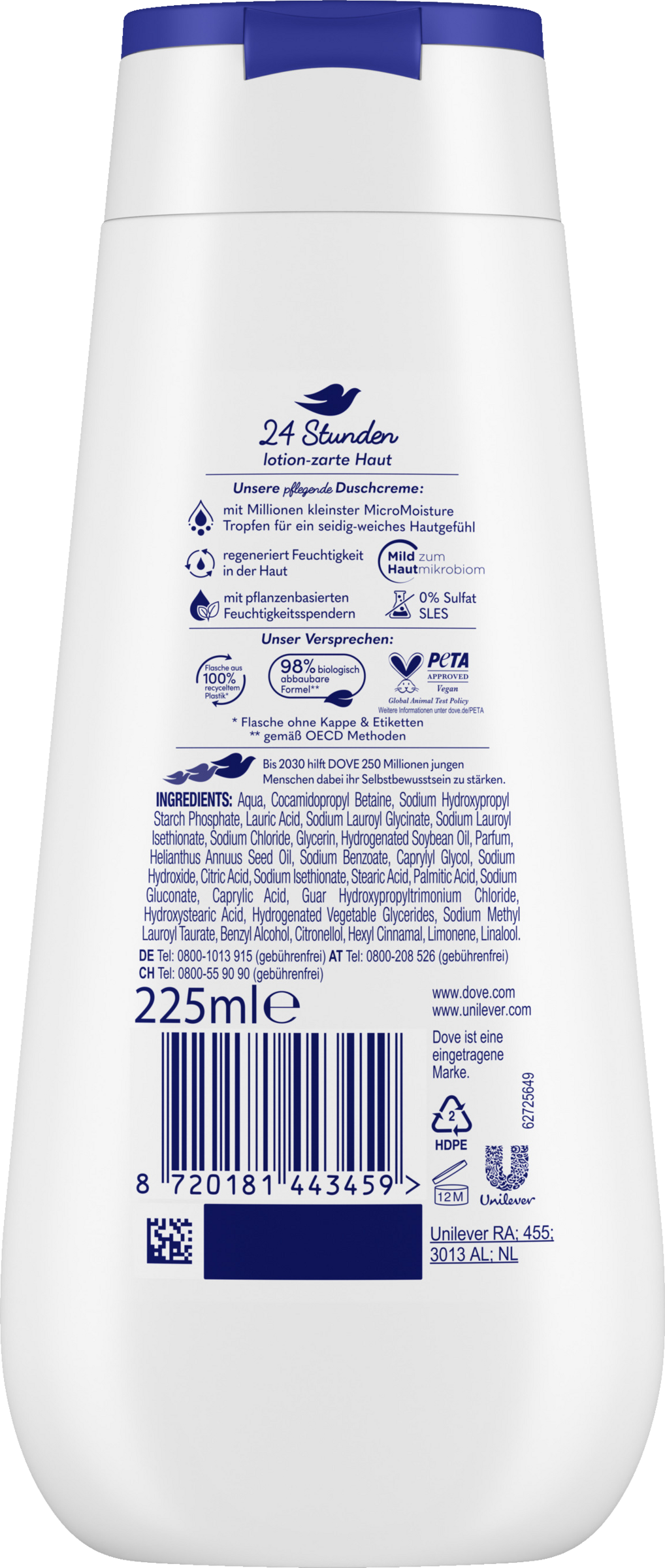 Flasken er fremstillet af 100 % genbrugsplast*. Dove er certificeret af PETA som "cruelty-free", og vores plejeprodukter bærer nu det PETA-godkendte logo. På verdensplan tester Dove ikke på dyr, ikke engang hvor dyreforsøg er obligatoriske.