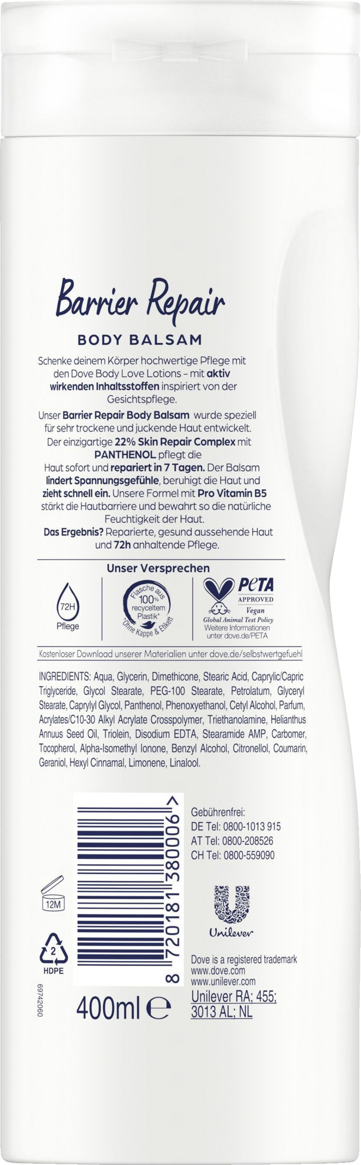 Barrier Repair Body Balm er specielt udviklet til meget tør og kløende hud. Den unikke kropspleje med 22% Skin Repair Complex og panthenol nærer huden med det samme og reparerer den på 7 dage. Balsamen lindrer følelsen af stramhed, beroliger huden og absorberes hurtigt. Lotionformlen med Pro Vitamin B5 styrker hudbarrieren og bevarer dermed hudens naturlige fugt. Resultatet? Repareret, sundt udseende hud og 72 timers varig pleje. Den særlige konsistens giver en varm fornemmelse i huden og absorberes hurtigt. Bodylotion er dermatologisk testet og egnet til daglig pleje. Dove Body Lotions er godkendt af Peta Vegan.