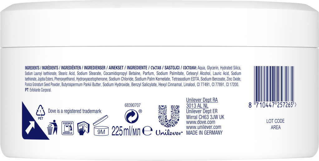 De nye Dove cream shower scrubs bringer nu denne følelse ind i dit badeværelse på ingen tid: De naturbaserede silica-peelingpartikler og jojobavoksperler masserer huden, fjerner blidt døde hudceller og stimulerer samtidig cellefornyelsen - for en strålende smuk teint. Desuden fugter Dove cream shower scrubs huden og tilfører den et hudidentisk næringsstof, så snart de er påført, og modvirker dermed aktivt tør hud. Det efterlader huden fløjlsblød under bruseren.