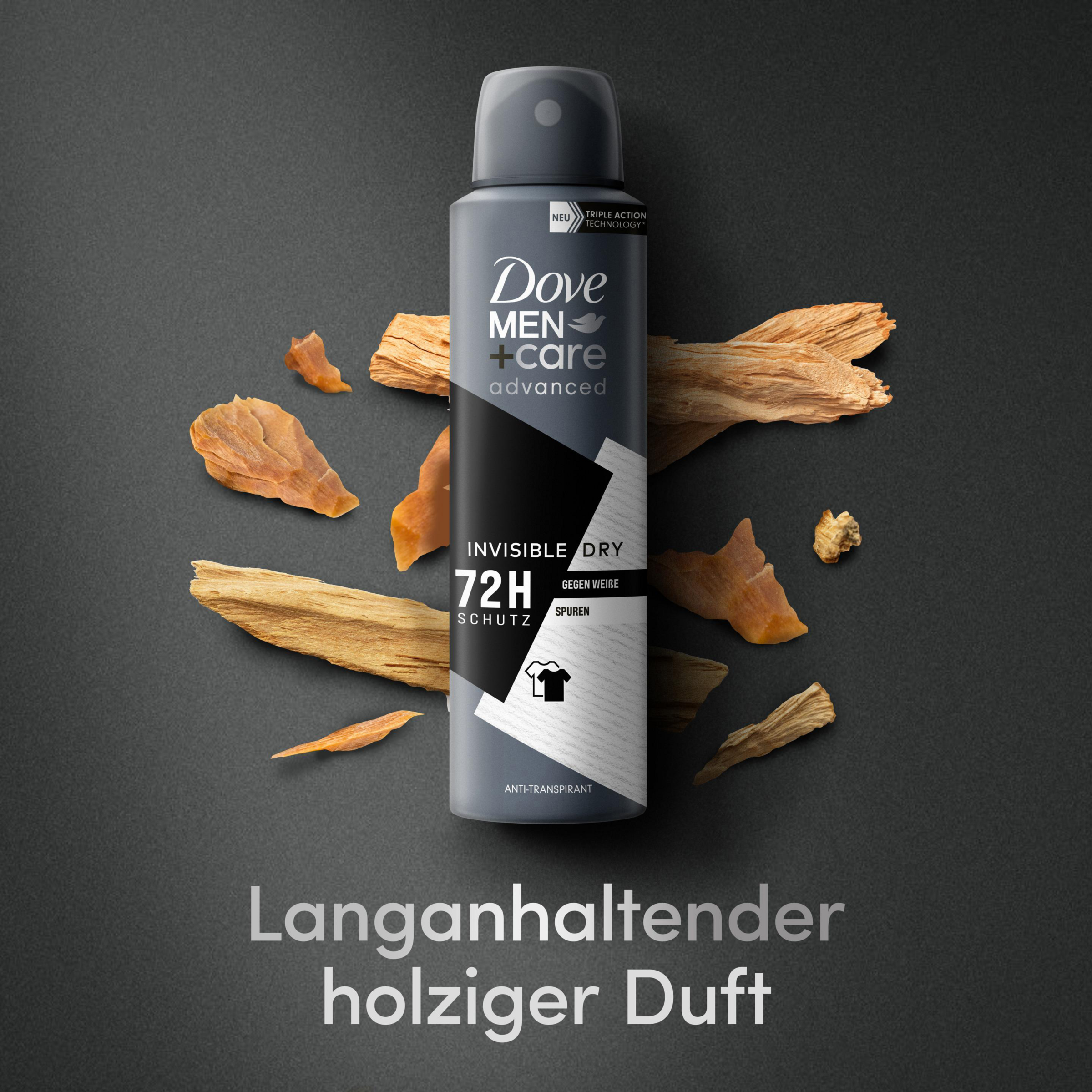 Dove MEN+care Advanced Anti-Perspirant Spray Invisible Dry - effektiv deodorantbeskyttelse, der bekæmper sved og kropslugt i op til 72 timer. Antiperspiranten med ¼ plejecreme beskytter huden mod irritation, er effektiv mod sved og er skånsom mod huden. Deodoranten forkæler også mænd med en diskret maskulin duft. Højdepunktet: Anti-transpirantsprayen Invisible Dry efterlader ingen synlige hvide mærker på tøjet. Brug deo, og forlad derefter huset med det samme – uden at skulle kigge i spejlet igen.