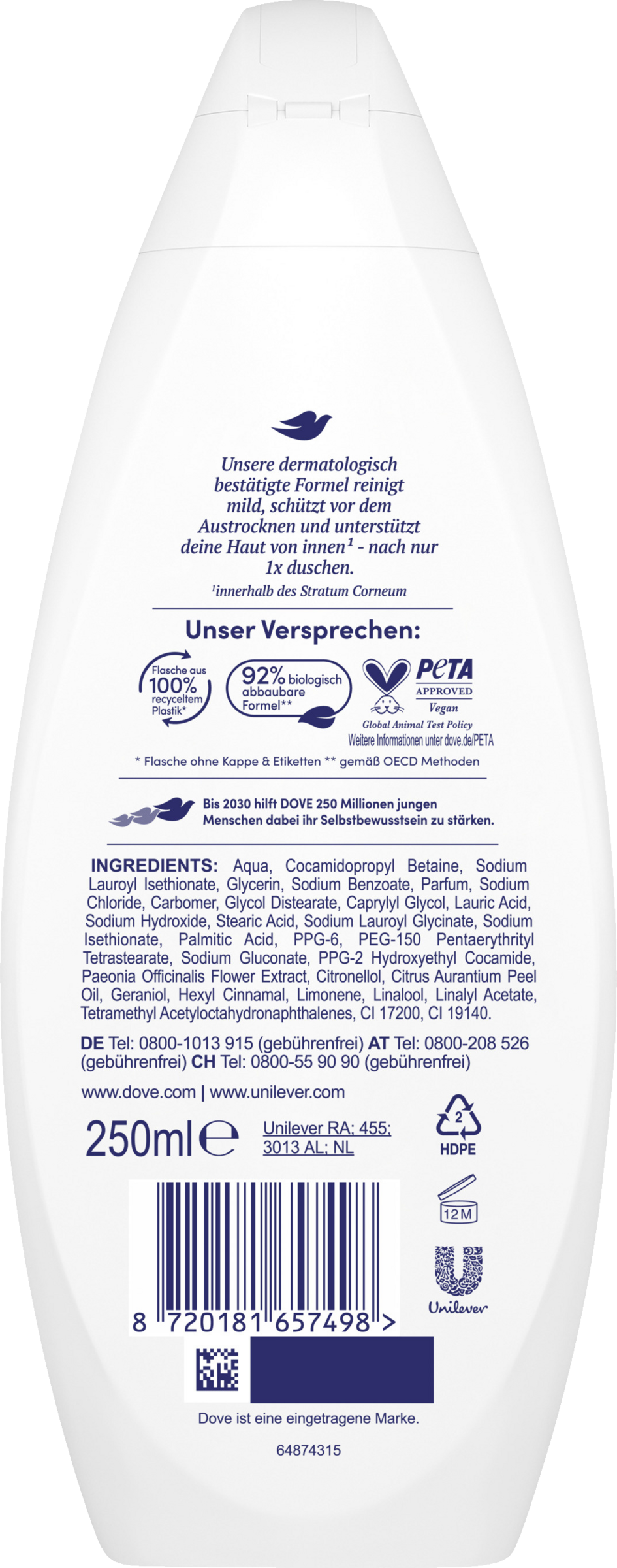 Flasken er fremstillet af 100 % genbrugsplast**. Dove er certificeret af PETA som "cruelty-free", og vores plejeprodukter bærer nu det PETA-godkendte logo. På verdensplan tester Dove ikke på dyr, ikke engang hvor dyreforsøg er obligatoriske.