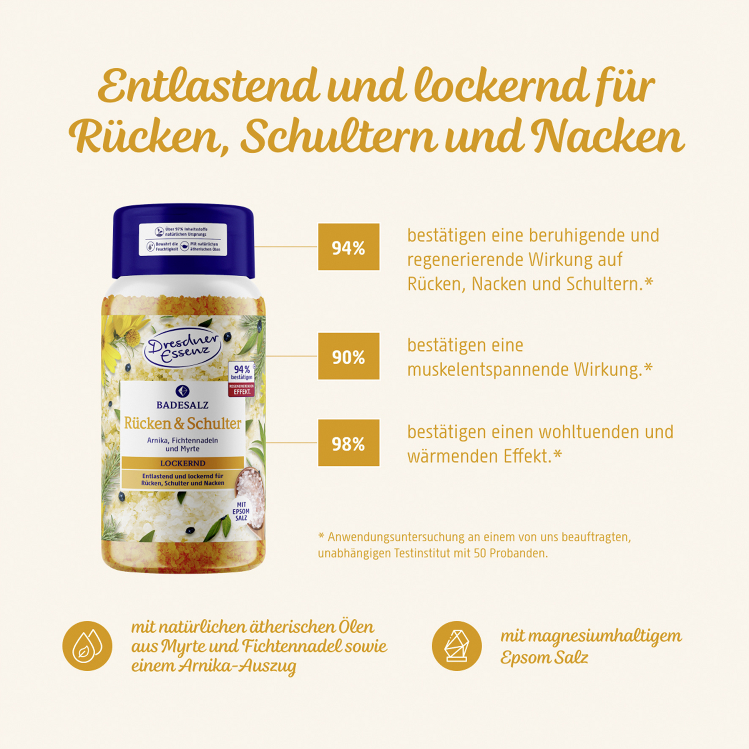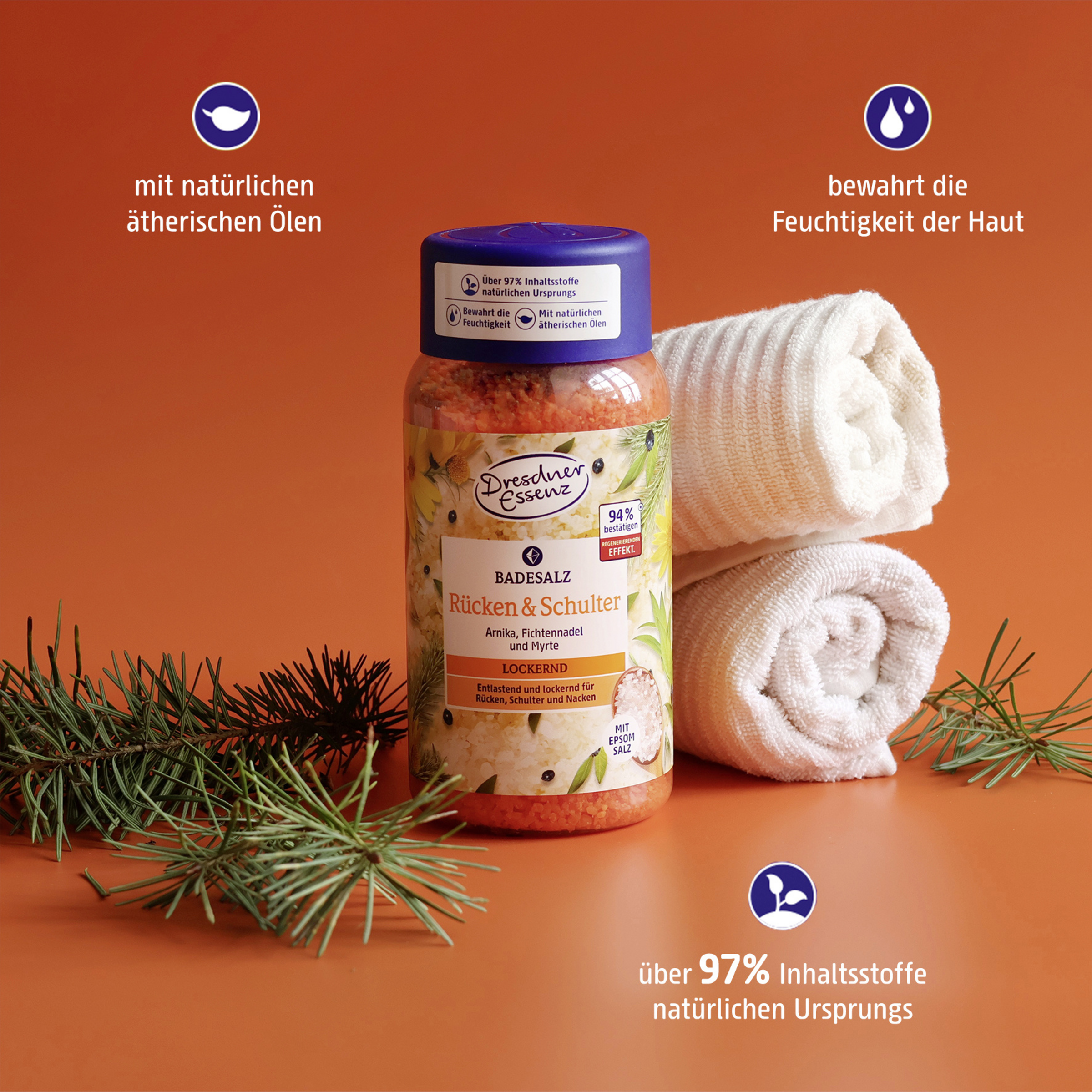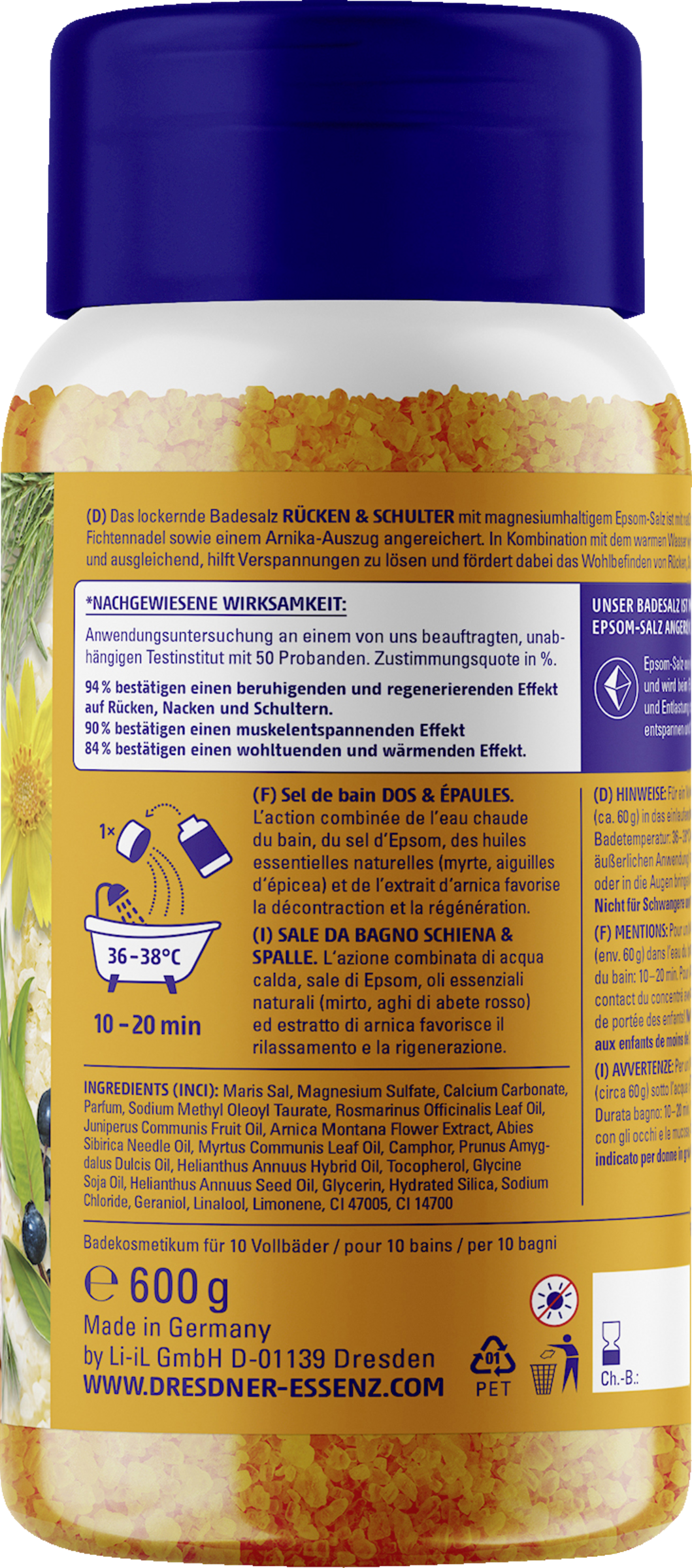 Det løsgørende badesalt BACK & SHOULDERS med magnesiumholdigt Epsom-salt er beriget med naturlige æteriske olier af myrte og grannåle samt et arnica-ekstrakt. I kombination med det varme vand virker badesaltet særligt lindrende og afbalancerende, hjælper med at løsne op for spændinger og fremmer velværet i ryg, skuldre og nakke.