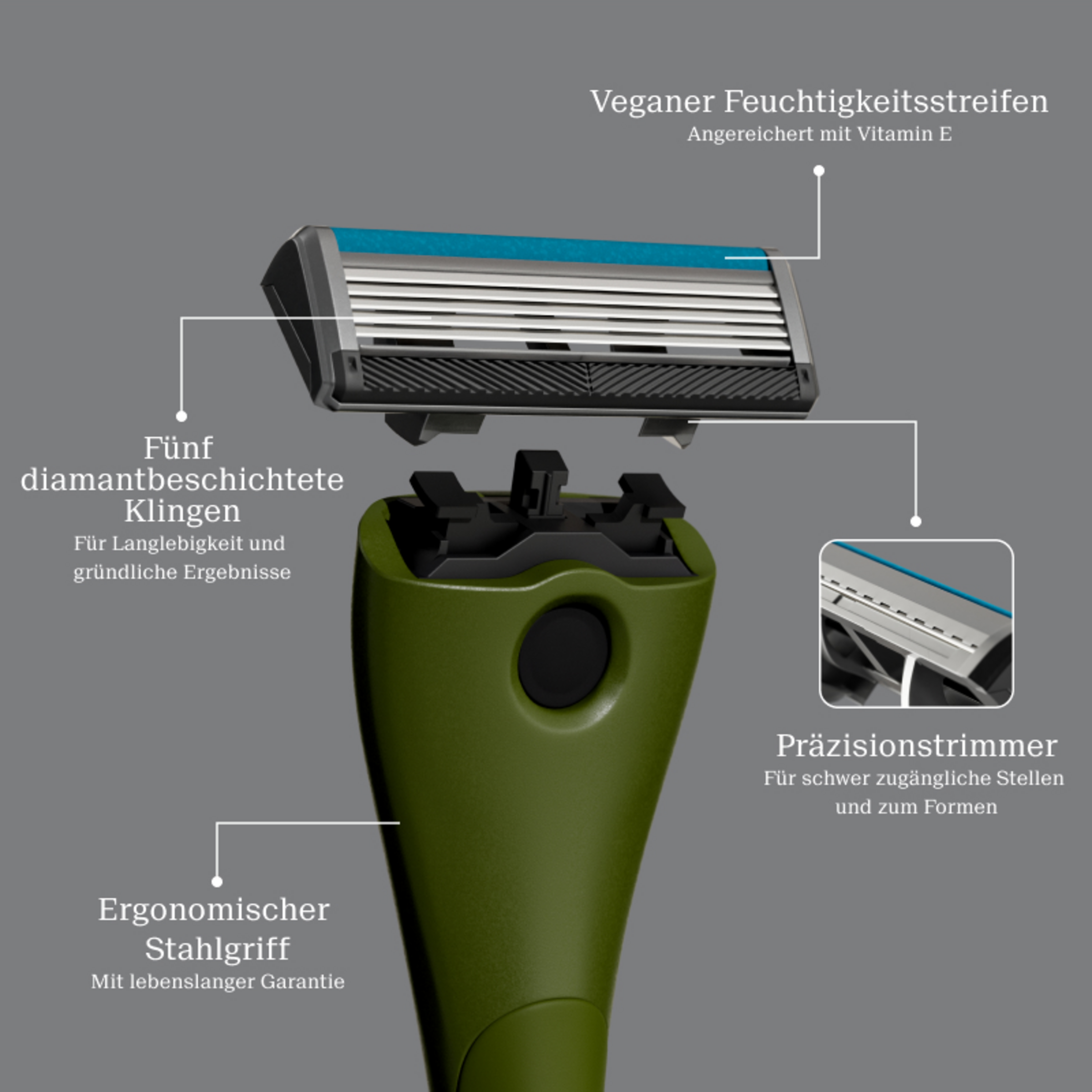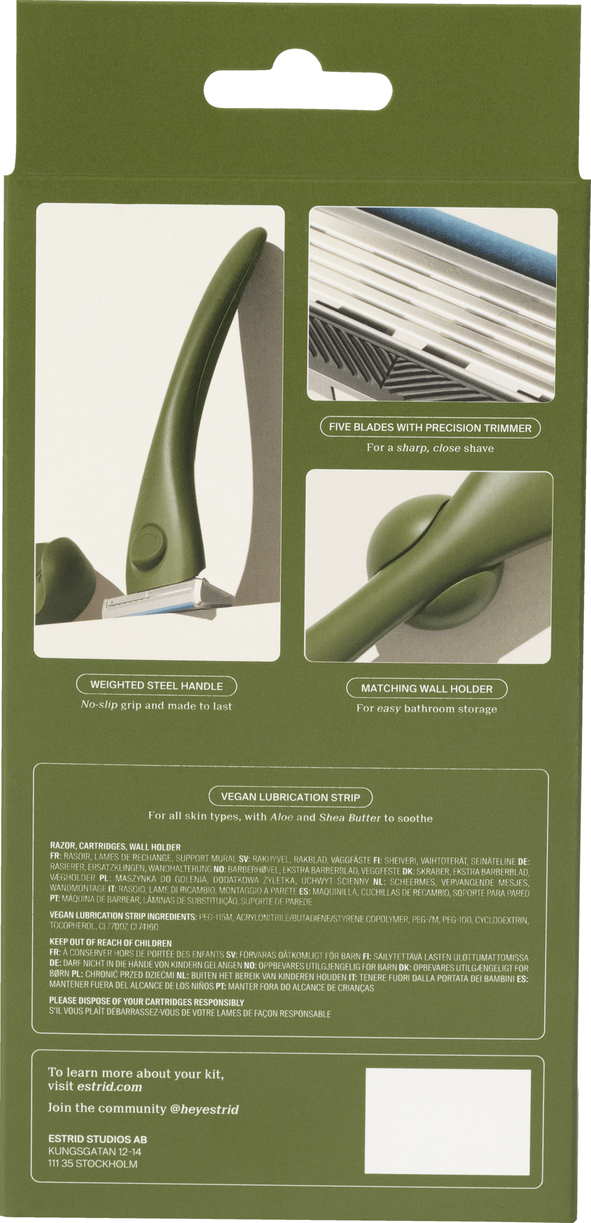 Må vi præsentere: vores prisbelønnede Estrid-barbermaskine - optimeret til ansigtshår. Barbermaskinen, som er dermatologisk anbefalet til følsom hud, imponerer med fem tynde og skarpe blade i rustfrit stål med diamantbelægning, som giver en tæt og behagelig barbering - gang på gang. Barberbladene er omgivet af vores særlige veganske fugtstrimmel med E-vitamin for at beskytte huden, forhindre irritation og sikre et glat glid. Hvert startsæt leveres med et ergonomisk formet stålhåndtag, der giver et sikkert, skridsikkert greb, og et matchende vægbeslag, så du altid har din barbermaskine lige ved hånden.