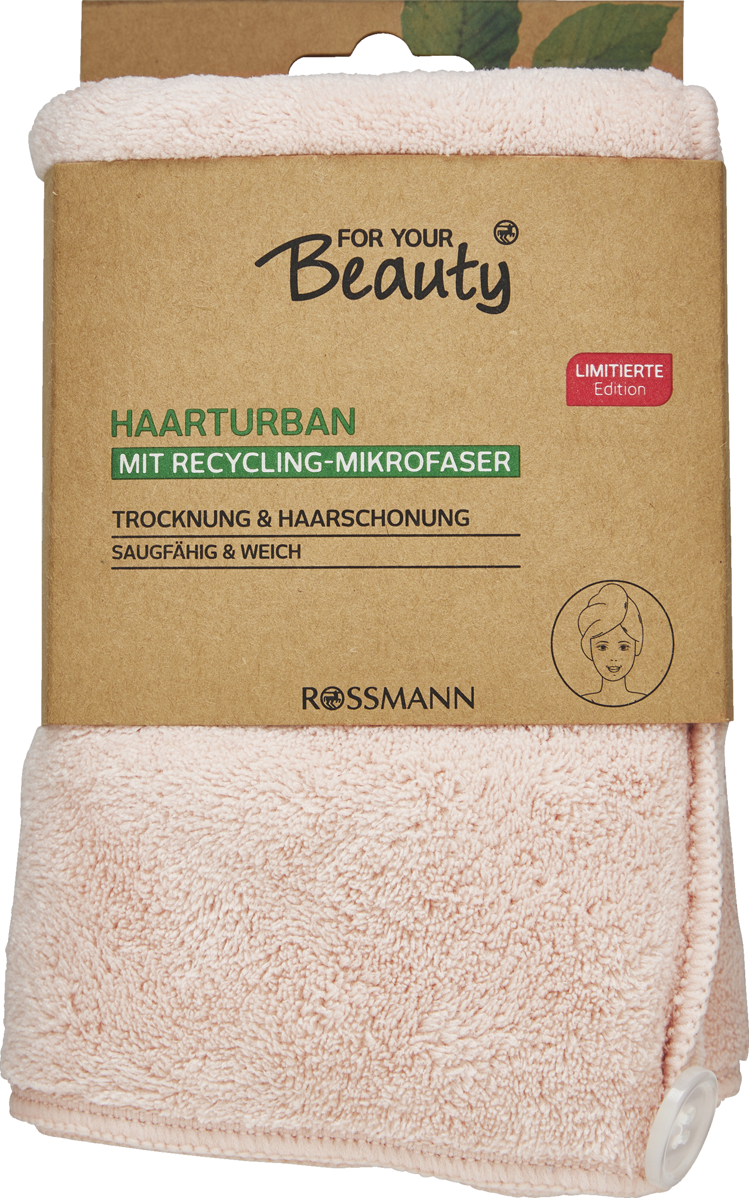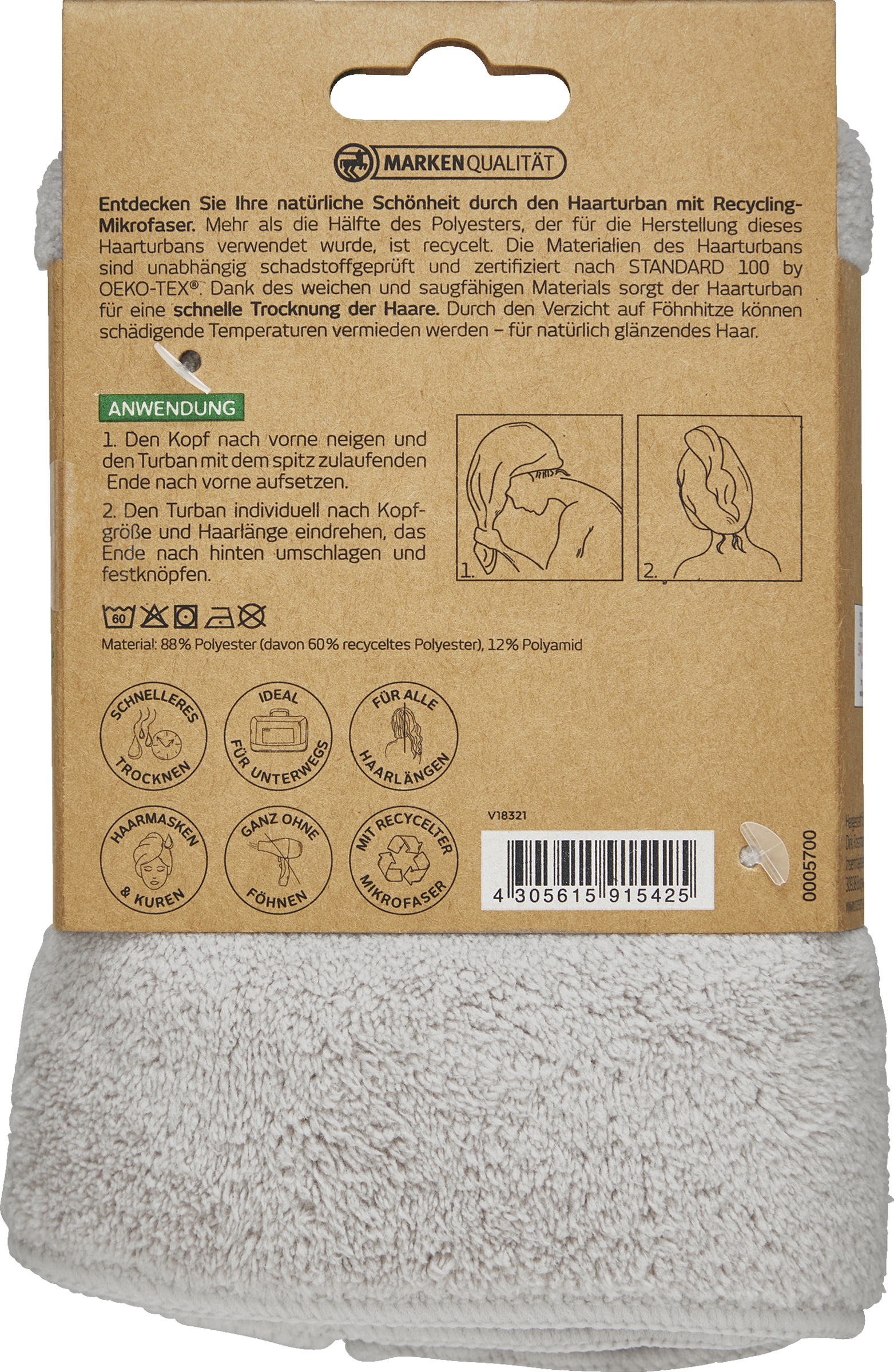 - 2. Drej turbanen individuelt efter hovedstørrelse og hårlængde, fold enden tilbage og knap den på plads.