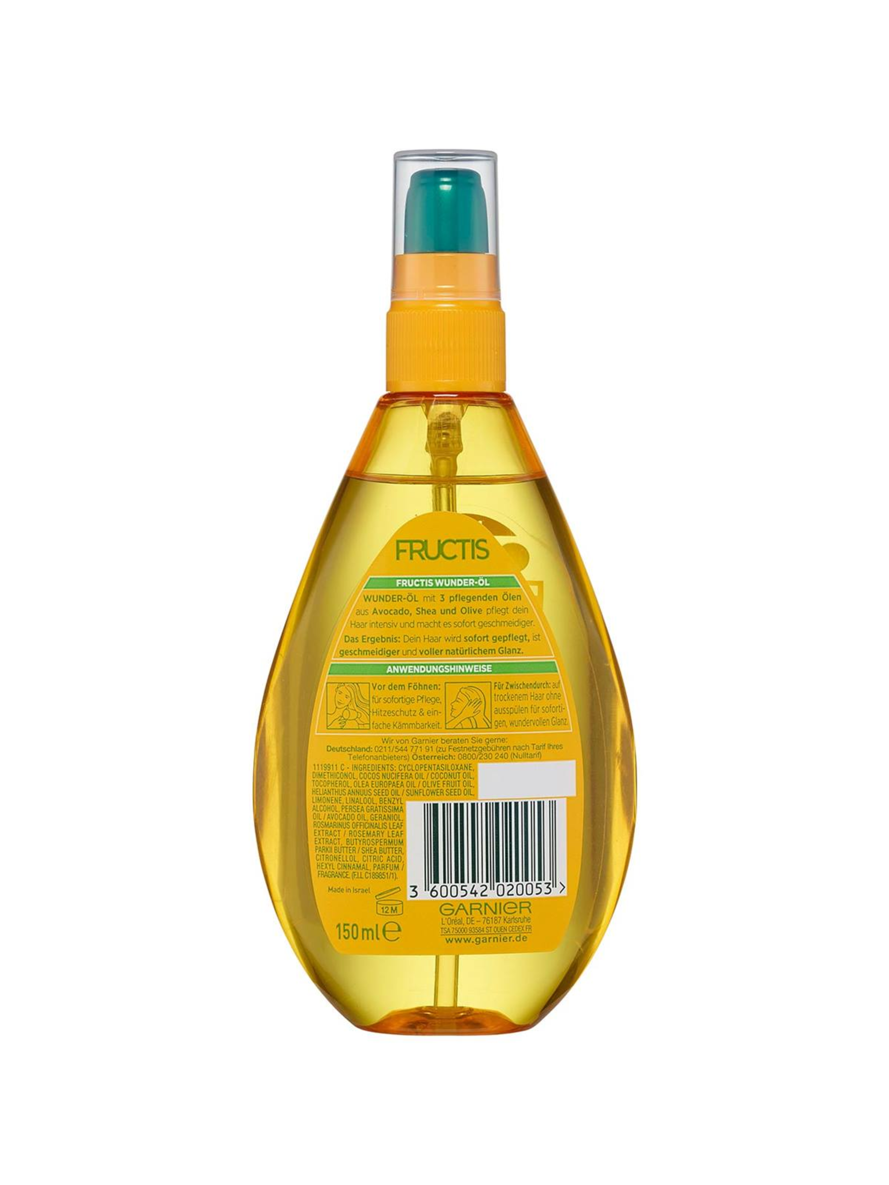 Garnier Fructis mirakelolien, alt-i-én leave-in, er udviklet specielt til behovene i tørt hår. Formlen er beriget med tre rige olier fra avocado, kokos og oliven. De nærer håret intensivt og giver det øjeblikkelig Smidighed og naturlig Glans uden at tynge håret ned. Garnier Fructis Miracle Oil har en ikke-fedtet tekstur. Dette omslutter Hår og udvikler straks sin nærende effekt. Takket være den praktiske pumpesprøjte er Anvendelse nem og hygiejnisk ren.