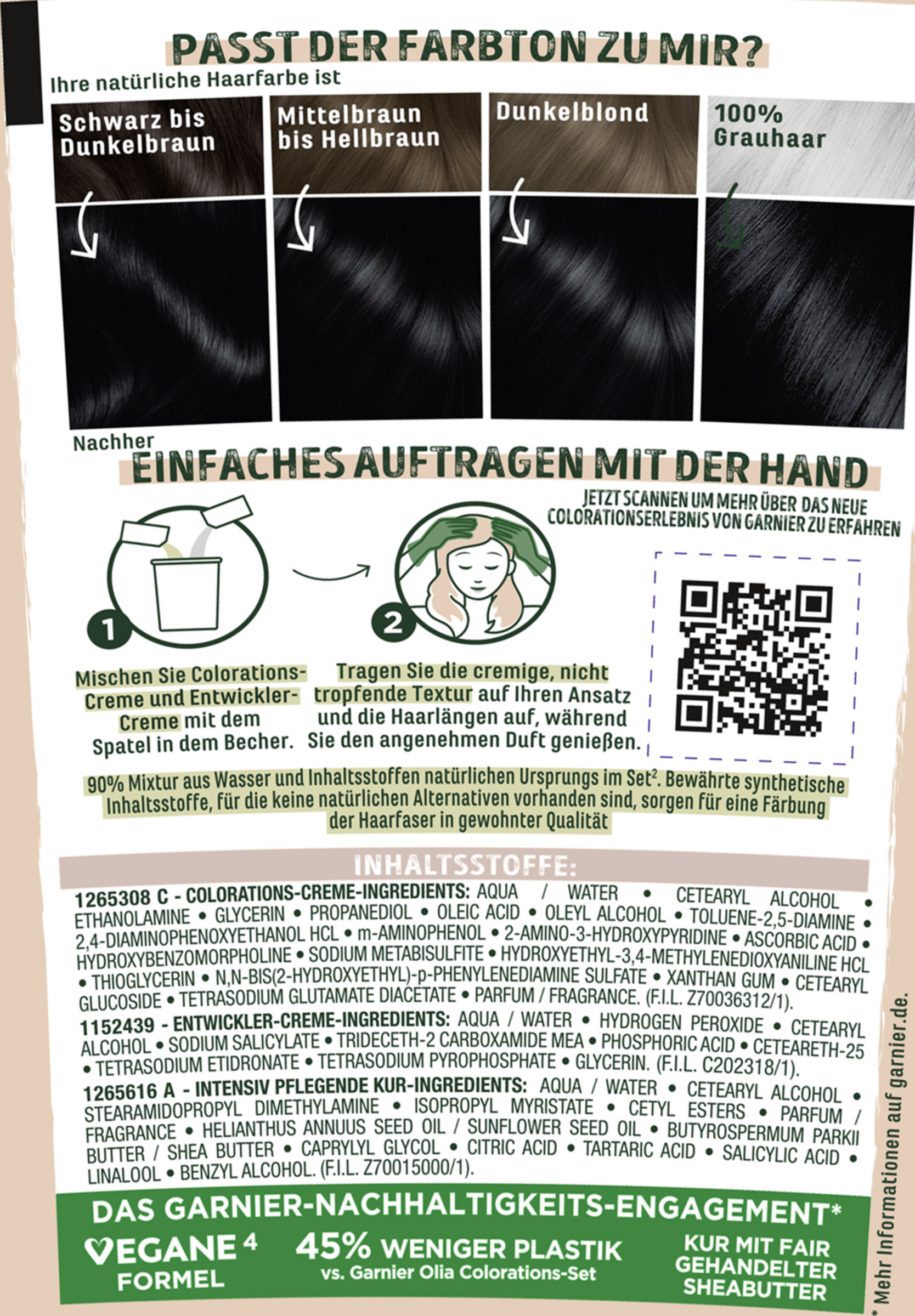 Colorations-Creme: AQUA / WATER • CETEARYL ALCOHOL • ETHANOLAMINE • GLYCERIN • PROPANEDIOL • OLEIC ACID • OLEYL ALCOHOL • TOLUENE-2,5-DIAMINE • 2,4- DIAMINOPHENOXYETHANOL HCL • m-AMINOPHENOL • 2-AMINO-3-HYDROXYPYRIDINE • ASCORBIC ACID • HYDROXYBENZOMORPHOLINE • SODIUM METABISULFITE • HYDROXYETHYL-3,4-METHYLENEDIOXYANILINE HCL • THIOGLYCERIN • N,N-BIS(2-HYDROXYETHYL)-p-PHENYLENEDIAMINE SULFATE • XANTHAN GUM • CETEARYL GLUCOSIDE • TETRASODIUM GLUTAMATE DIACETATE • PARFUM / FRAGRANCE (F.I.L. Z70036312/1).