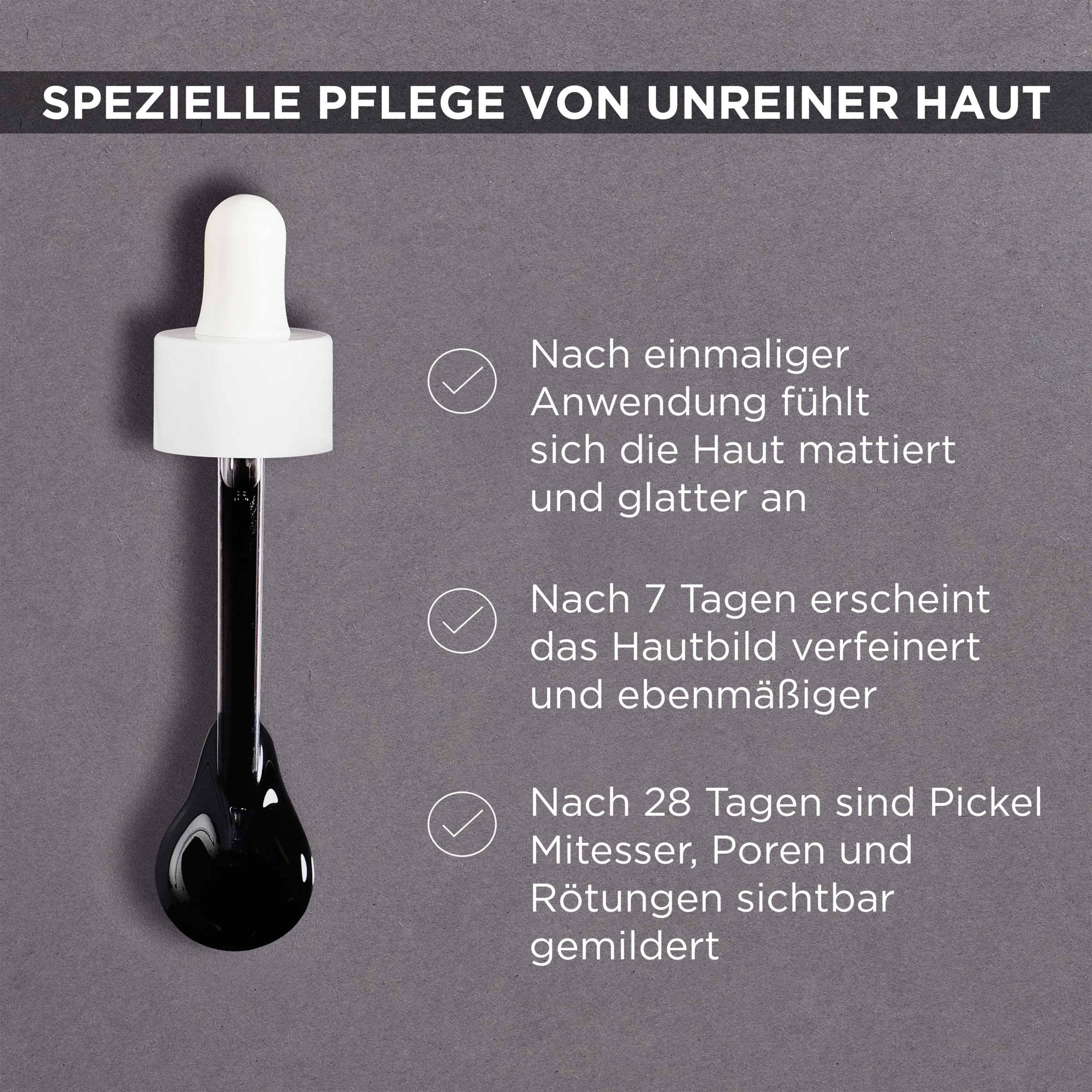 Efter rensning af ansigtet påføres et par dråber af AHA + BHA anti-urenhedsserummet på huden ved hjælp af pipetten. Arbejd derefter forsigtigt plejeproduktet ind i huden, og massér det forsigtigt ind. Serummet kan også anvendes selektivt på de berørte hudområder for en særlig intensiv behandling. Niacinamide Serum kan også integreres i den daglige hudplejerutine morgen og aften.