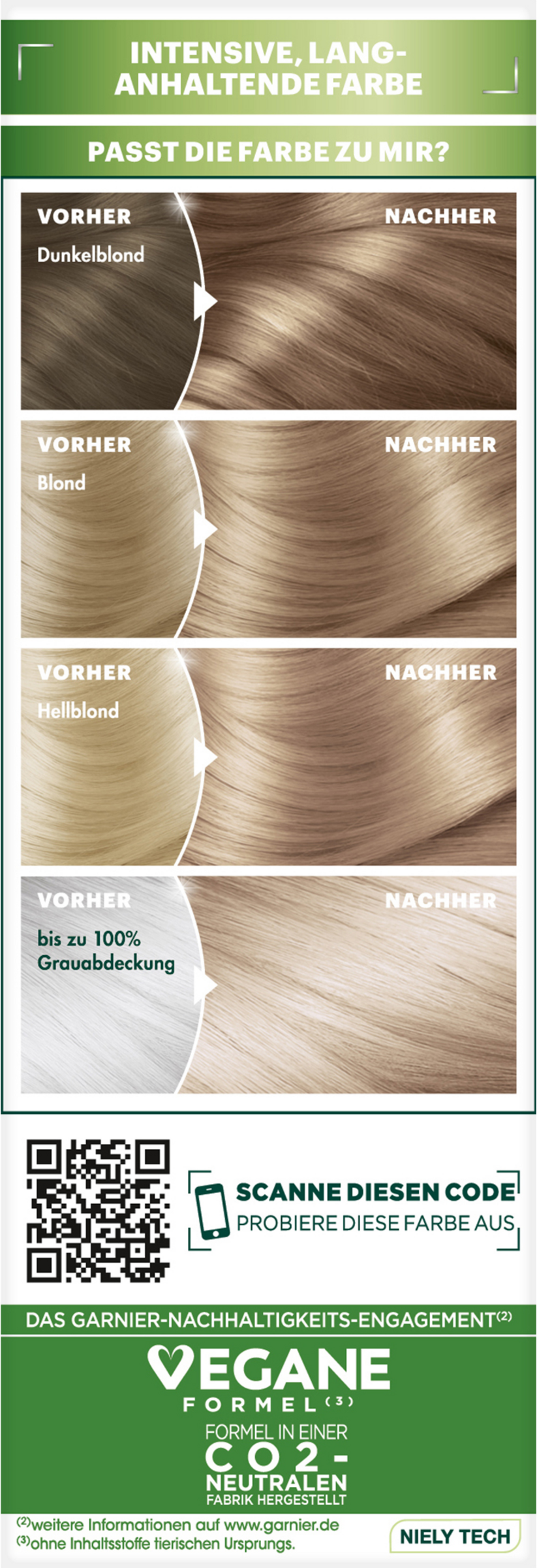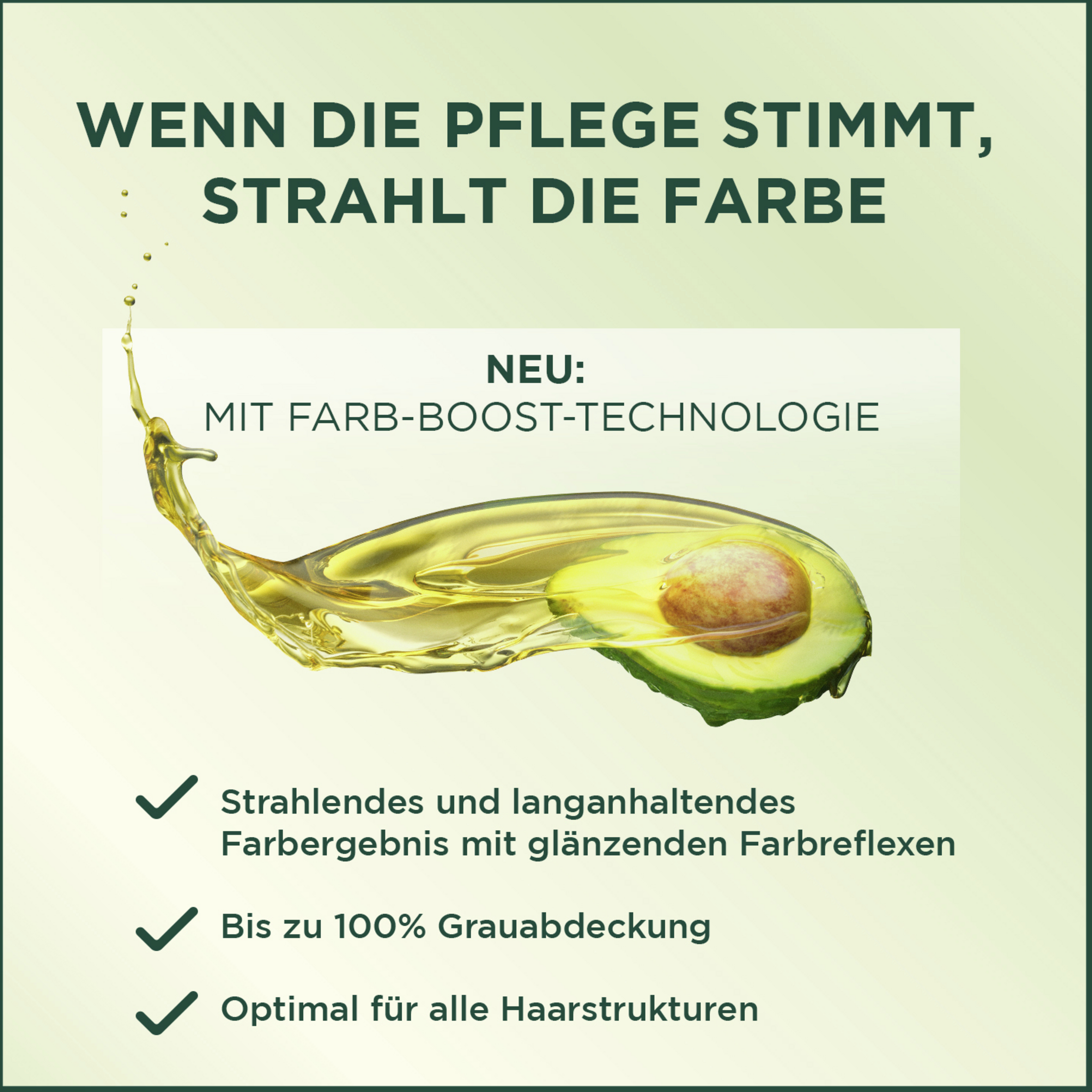 Garnier Nutrisse Creme giver håret en silkeblød, strålende Glans. Endda grå hår bliver dækket 100 %. Resultatet er en Hårfarve med en harmonisk farvegradient, der skinner med intens farve i 8 uger. Særligt behagelig er den enkle anvendelse af farvningen. Takket være creme-strukturen drypper den ikke, og den kan indarbejdes ensartet i håret. Den giver håret intensiv Pleje, fordi formlen er beriget med 5 frugtolier: Oliven, sheanød, avocado, argan og tranebær nærer håret i dybden. Med den frugtagtige duft bliver hårfarvningen til en sensuel oplevelse.