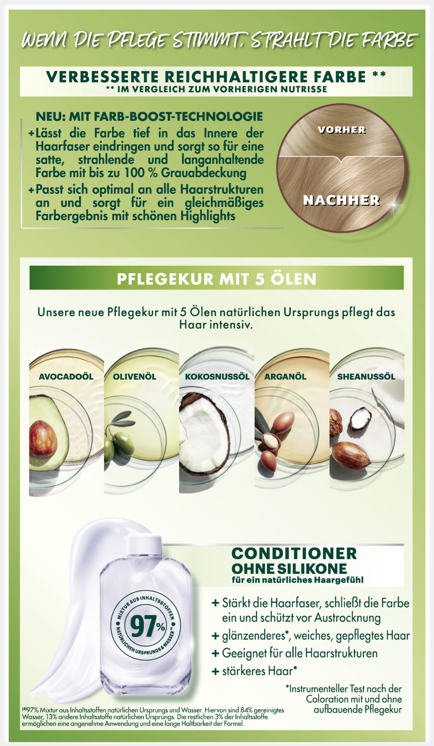 Pflegekur: AQUA / WATER • CETEARYL ALCOHOL • STEARAMIDOPROPYL DIMETHYLAMINE • ISOPROPYL MYRISTATE • CETYL ESTERS • HELIANTHUS ANNUUS SEED OIL / SUNFLOWER SEED OIL • PARFUM / FRAGRANCE • OLEA EUROPAEA FRUIT OIL / OLIVE FRUIT OIL • ARGANIA SPINOSA KERNEL OIL • ROSMARINUS OFFICINALIS LEAF EXTRACT / ROSEMARY LEAF EXTRACT • COCOS NUCIFERA OIL / COCONUT OIL • PERSEA GRATISSIMA OIL / AVOCADO OIL • BUTYROSPERMUM PARKII BUTTER / SHEA BUTTER • CAPRYLYL GLYCOL • CITRIC ACID • TARTARIC ACID • TOCOPHEROL • SALICYLIC ACID • LINALOOL • BENZYL ALCOHOL (F.I.L. Z289718/1).
