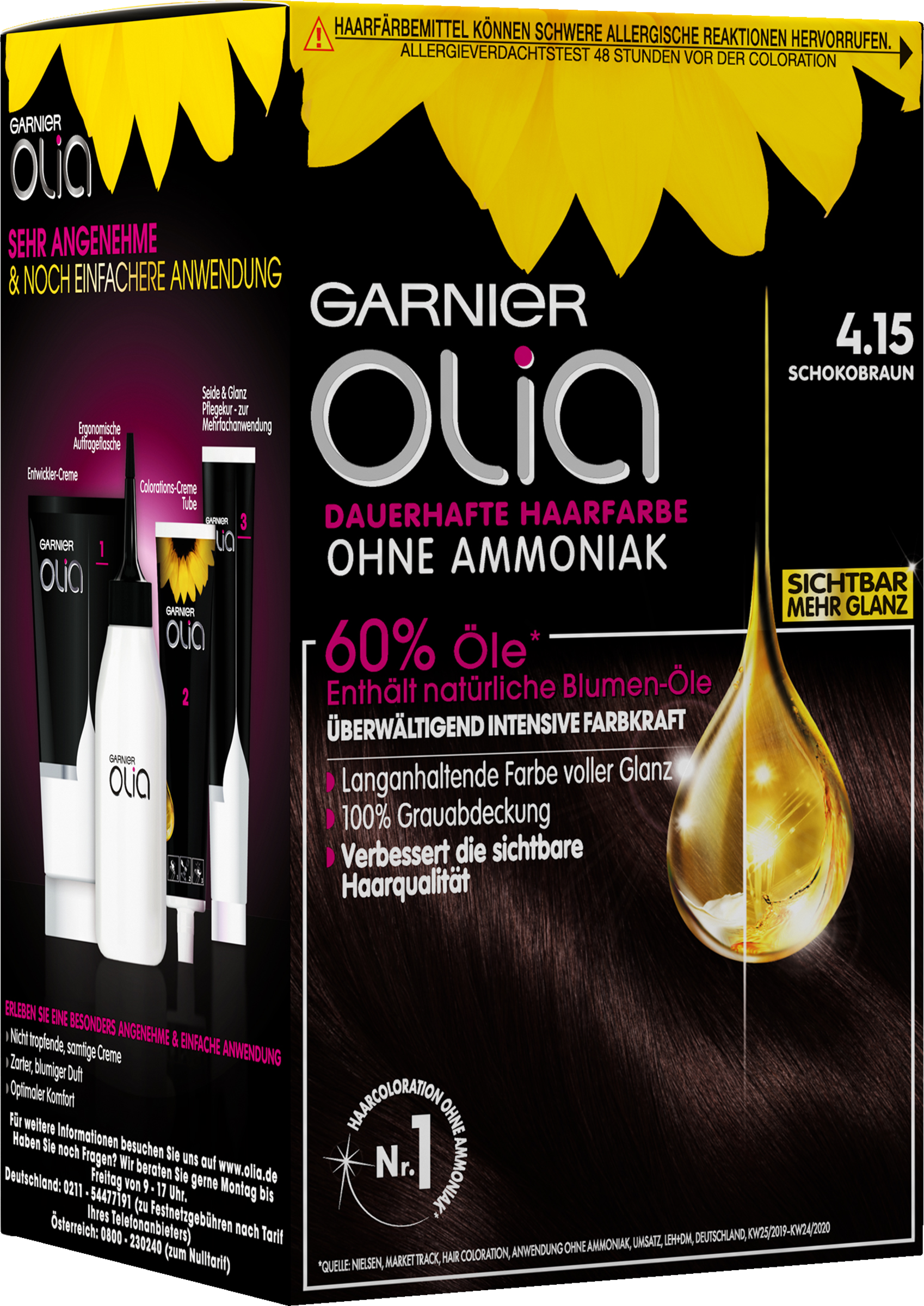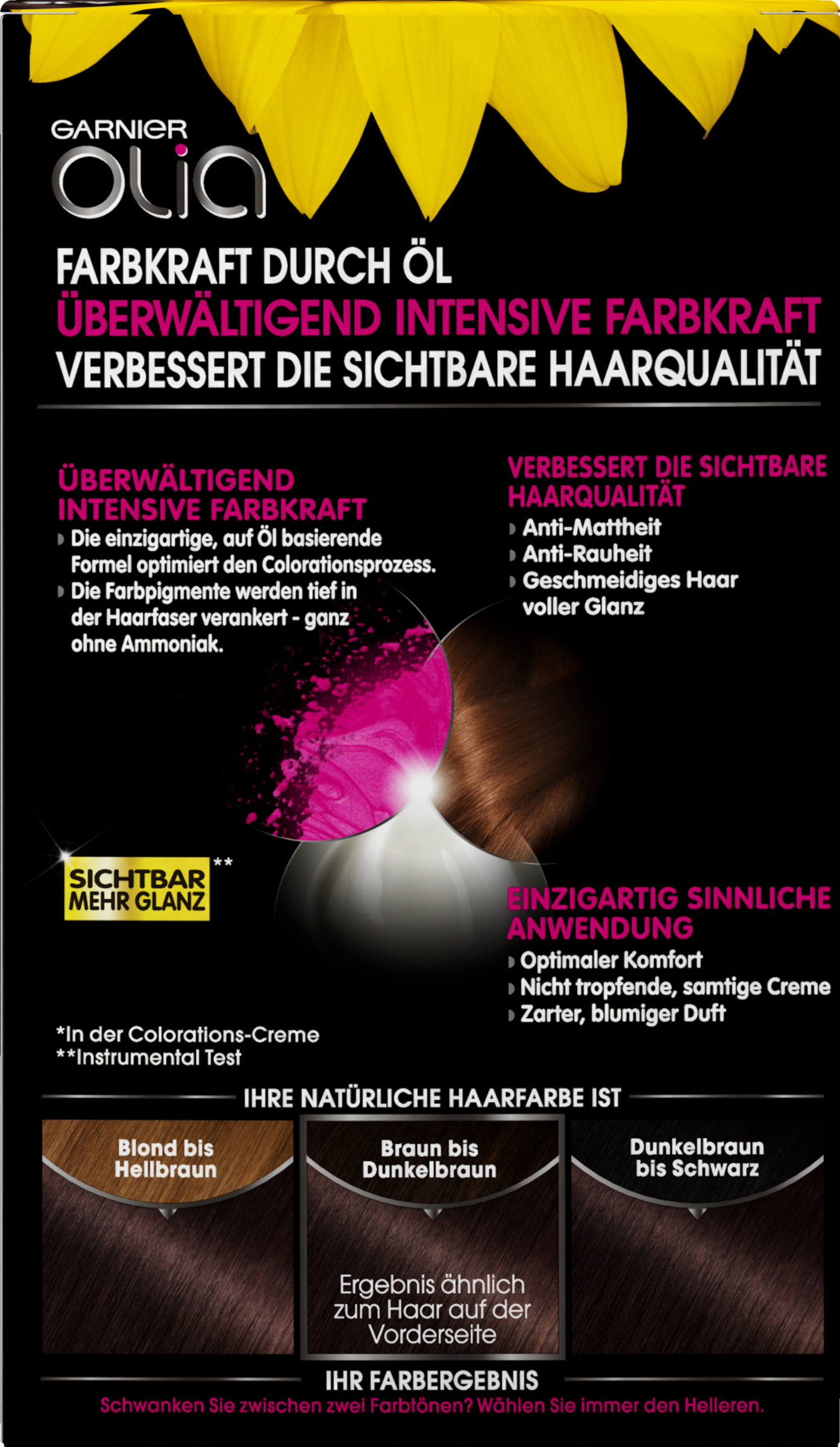 I modsætning til klassiske farvninger optimeres Olias farvningsproces af 60 % olier*. Uden Ammoniak giver denne langvarige farvning en overvældende intensiv farvekraft og forbedrer den synlige hårkvalitet.