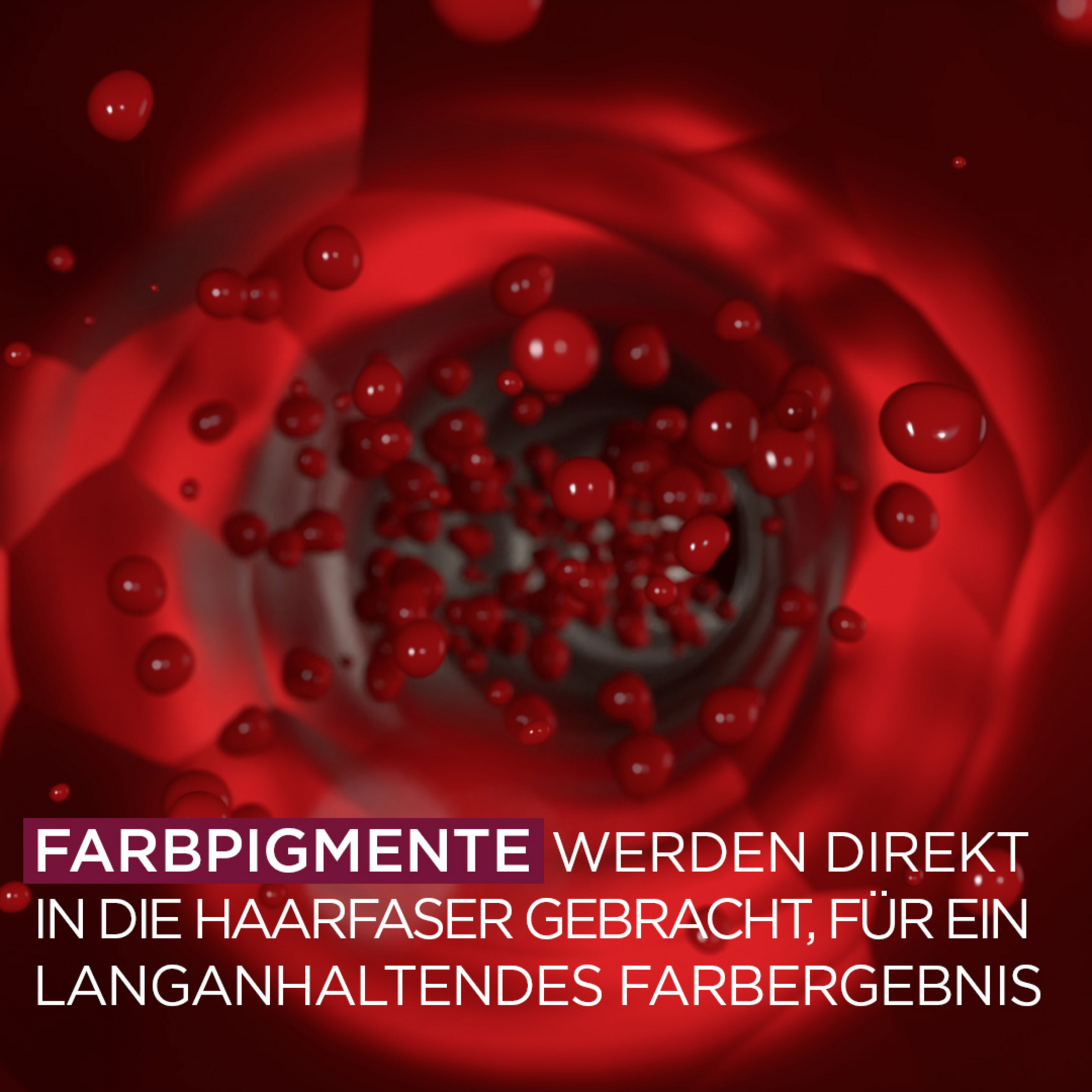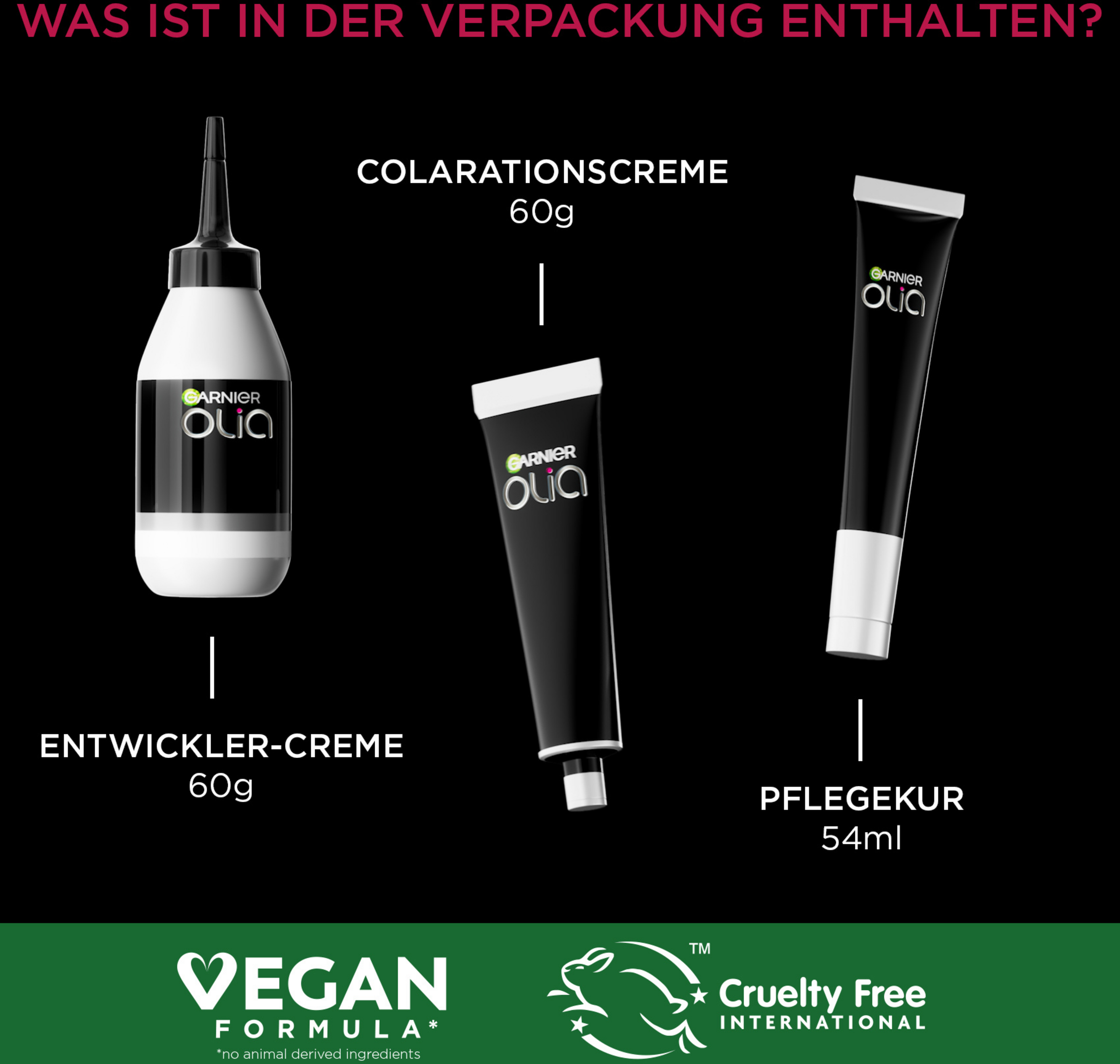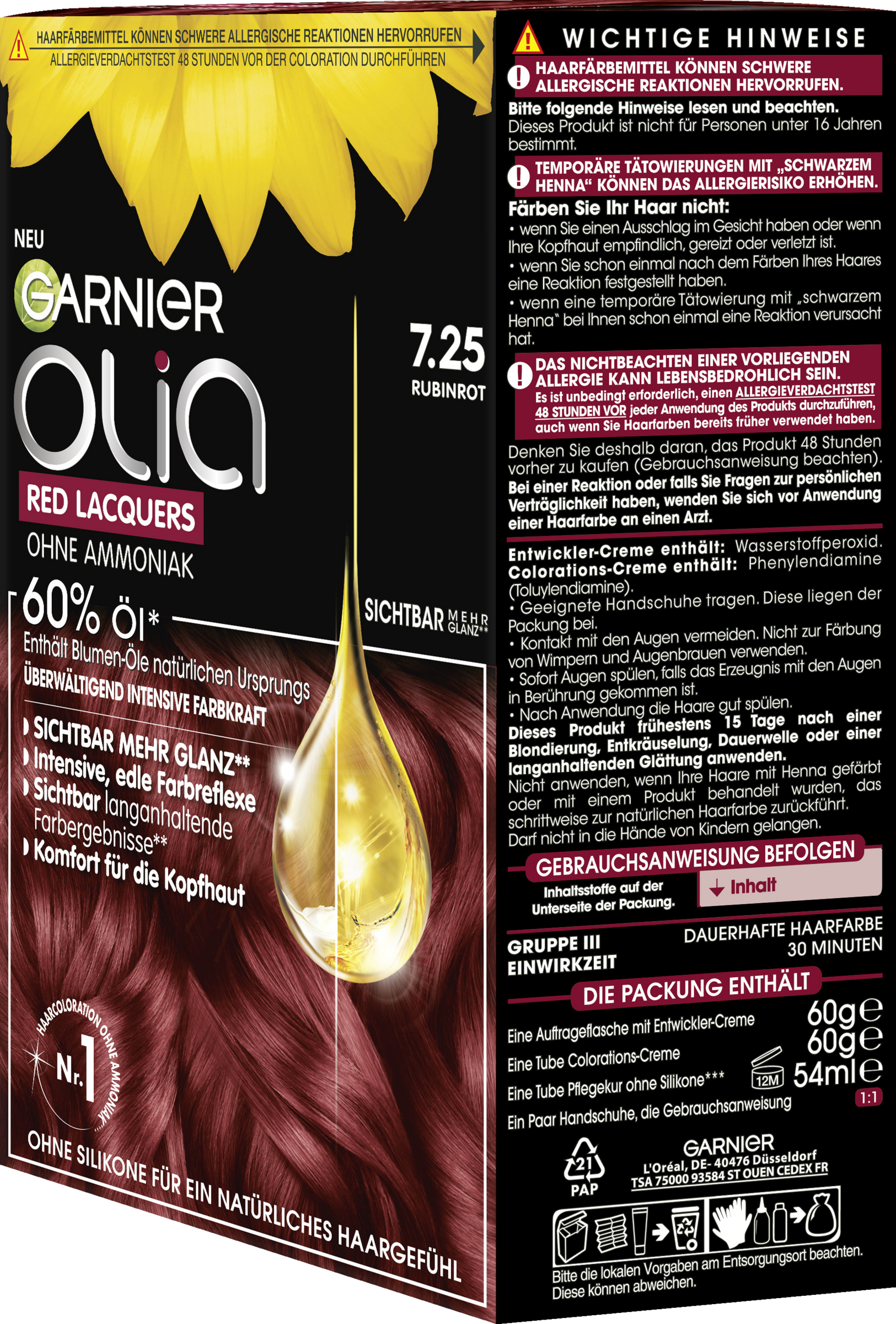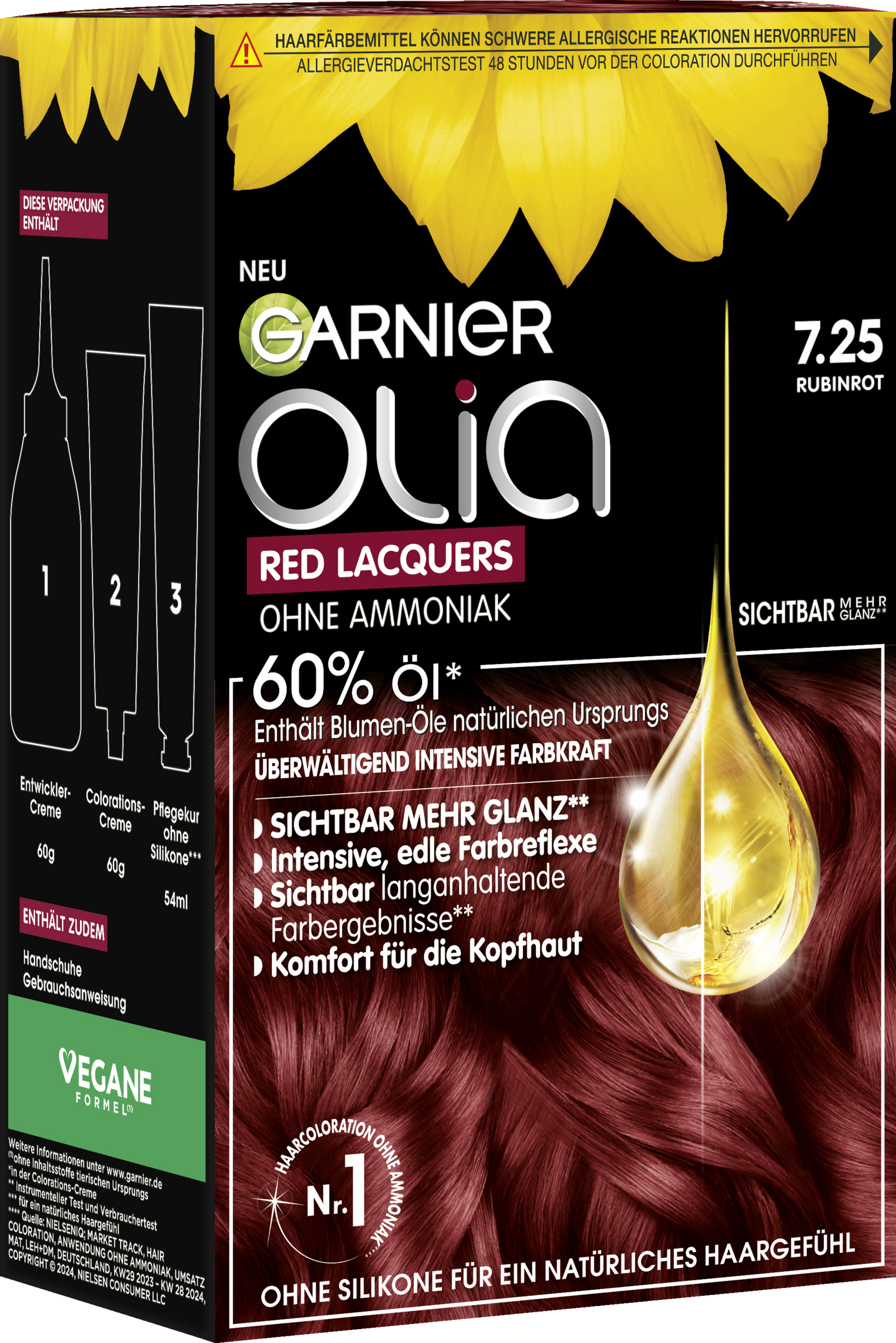 Olia Red Lacquers Permanent Hair Colour i 7.25 Ruby Red fra Garnier giver håret en overvældende intens farve. For at opnå dette indeholder farven en 60% olieformel med blomsterolier af naturlig oprindelse, som optimerer farveprocessen. På den måde føres de permanente farvepigmenter i formlen direkte ind i hårfibrene, hvor de sikrer en mere levende og stærkere rubinrød. Resultatet er intense, sofistikerede farvereflekser samt et langtidsholdbart farveresultat og en særlig farveekspertise, der giver synligt mere glans. Derudover giver den veganske formel uden silikoner og ammoniak særlig komfort for hovedbunden og giver håret en naturlig fornemmelse.