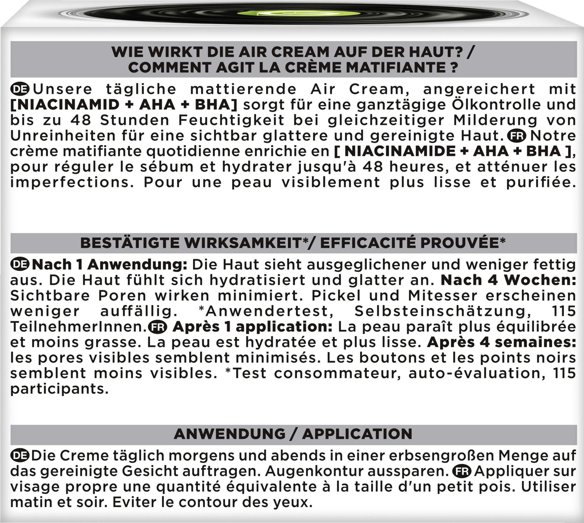 Daily Mattifying Air Cream beriget med [Niacinamid + AHA + BHA] giver oliekontrol hele dagen og op til 48 timers hydrering, mens den blødgør urenheder for en synligt glattere og renset hud.