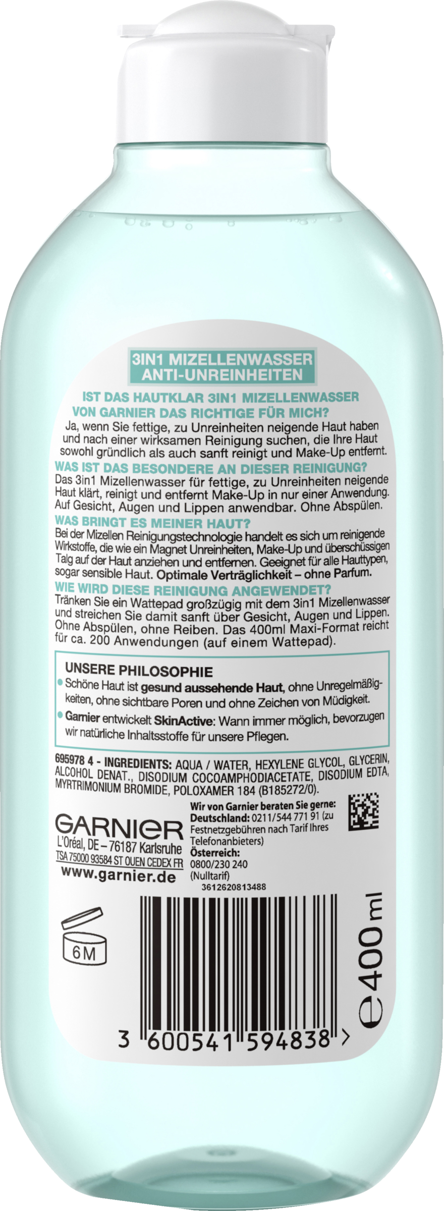 Fugt en vatrondel rigeligt med 3-i-1 micellevand, og stryg den blidt hen over ansigt, øjne og læber. Uden skylning, uden gnidning. 400 ml maxi-formatet er tilstrækkeligt til ca. 200 anvendelser (på vatrondeller).