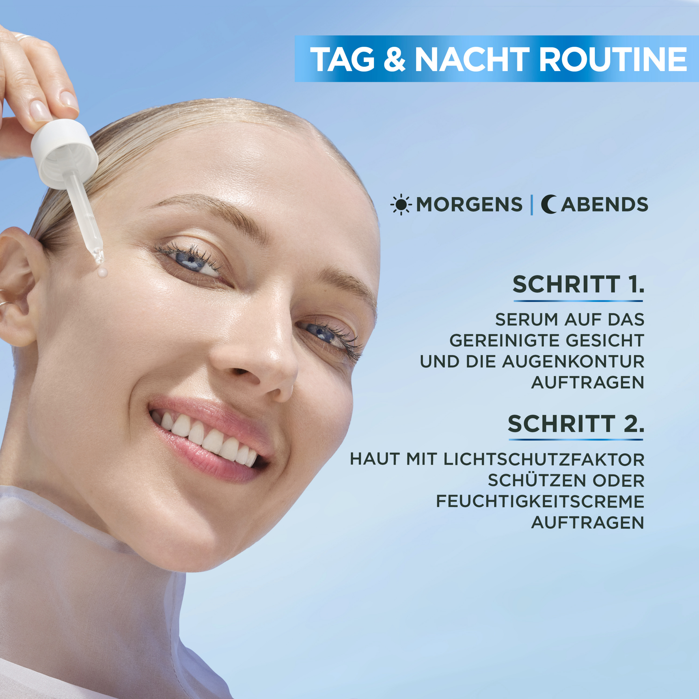 Påfør en fuld pipette af Garnier SkinActive Hyaluron Aloe Serum morgen og aften før dag- eller Natcreme . Masser blidt den lette tekstur ind på det rensede Ansigt og øjenkonturer. Aloe vera-serumet absorberes hurtigt og klistrer ikke.