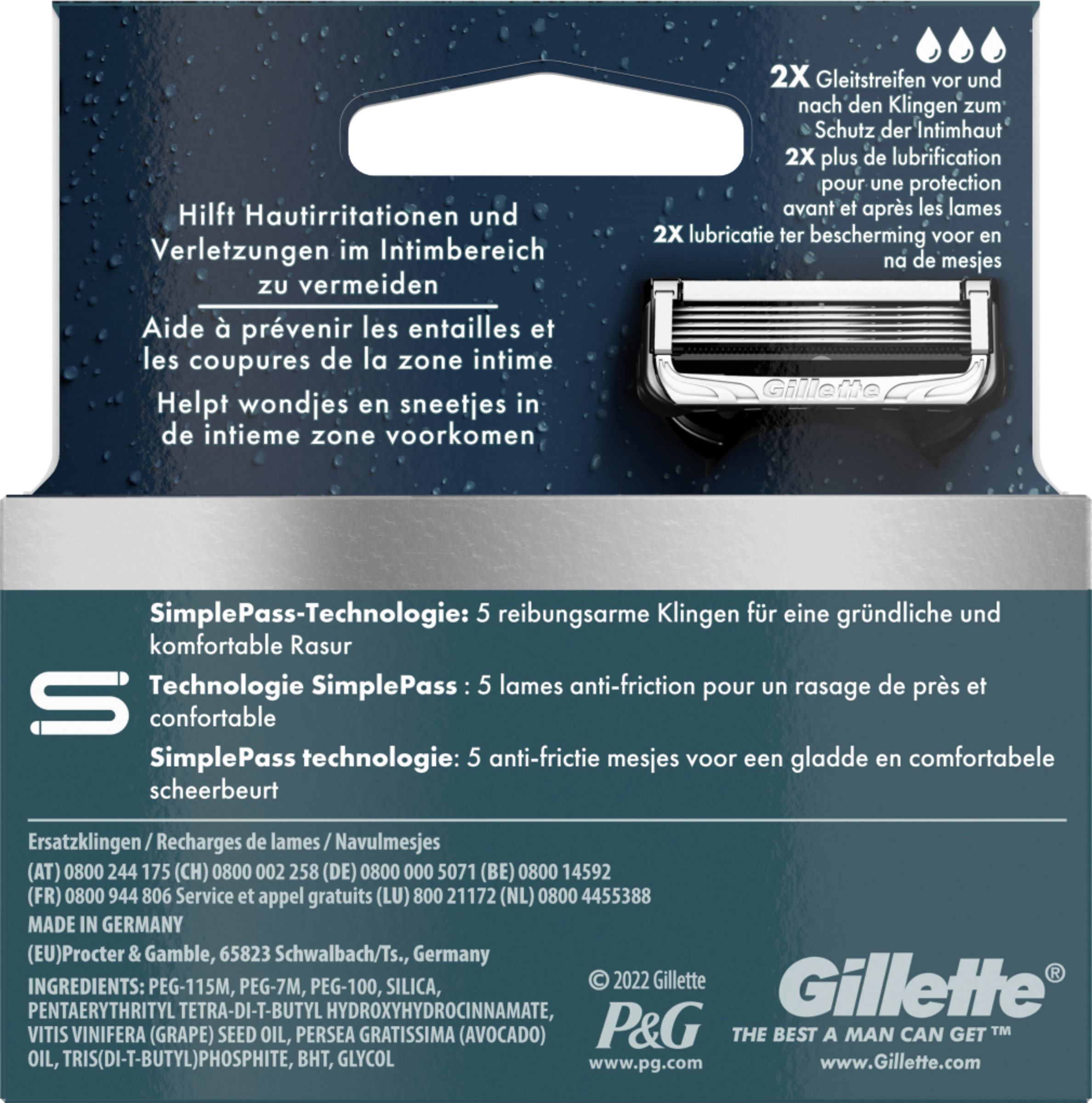 Gillette Intimate barbermaskine blade er udviklet til en skånsom barbering i intimområdet og hjælper med at beskytte din hud mod irritation. SimplePass™-teknologien med 5 skarpe anti-irritationsblade sikrer en skånsom og behagelig barbering i det følsomme intimområde. Bladene er dermatologisk testet og giver ekstra glid og komfort takket være glidestrimlerne før og efter bladene. Brug hele Gillettes intimplejeserie til forberedelse, beskyttelse mod hudirritation og pleje af dit intime område.