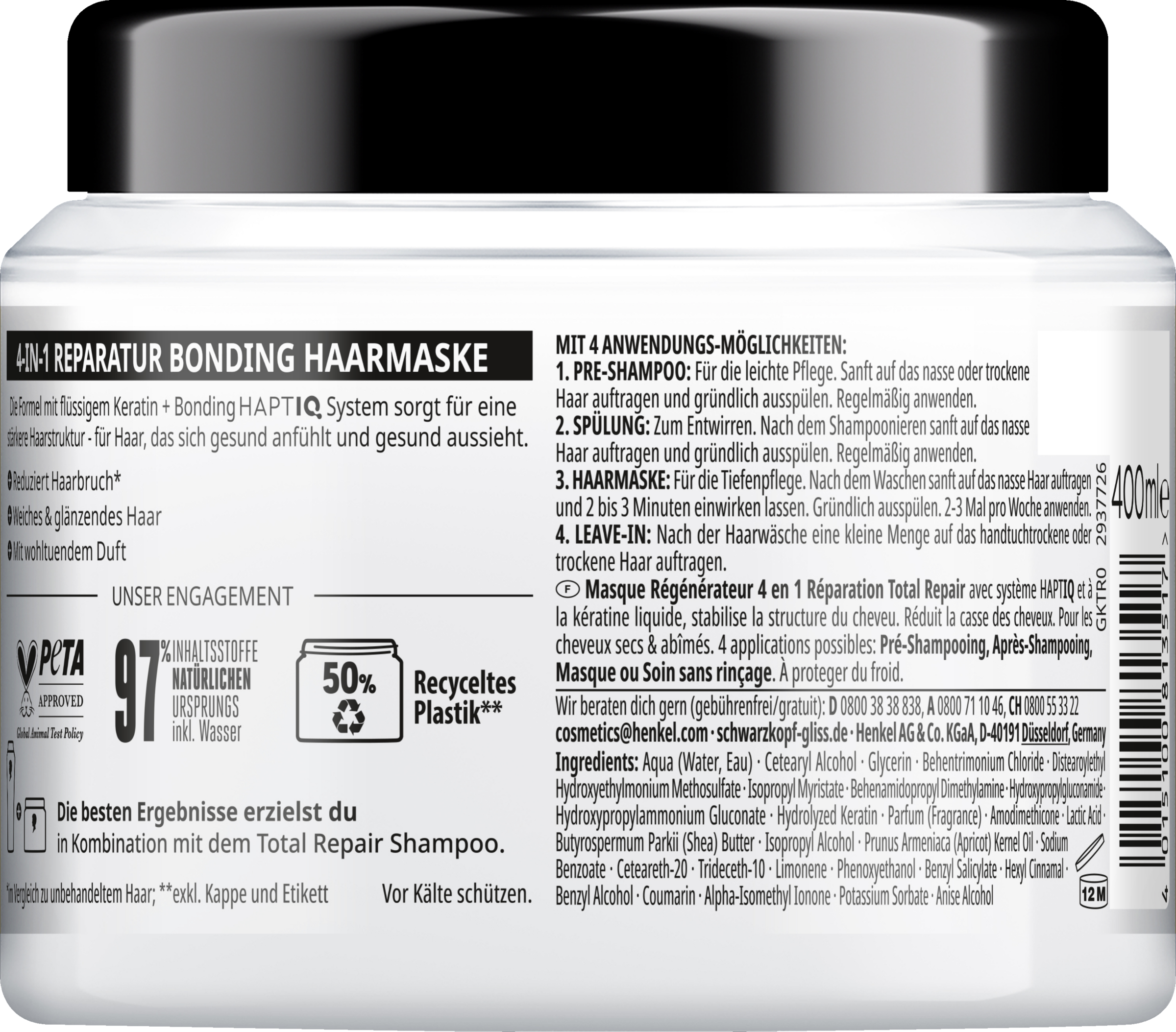 En kombination af aktive ingredienser af høj kvalitet og naturlige essenser er grundlaget for alle Gliss formler. De er tilpasset efter hårets særlige behov og sørger for reparation og en synligt forbedret hårkvalitet. Ingredienser er 97 % naturlig², den er PETA³-certificeret , og flaskekroppen er lavet af 50 % genbrugsplast⁴.