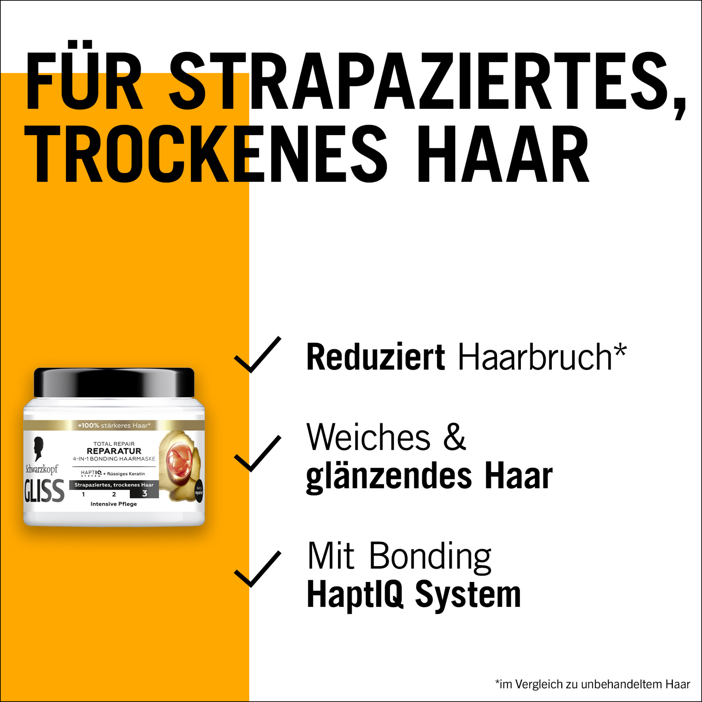 Vores Hår udsættes for stress hver dag. Det gør det tørt og belastet, og der kan derfor opstå hårbrud. Hår, der er belastet på denne måde, kræver en effektiv reparation samt udglatning af hårets overflade. Med HAPTIQ-systemet og flydende keratin beskytter Gliss hårmasken til tørt hår hårfibrene og forskønner hårets struktur. Keratin- Hårkur sikrer også mindre hårbrud¹. Dette gør håret mærkbart glat og giver det en naturlig Glans. Hårkur giver styrkende Pleje før, under og efter Shampoo.
