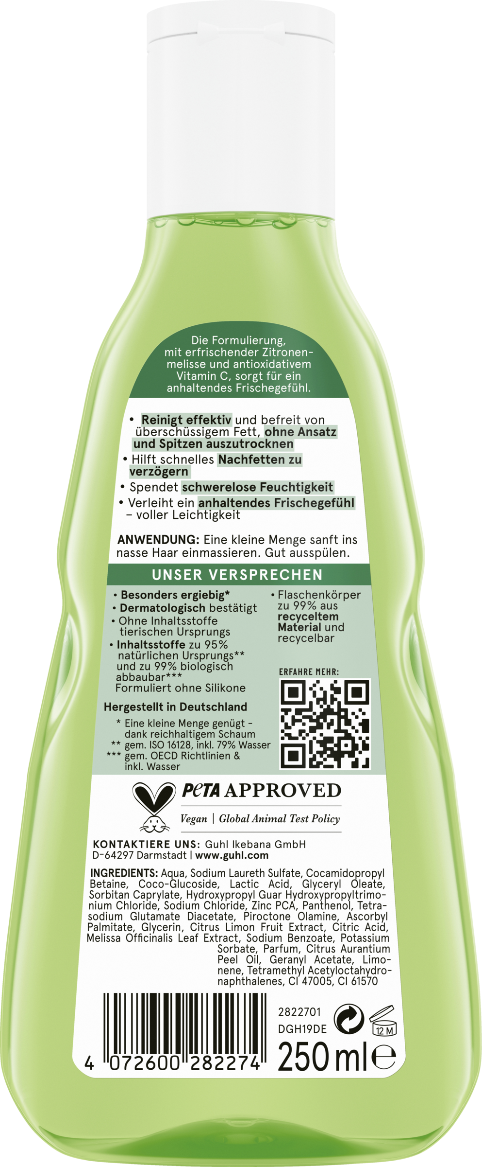 Guhls shampooer imponerer med deres kvalitet. Formuleringerne er skånsomme mod hovedbunden, dermatologisk godkendte og særligt økonomiske - takket være det fyldige, silkebløde skum. Ingredienserne i Freshness & Lightness Shampoo er 95 % naturlige* og 99 % biologisk nedbrydelige **. Silikoner og animalske ingredienser er helt undgået i formuleringerne. Guhl fremstiller sine shampooer i Tyskland og sørger også for, at 99 % af flaskerne er lavet af genbrugsmateriale og selv kan genbruges. Det er Guhls løfte til verden.